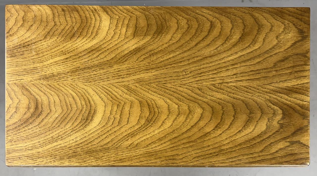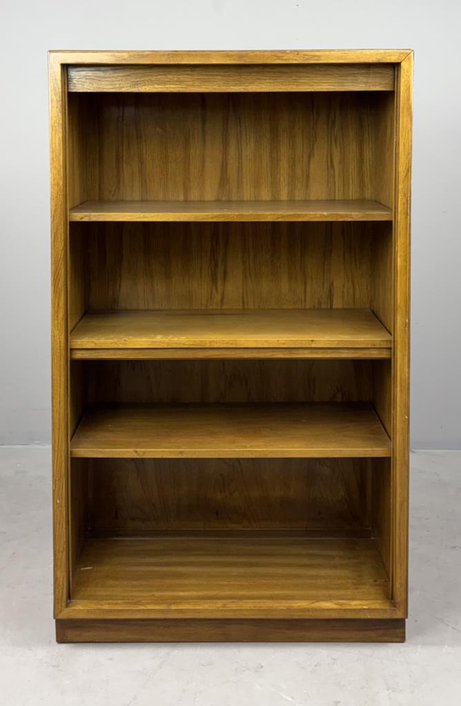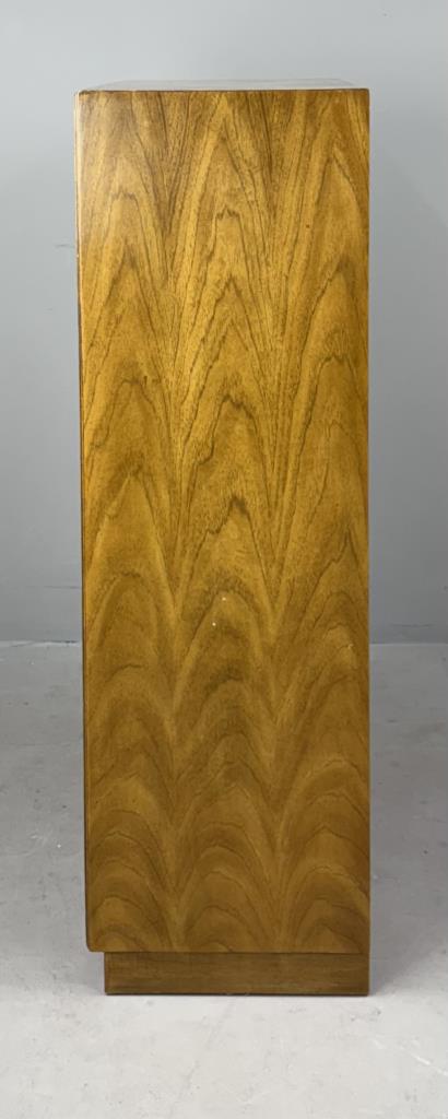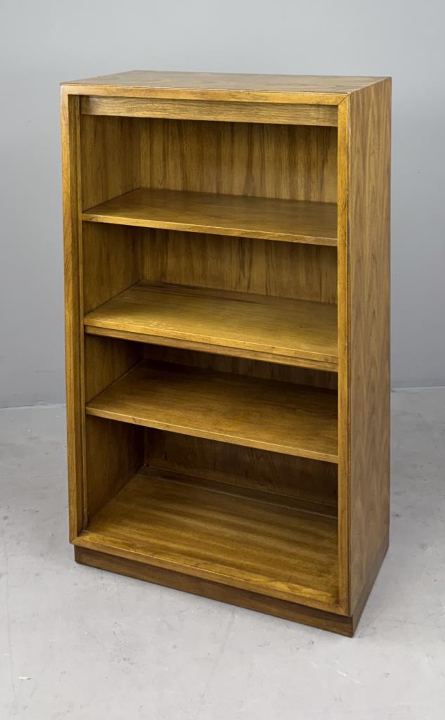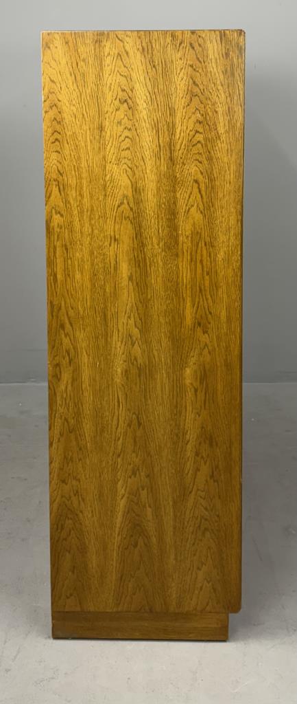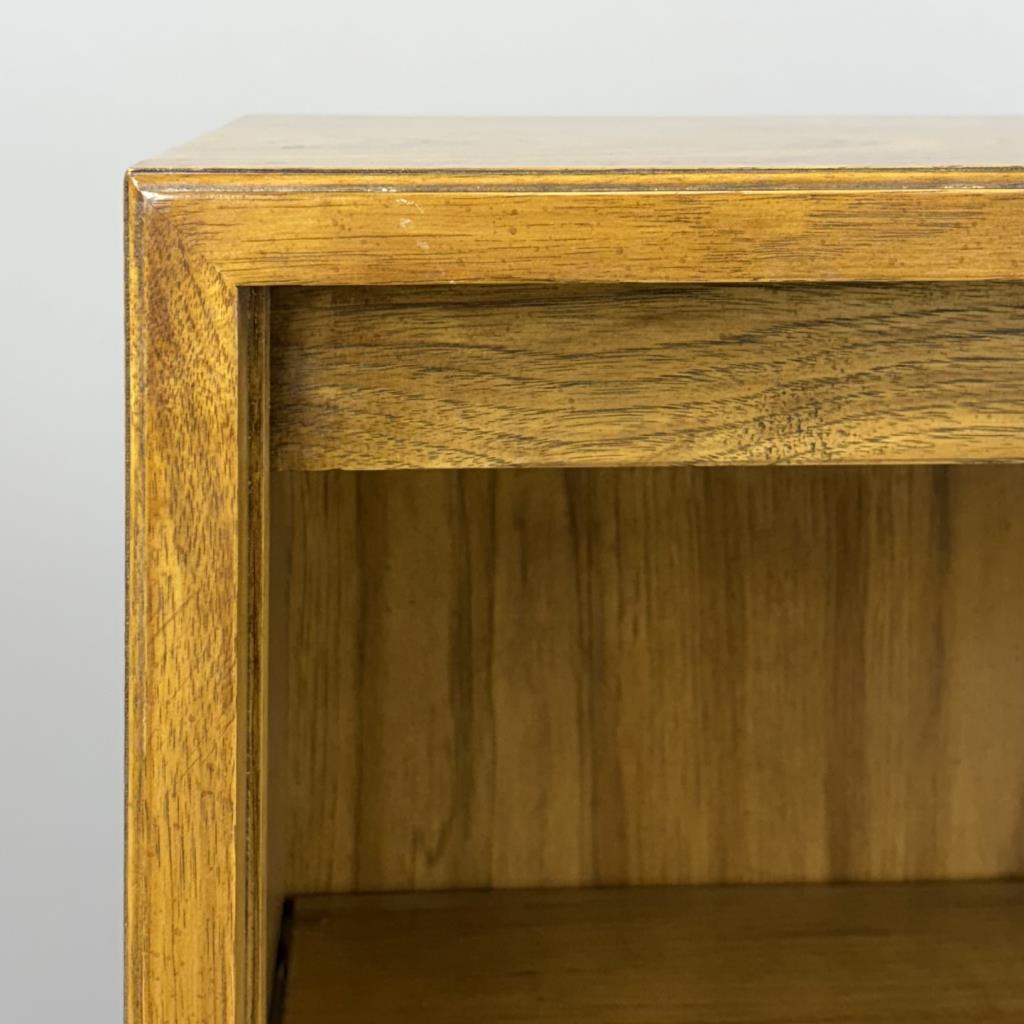 Drexel Heritage Furnishings (Drexel, North Carolina), originally illuminated, campaign style cabinet or bookcase (#990-970-2), from the “Consensus” collection, introduced in the 1970s and designed by Barney Flagg (American, active in the 1960s / 1970s), with two adjustable shelves and one fixed center shelf, flaxen pecan and oak veneer over engineered wood, 16″ x 30-1/4″ x 51″.