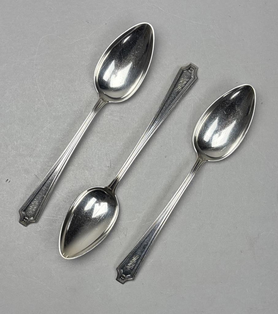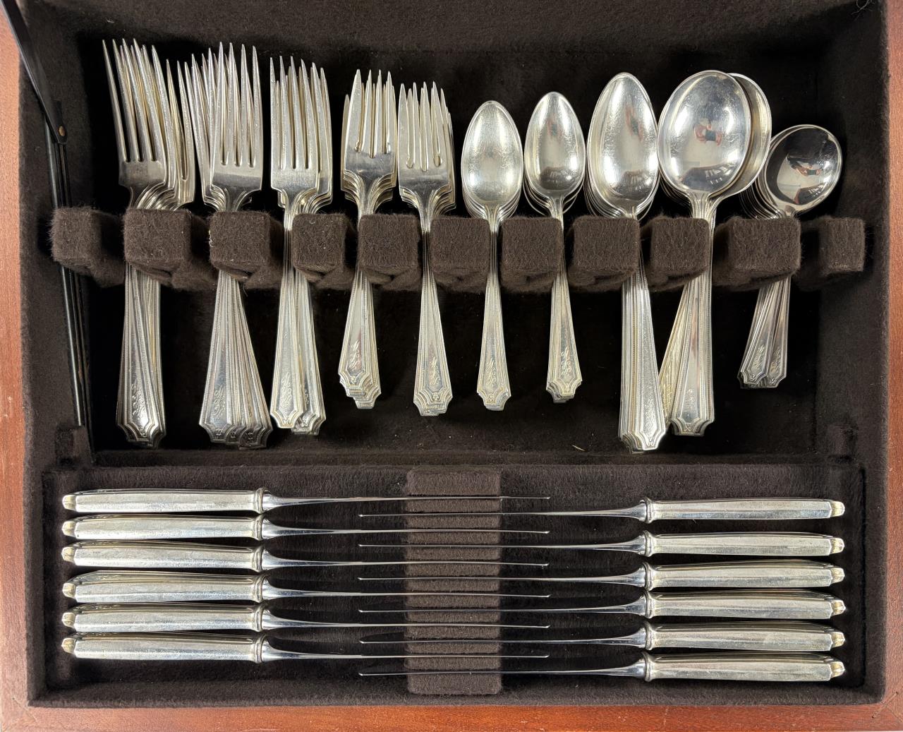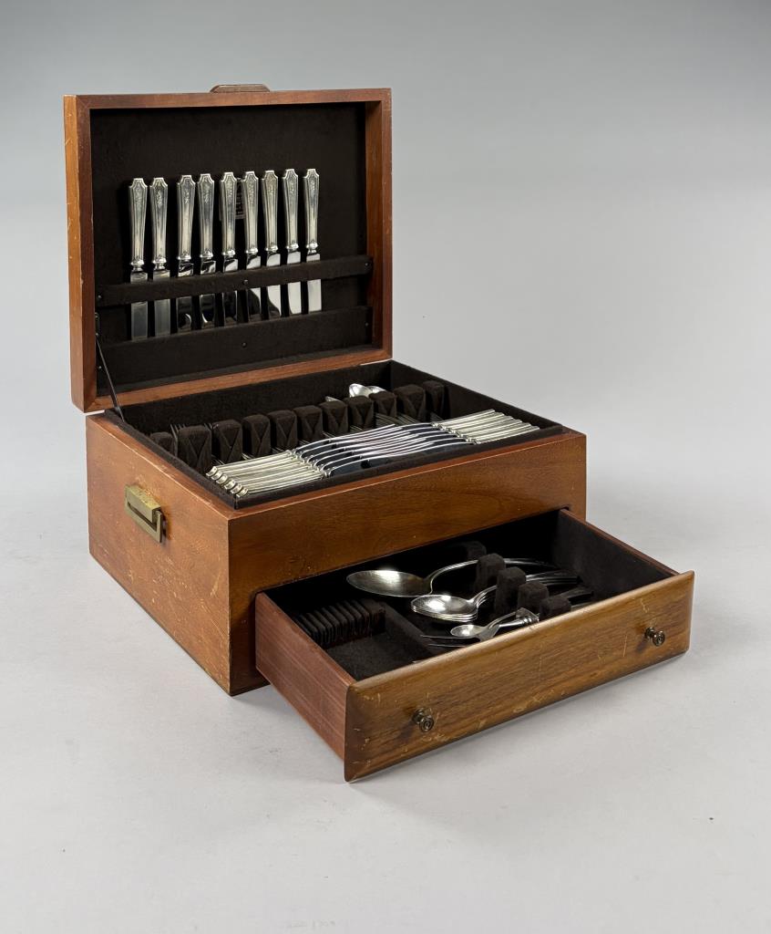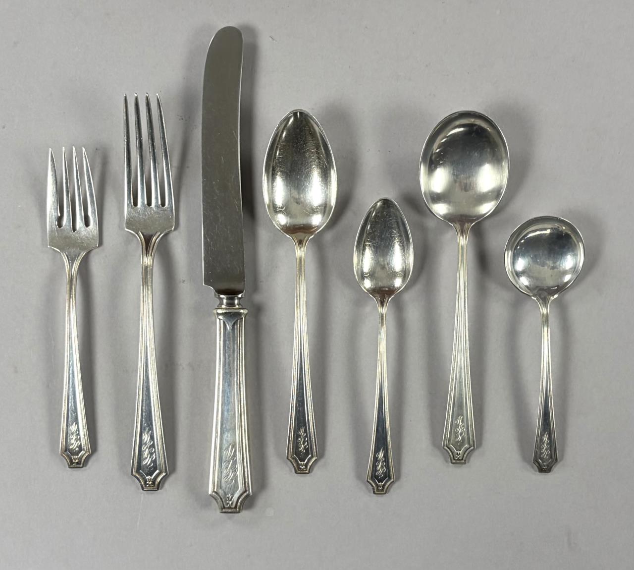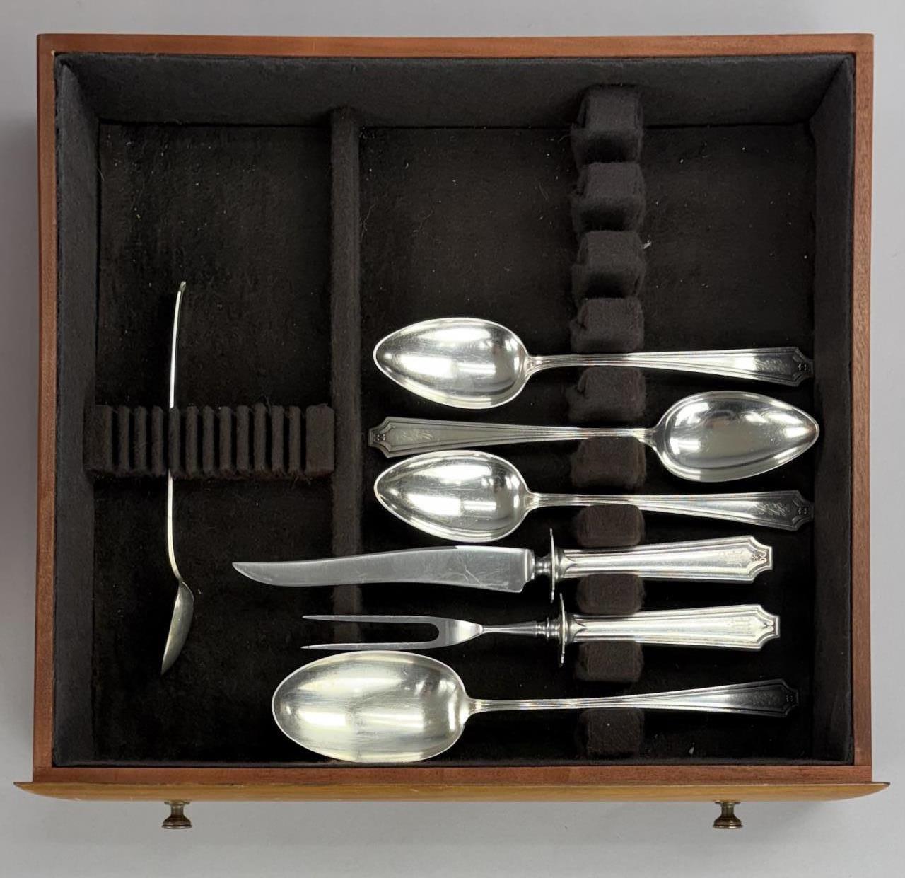127 Pieces of Gorham Manufacturing Company (Providence, Rhode Island) / Frank M. Whiting Company (North Attleboro, Massachusetts) sterling flatware in the “King Albert” pattern, introduced in 1919, with a later felt-lined wood storage box. The set includes: (12) 7-3/4″ dinner forks (Gorham); (7) 7-1/8″ luncheon forks (6 Gorham, 1 Whiting); (18) 6-1/4″ salad forks (6 Gorham, 12 Whiting); (22) 5-7/8″ teaspoons (16 Gorham, 6 Whiting); (12) 7-1/8″ tablespoons (Gorham); (12) 6-7/8″ cream soup spoons (Whiting); (12) 5-1/16″ bouillon soup spoons (Gorham); (4) 4″ demitasse spoons (Whiting); (9) 9-1/2″ hollow dinner knives (6 Gorham, 3 Whiting); (12) 8-3/4″ hollow luncheon knives (Gorham); (1) 10″ stuffing spoon (Whiting); (3) 8-1/4″ serving spoons (Whiting); (1) 7-5/16″ ice tea spoon (Gorham); (1) 9-3/4″ hollow carving knife (Whiting); (1) 8-5/8″ hollow carving fork (Whiting). Approximate total weight, not including any of the hollow pieces, is 3,780 grams.