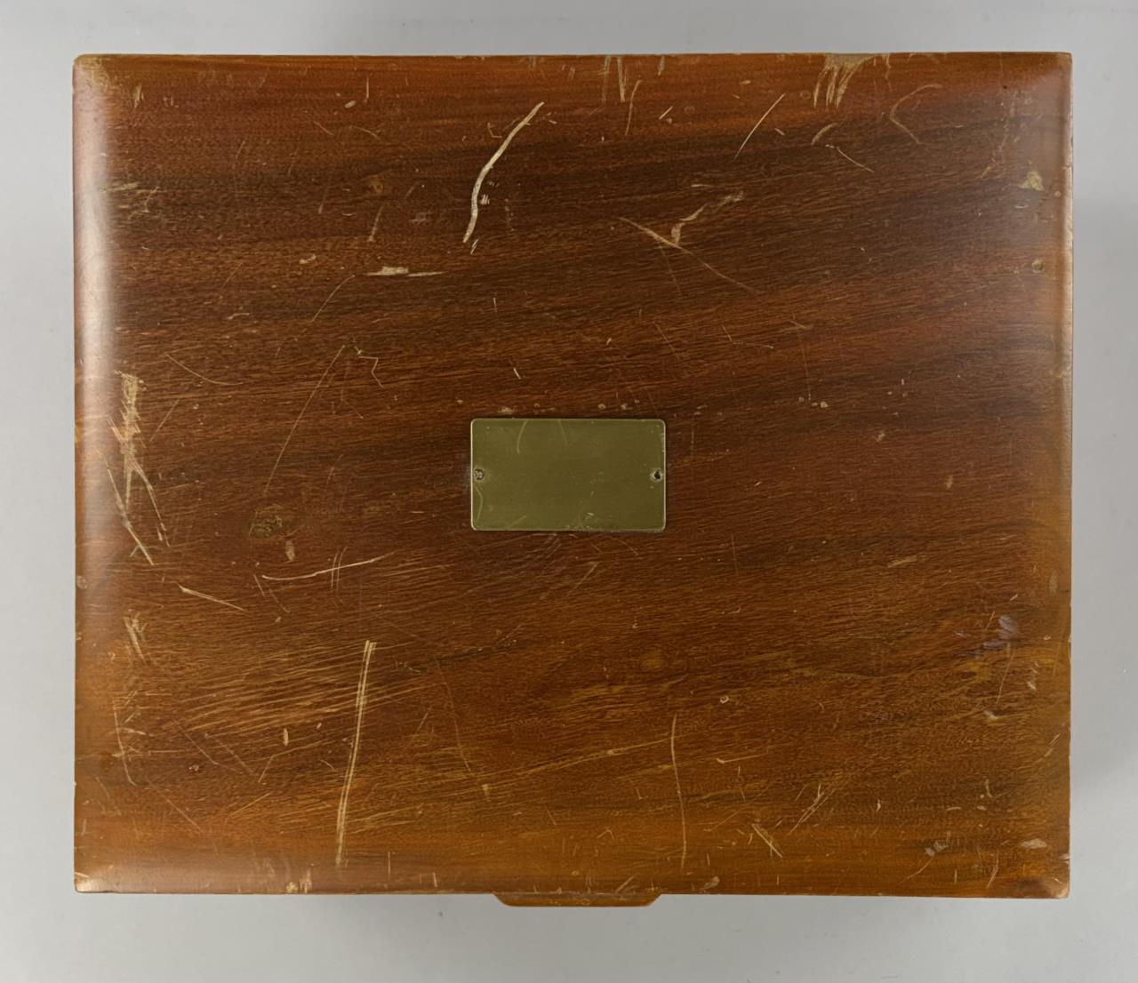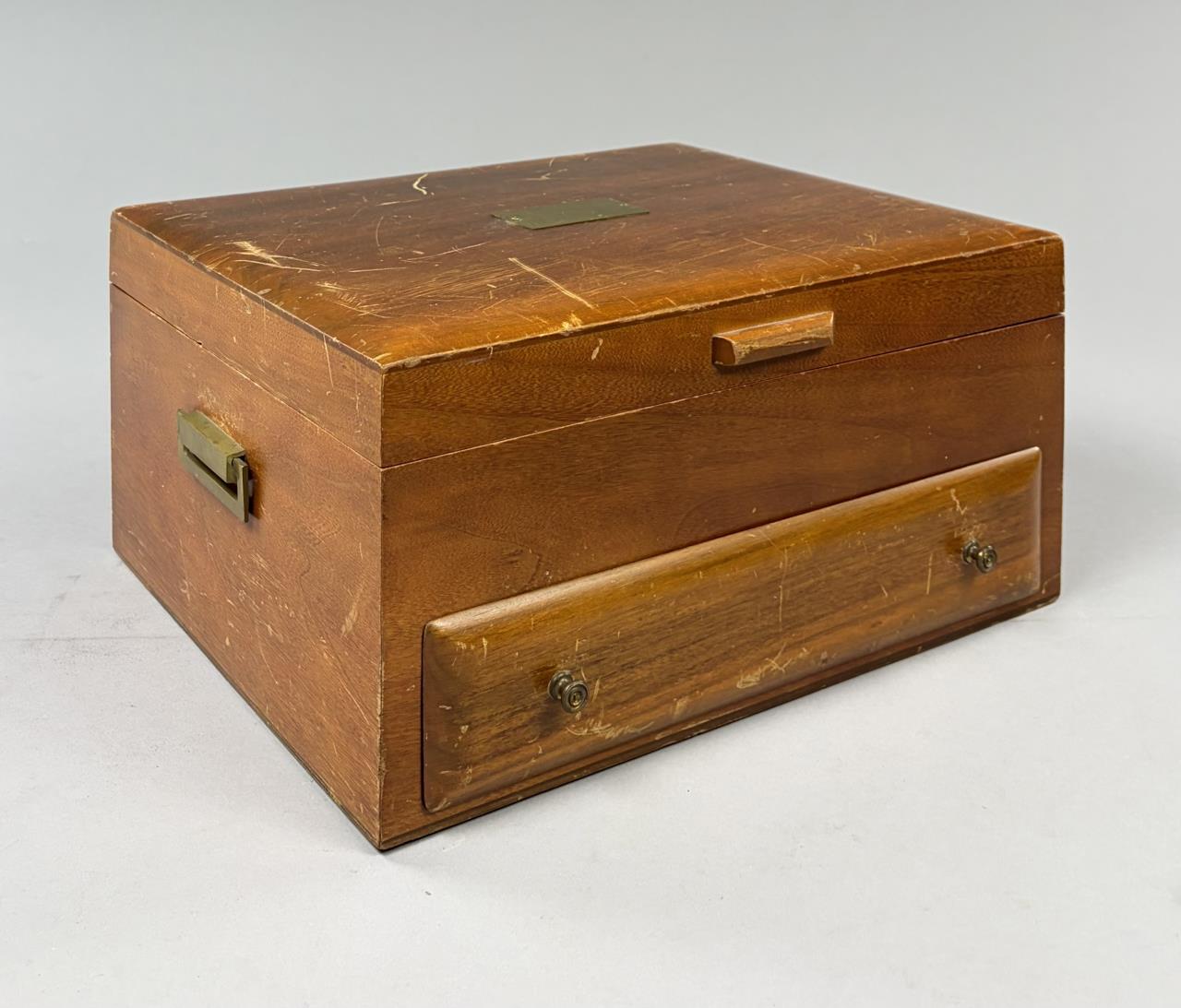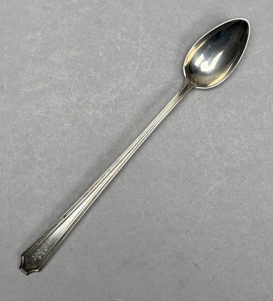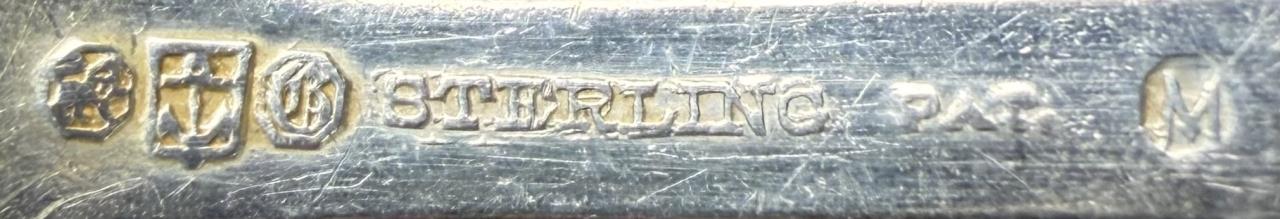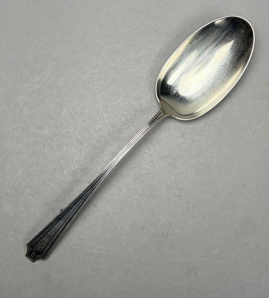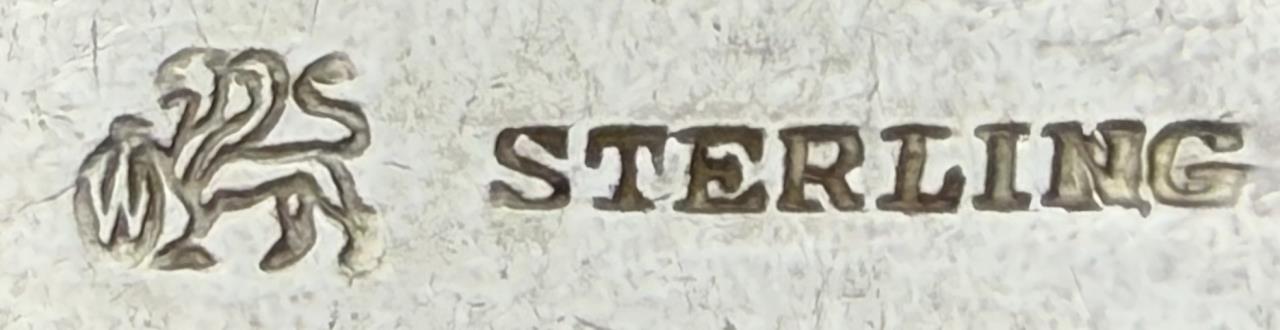 127 Pieces of Gorham Manufacturing Company (Providence, Rhode Island) / Frank M. Whiting Company (North Attleboro, Massachusetts) sterling flatware in the “King Albert” pattern, introduced in 1919, with a later felt-lined wood storage box. The set includes: (12) 7-3/4″ dinner forks (Gorham); (7) 7-1/8″ luncheon forks (6 Gorham, 1 Whiting); (18) 6-1/4″ salad forks (6 Gorham, 12 Whiting); (22) 5-7/8″ teaspoons (16 Gorham, 6 Whiting); (12) 7-1/8″ tablespoons (Gorham); (12) 6-7/8″ cream soup spoons (Whiting); (12) 5-1/16″ bouillon soup spoons (Gorham); (4) 4″ demitasse spoons (Whiting); (9) 9-1/2″ hollow dinner knives (6 Gorham, 3 Whiting); (12) 8-3/4″ hollow luncheon knives (Gorham); (1) 10″ stuffing spoon (Whiting); (3) 8-1/4″ serving spoons (Whiting); (1) 7-5/16″ ice tea spoon (Gorham); (1) 9-3/4″ hollow carving knife (Whiting); (1) 8-5/8″ hollow carving fork (Whiting). Approximate total weight, not including any of the hollow pieces, is 3,780 grams.