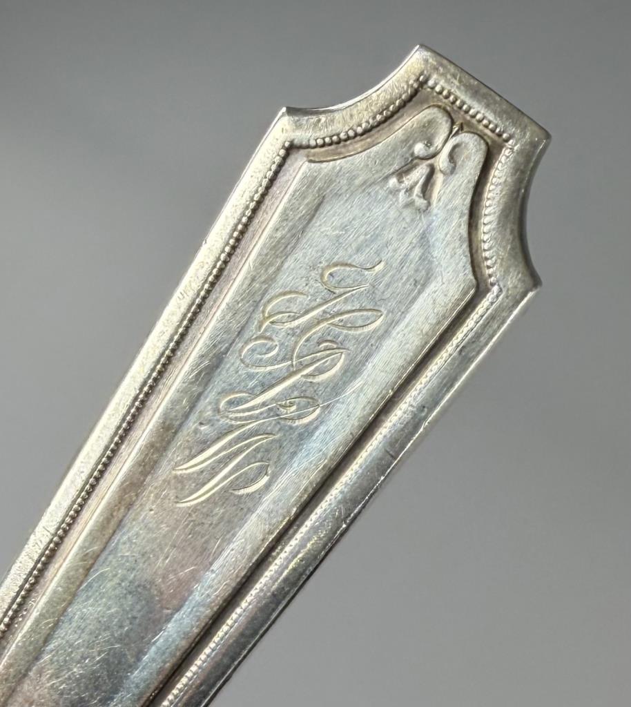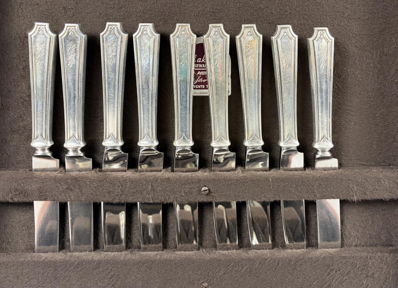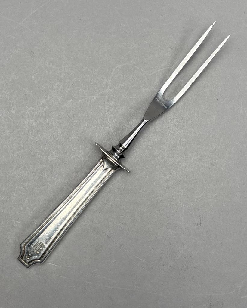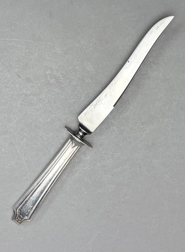 CONDITION: All pieces are monogrammed, some are dated as well on the backside, all show signs of wear commensurate with age and use, the carving knife has been heavily sharpened, there is surface wear including scratches to wood storage box, please see photos.