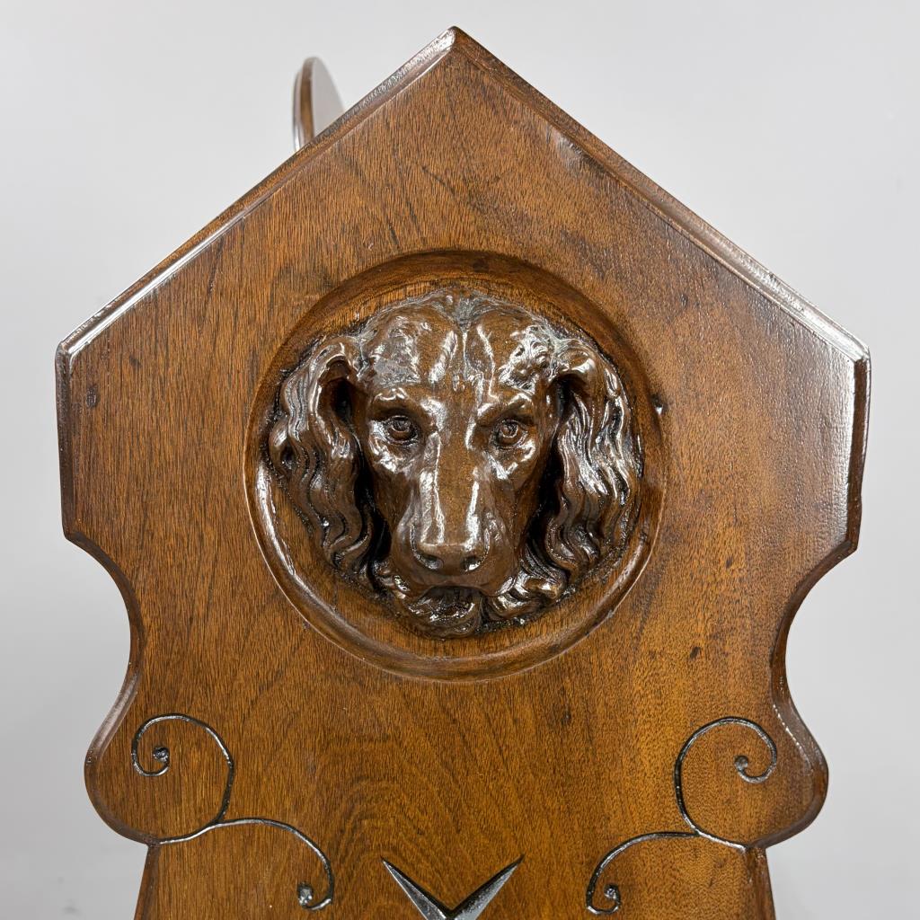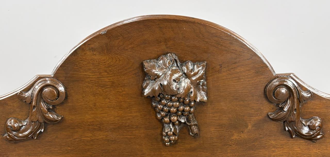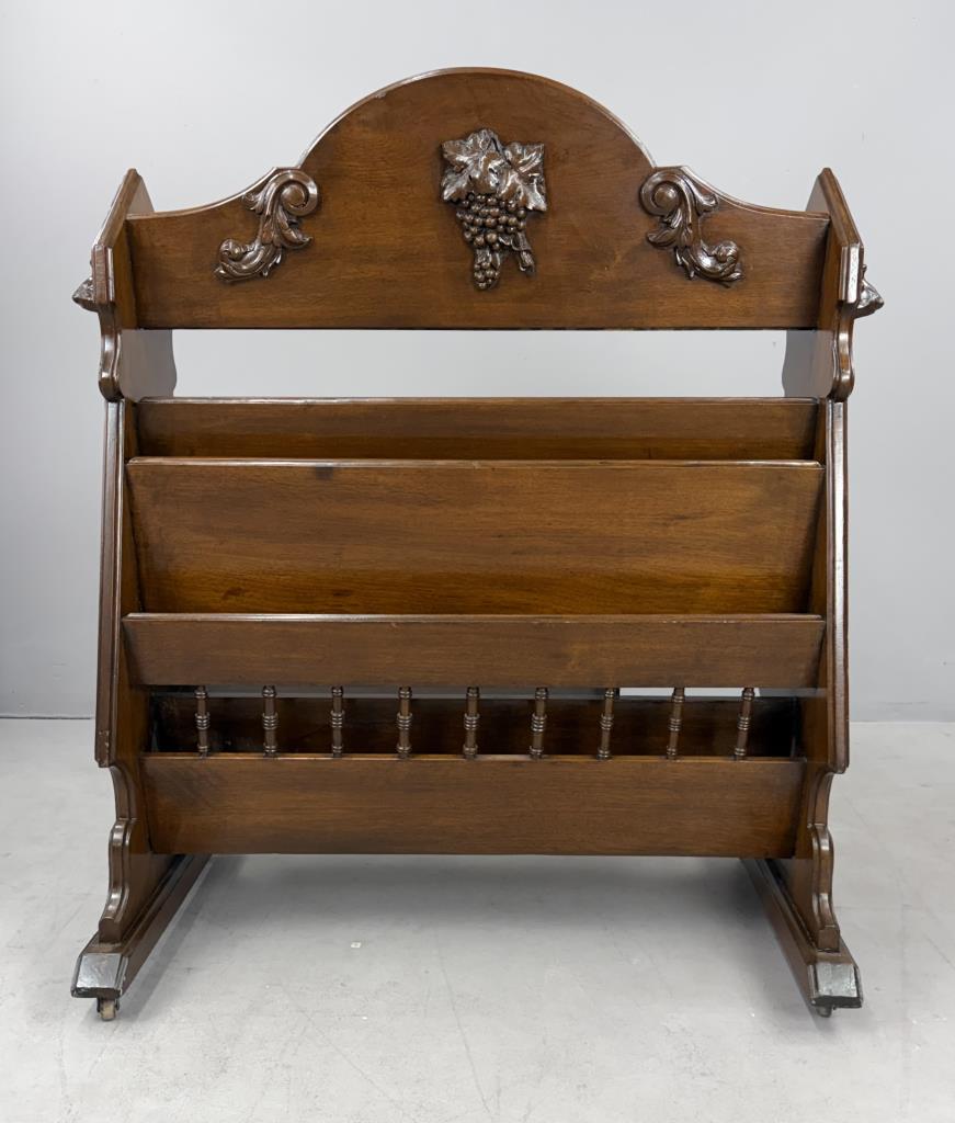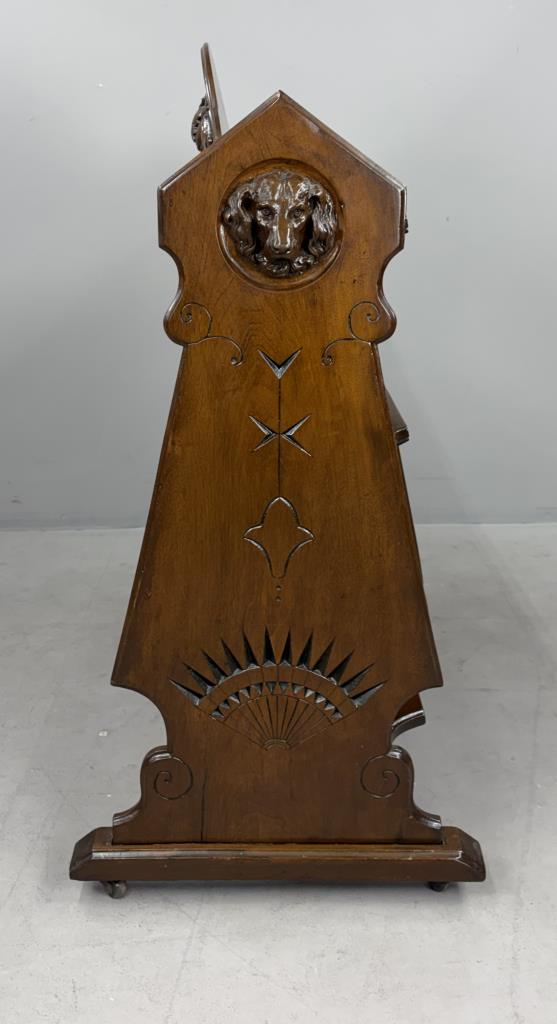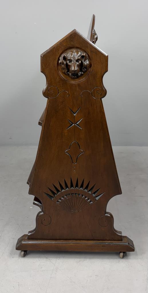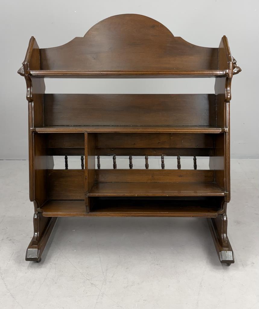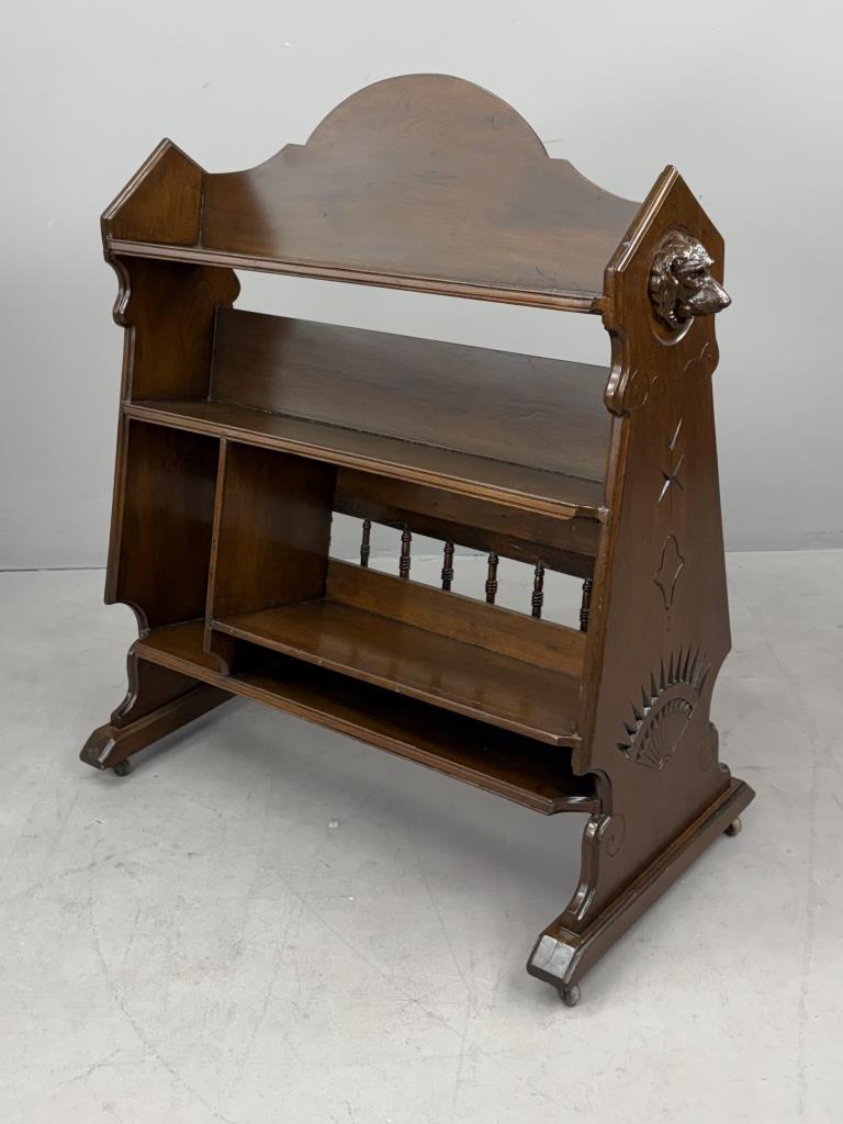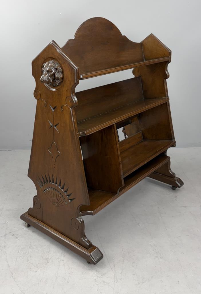 American Victorian Era book trough, or book shelf, with applied composition carvings of dog’s heads, a grape cluster, and scrolls, black walnut, last quarter of the 19th Century, 20-3/4″ x 40″ x 43″.