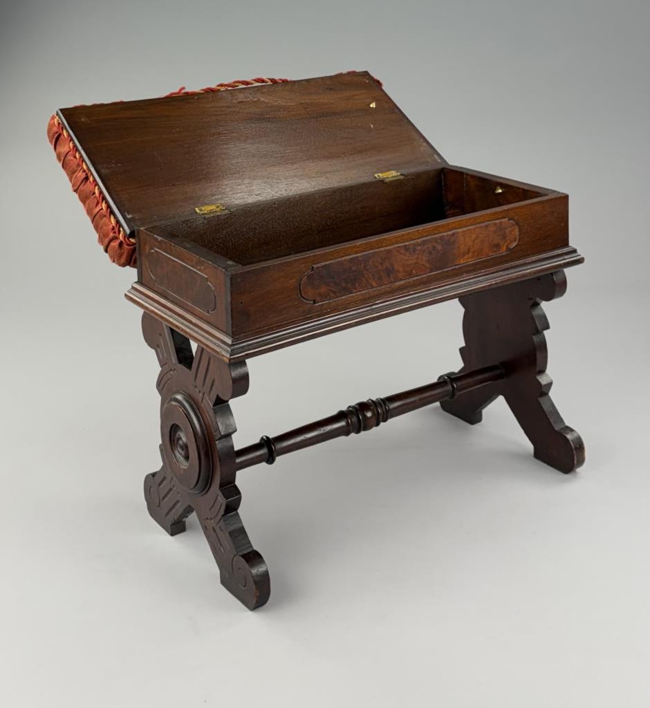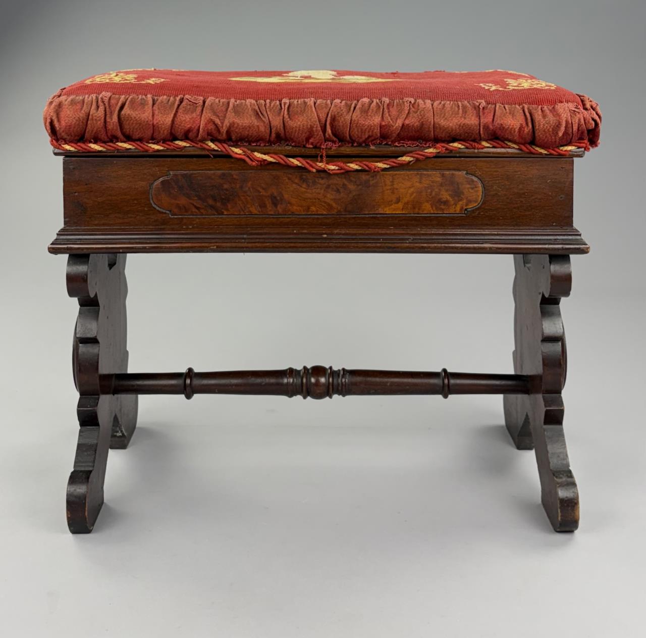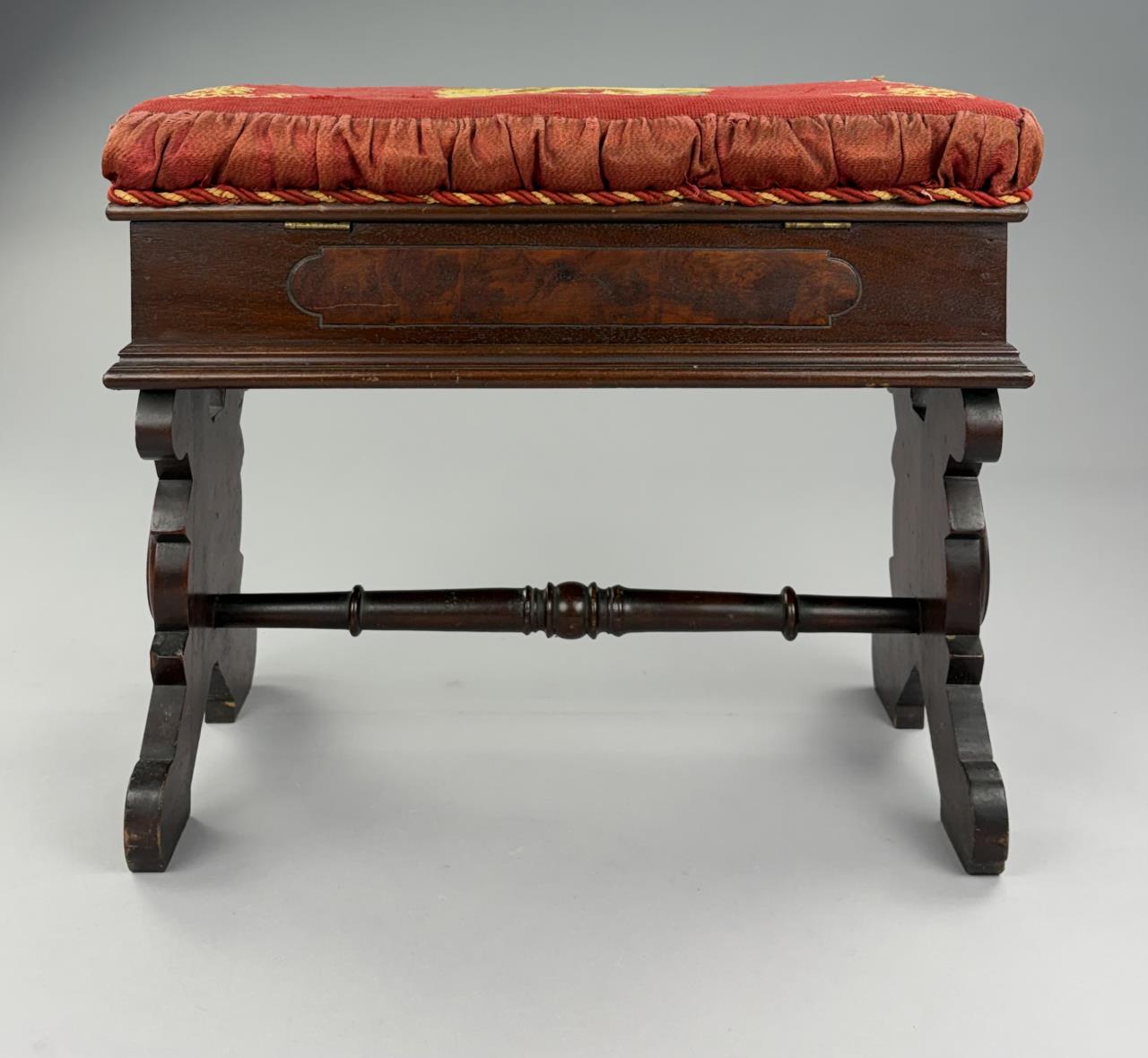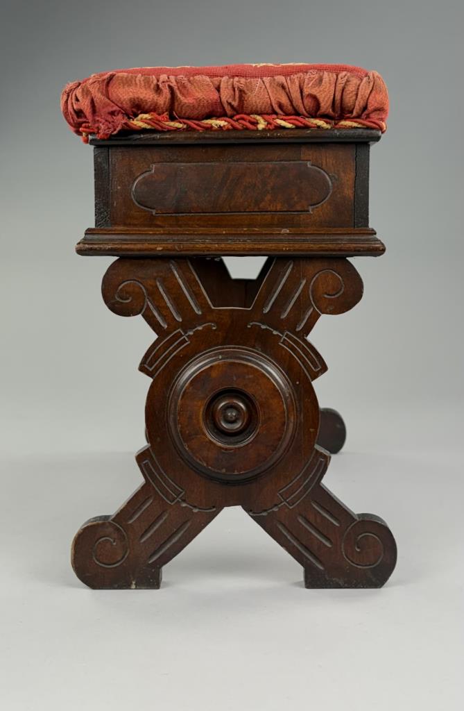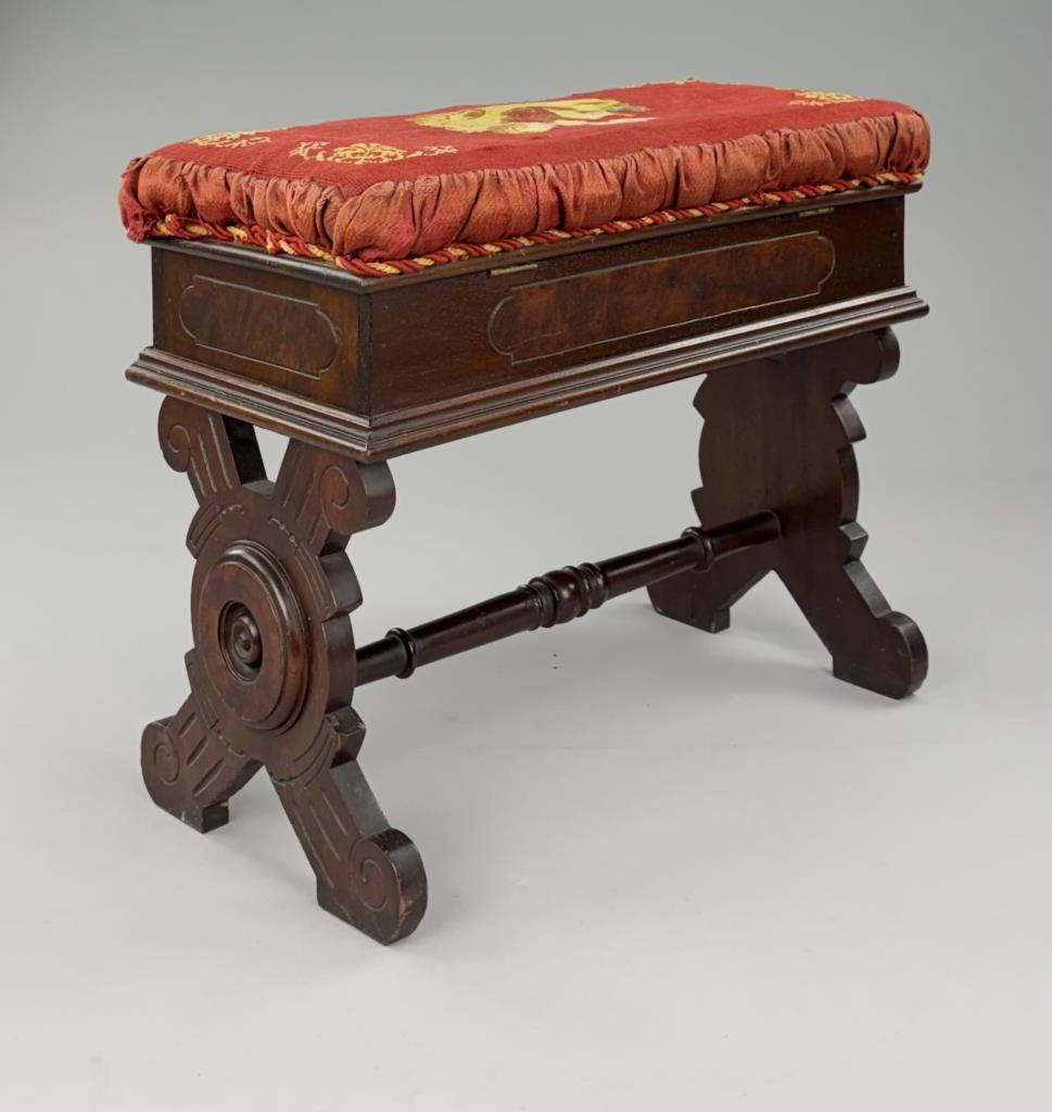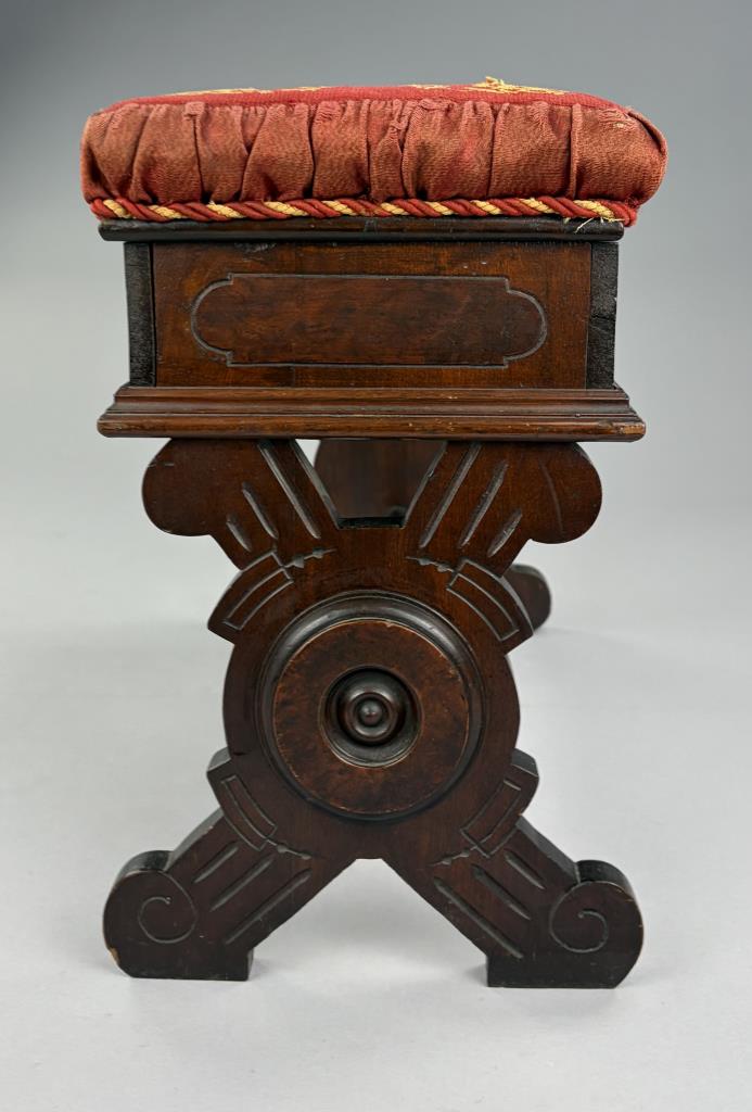 American Victorian Era, Renaissance Revival, slipper bench or piano / organ stool, with “X” form supports embellished with rosettes and geometric line carvings, turned stretcher, inset burlwood panels, hidden storage compartment, and possibly original needlepoint upholstery, black walnut, circa 1875, 11″ x 22″ x 18″.