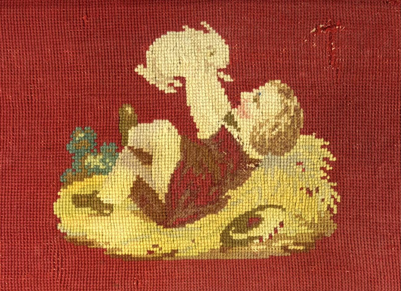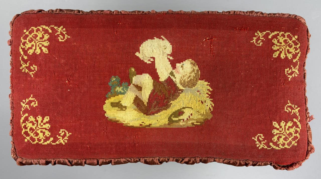 CONDITION: Possible older repairs to needlepoint, braided upholstery trim is loose in one place, please see photos.