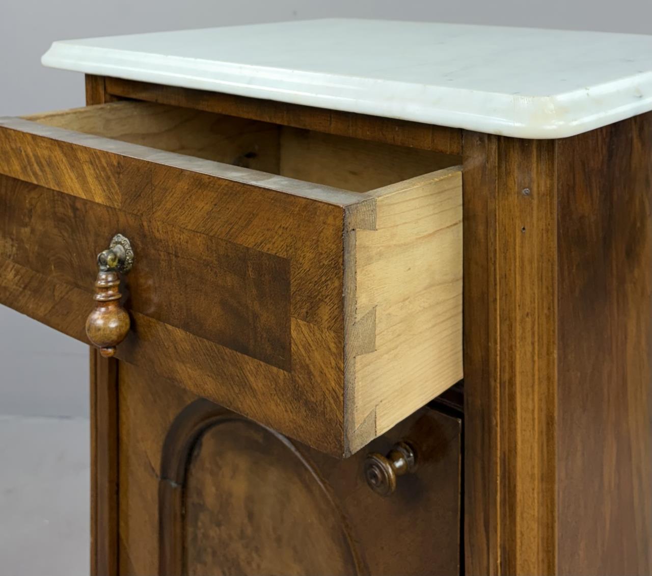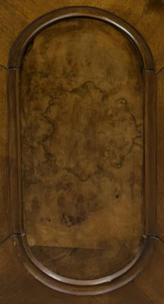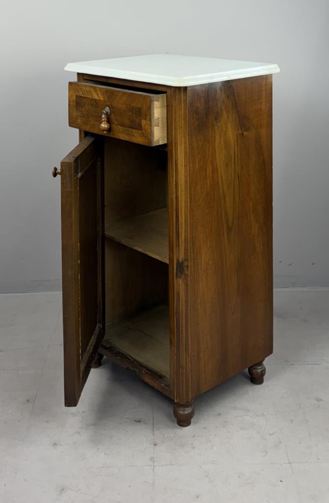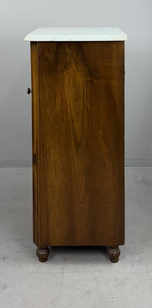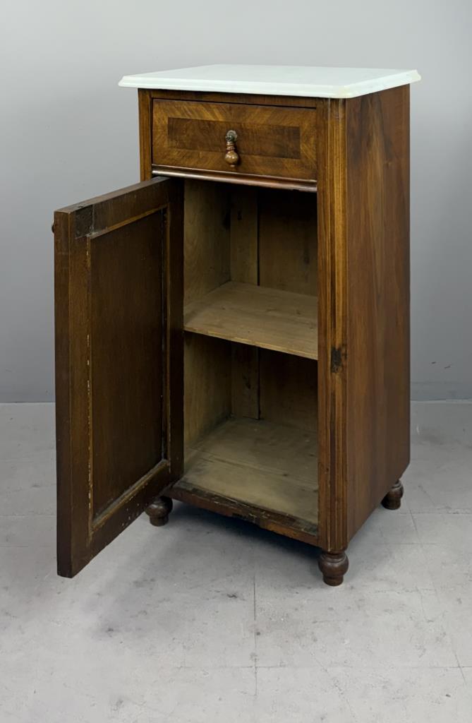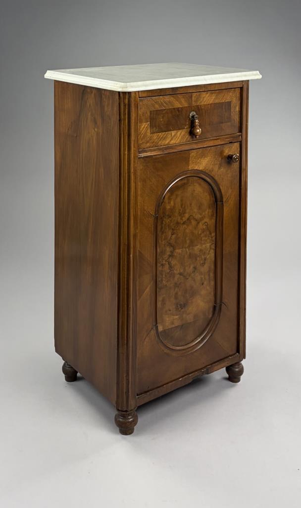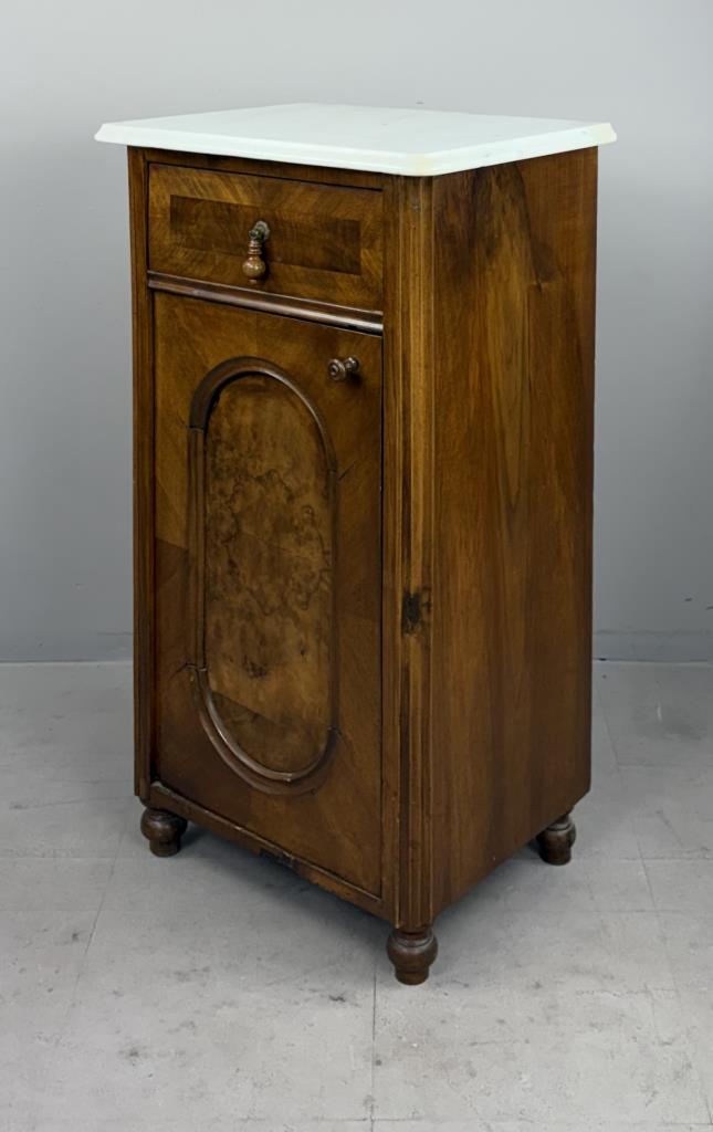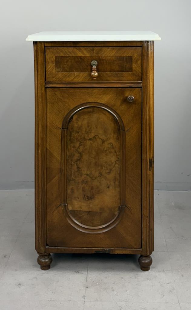 Antique European nightstand, with inset oval burlwood panel on door and marble top, late 19th or/ early 20th Century, 15″ x 19″ x 33-1/2″.
