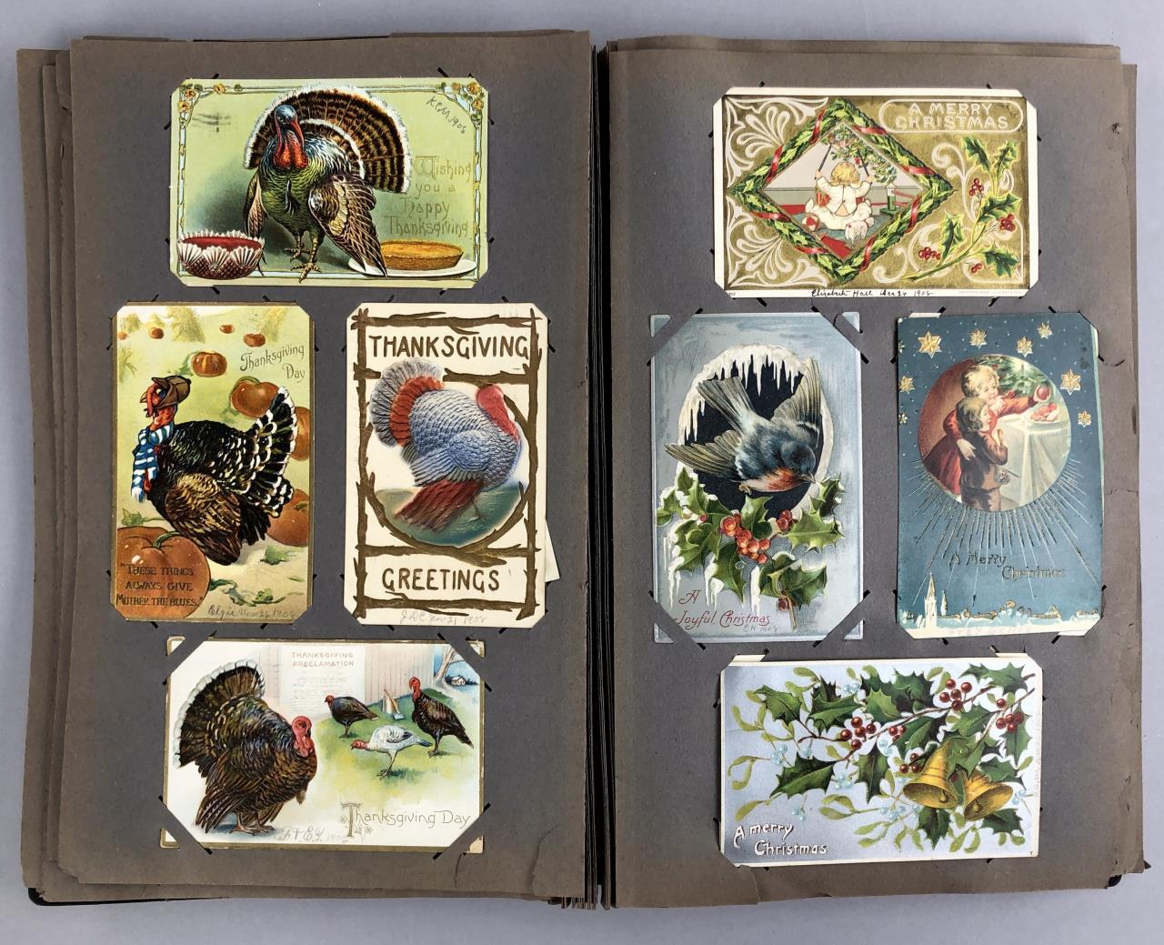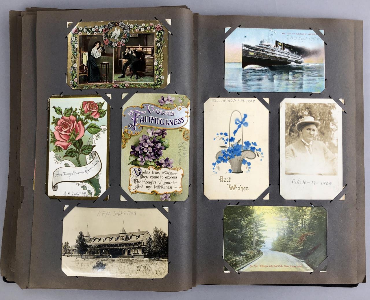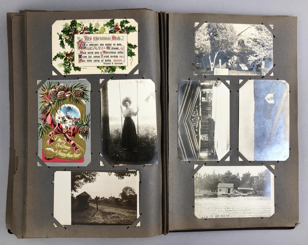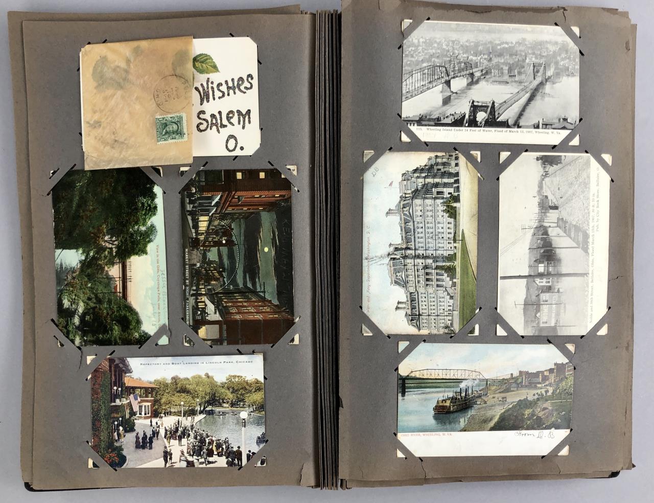 Antique post card album with more than 300 post cards, many real photos, including early baseball, President Taft, Christmas, Fourth of July, Thanksgiving, New York, Washington D.C., Ohio, Illinois, and the lost town of Merle Beach Michigan, supposedly somewhere between
