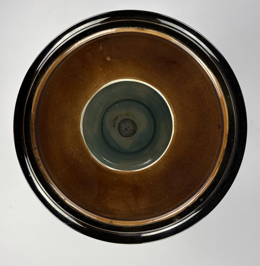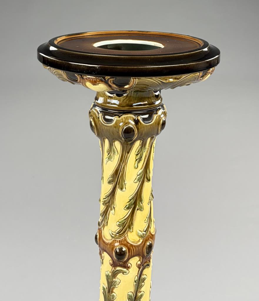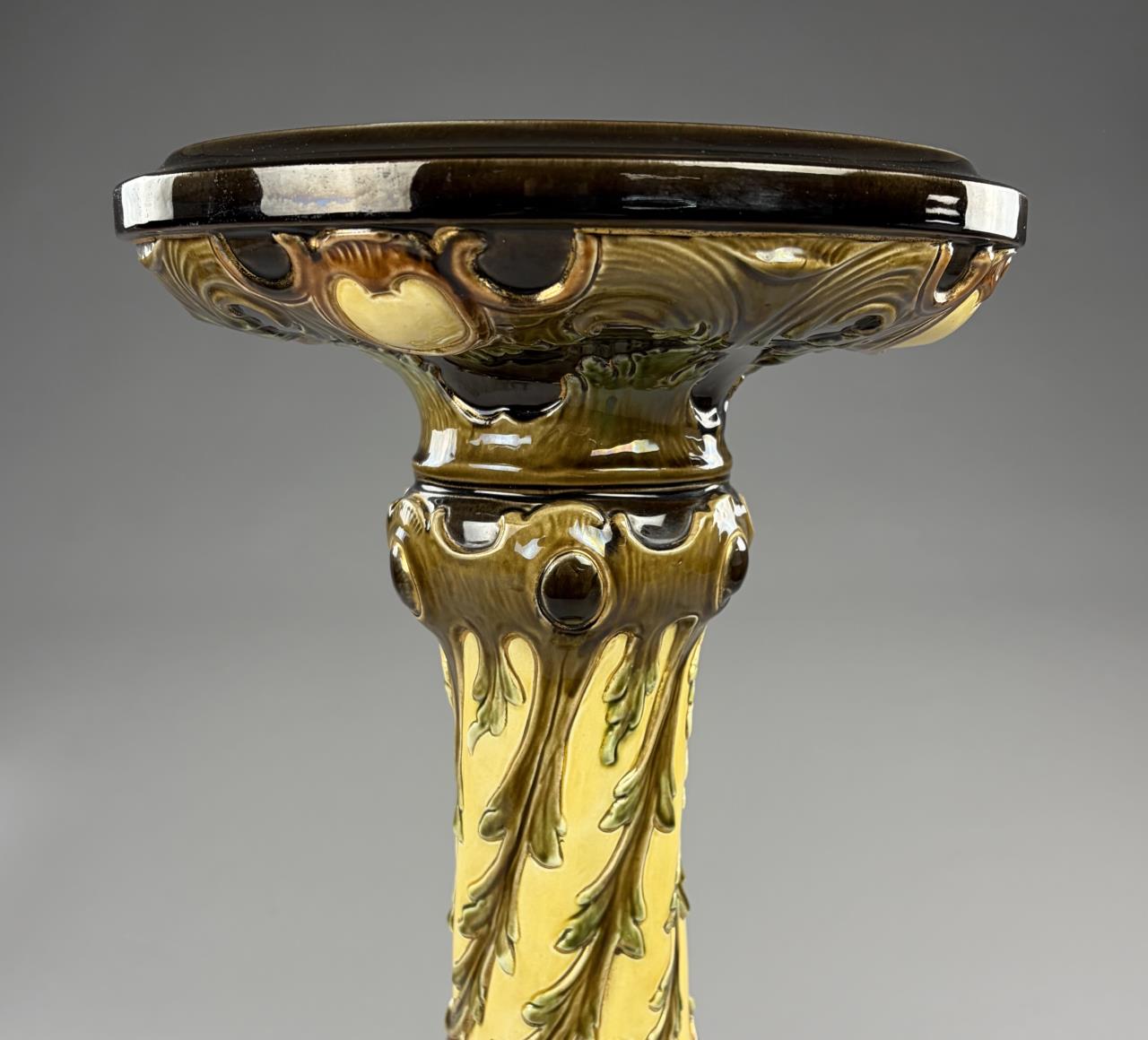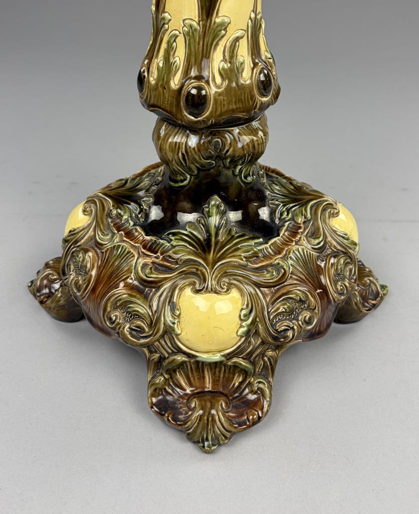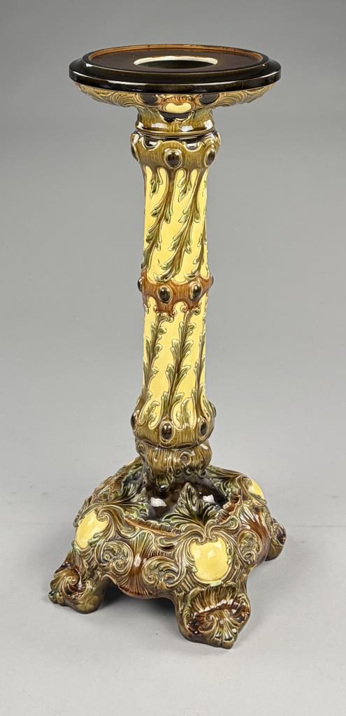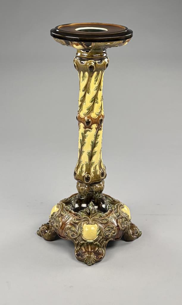 Antique majolica glazed pottery pedestal, or jardiniere stand, Rocco style, late 19th / early 20th Century, 13-3/4″ (W) x 24-1/2″ (H).