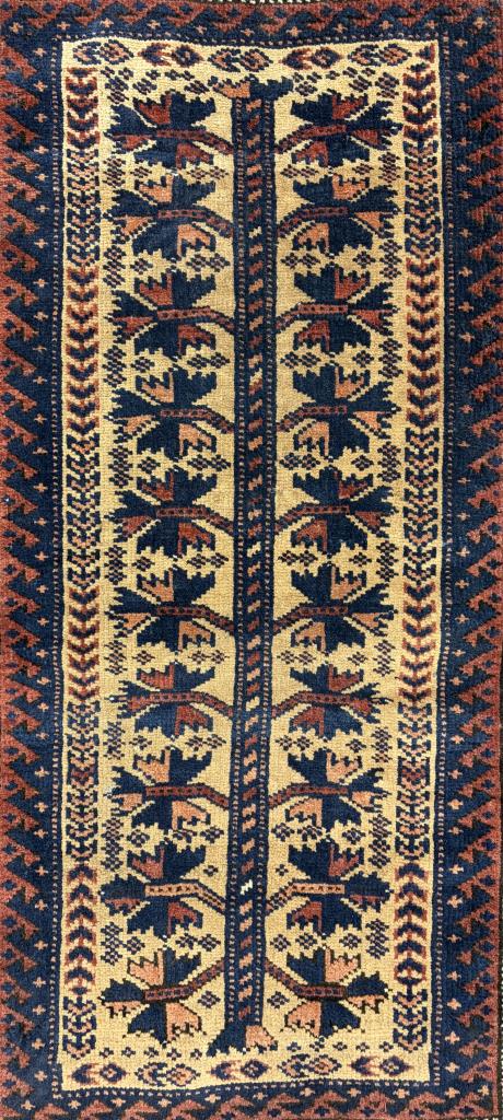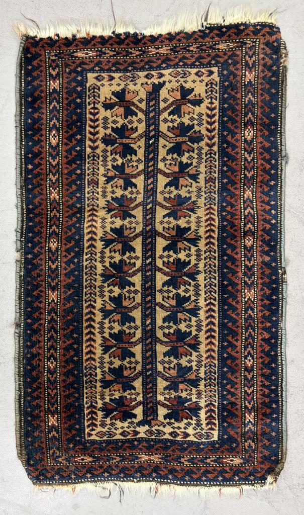 Persian Baluchistan rug, hand-knotted, wool pile on a wool warp and weft, circa 1940s /1950s, approximately 2’6″ x 1’6″.
