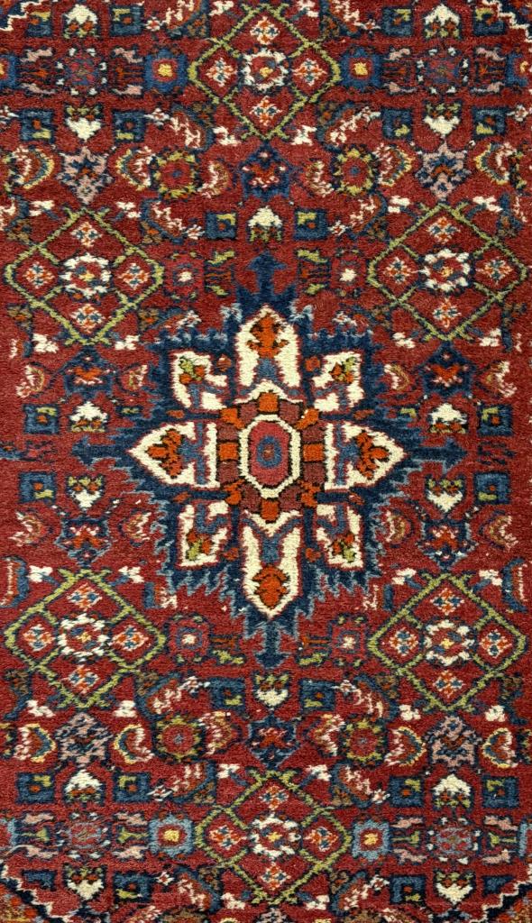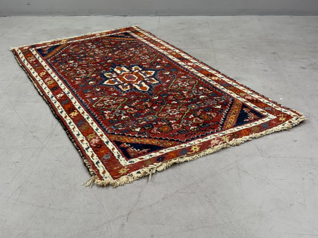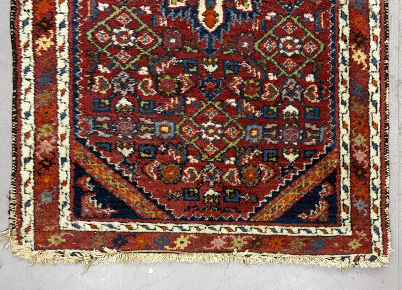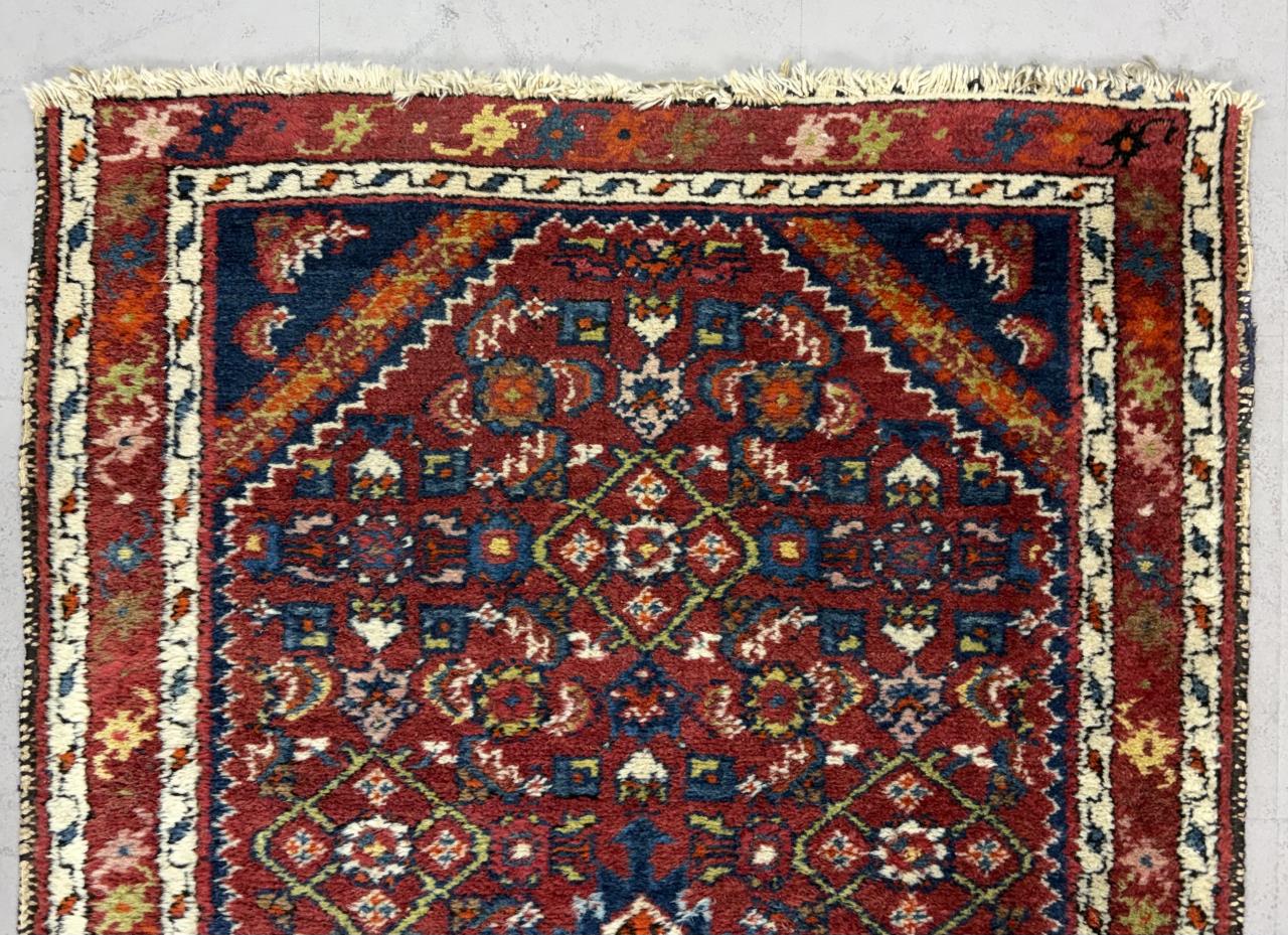 Persian Senna Kurd rug, hand-knotted, wool pile on a cotton warp and weft, semi-antique, approximately 4’2″ x 2’6″.