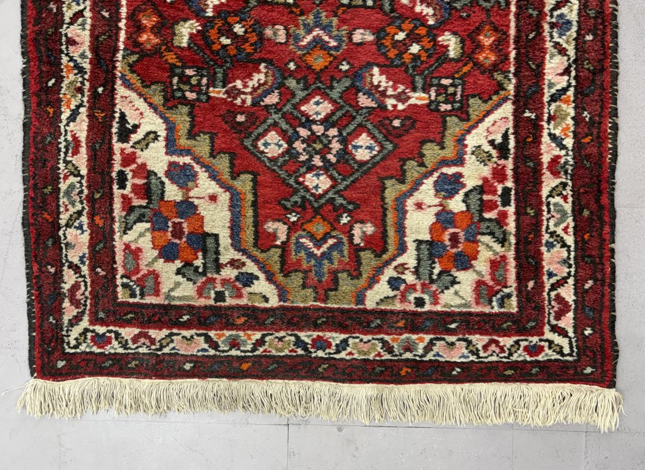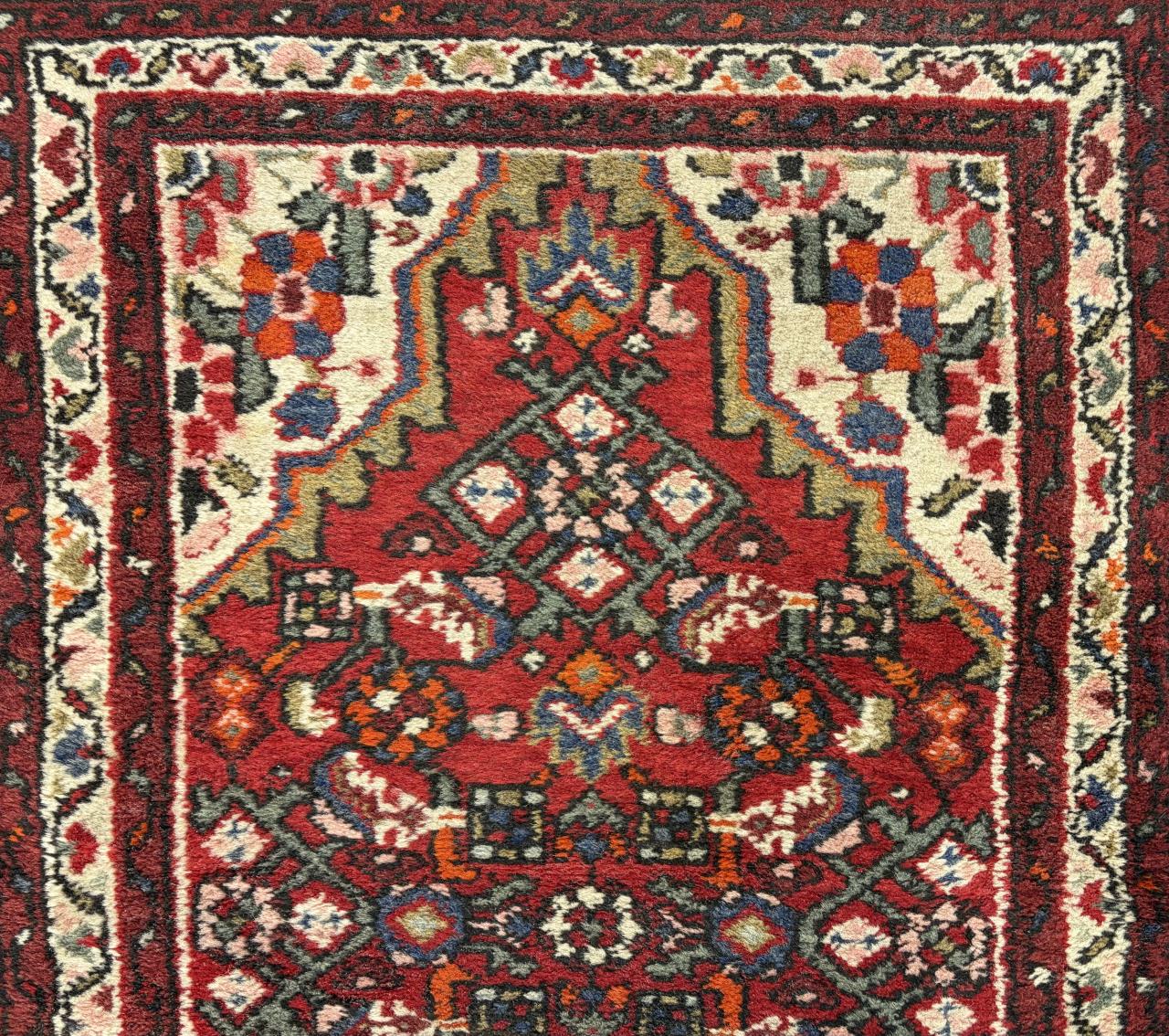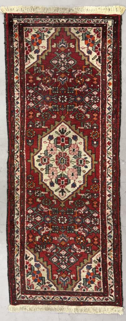 Persian Hamadan runner, hand-knotted, wool pile on a cotton warp and weft, approximately 6’8″ x 2’7″.