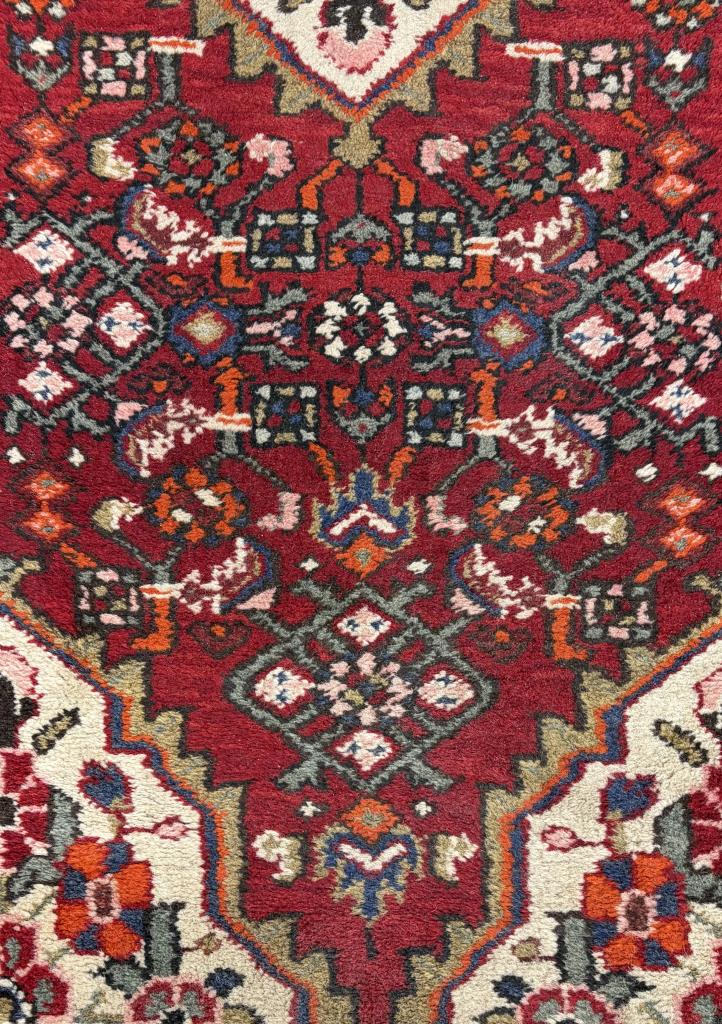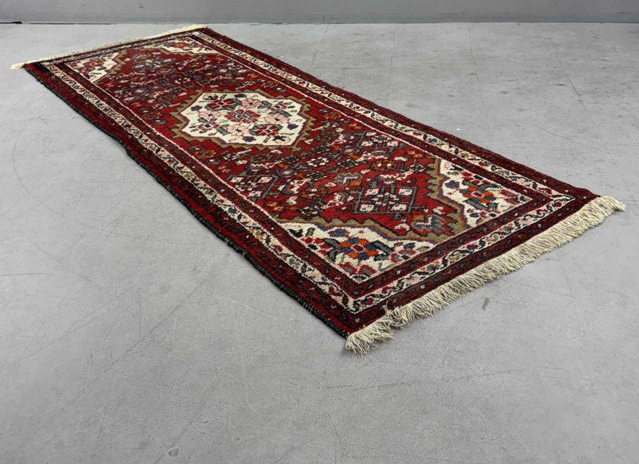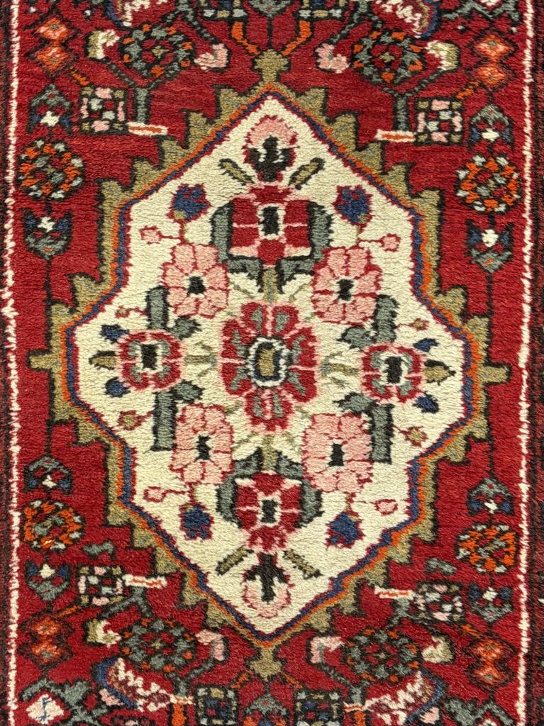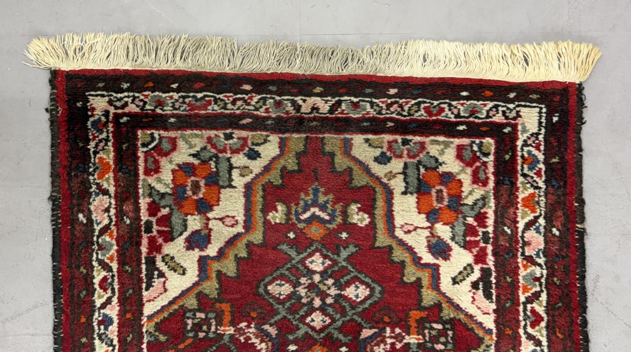 Persian Hamadan runner, hand-knotted, wool pile on a cotton warp and weft, approximately 6’8″ x 2’7″.