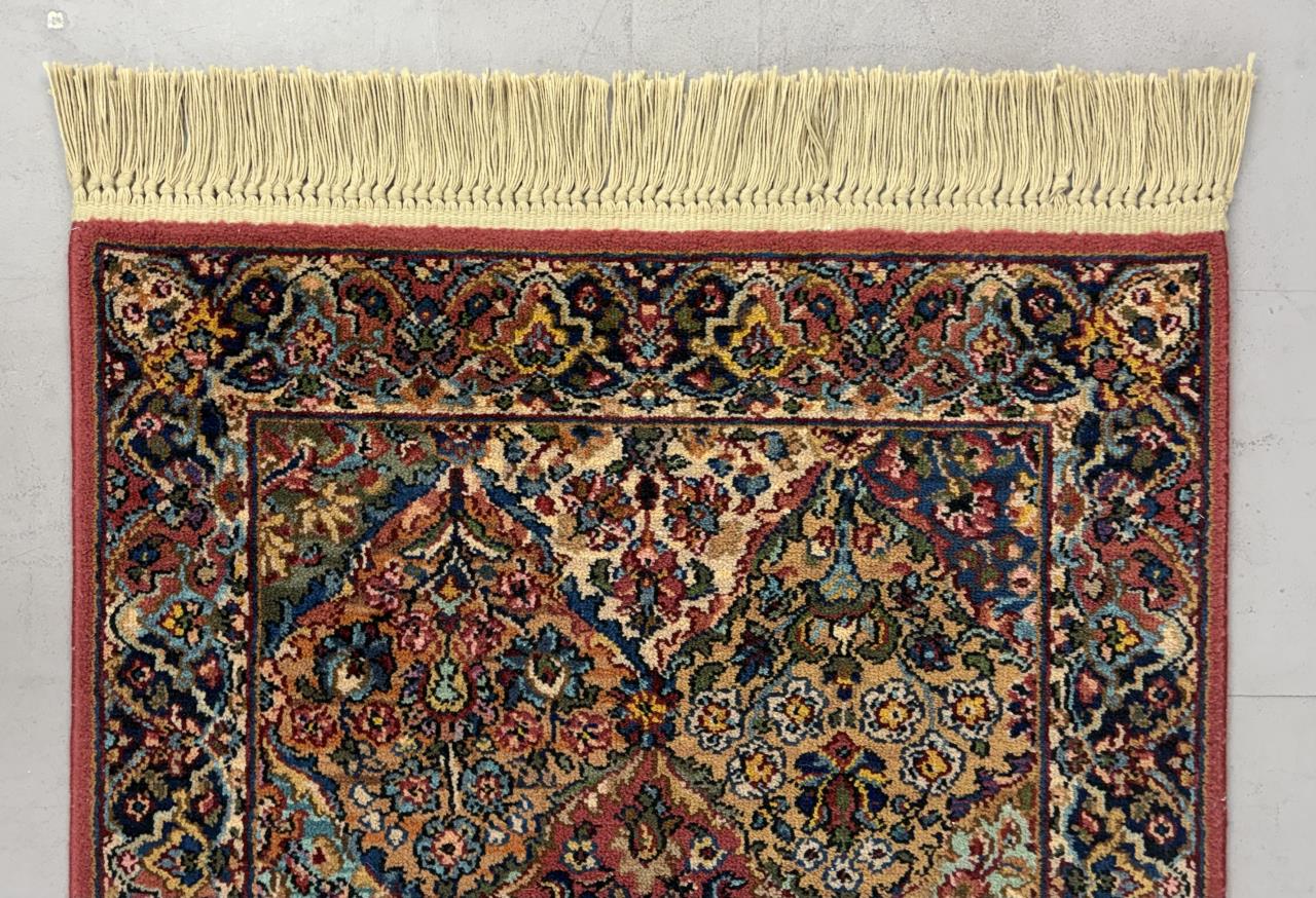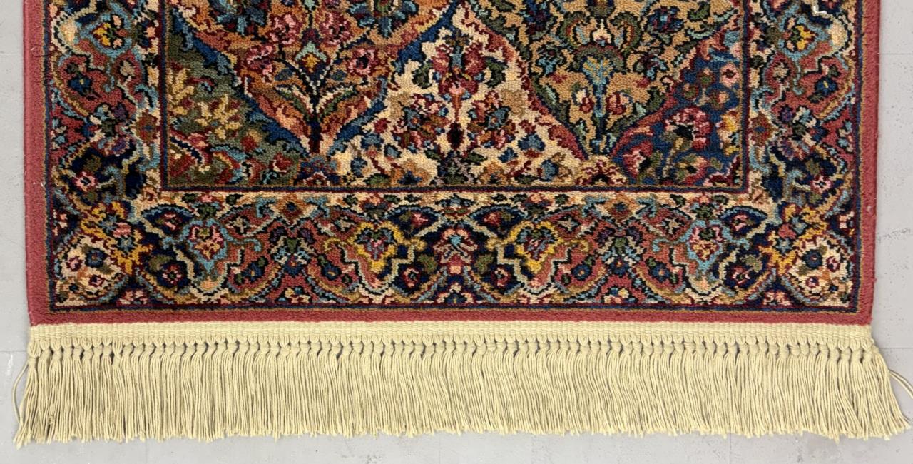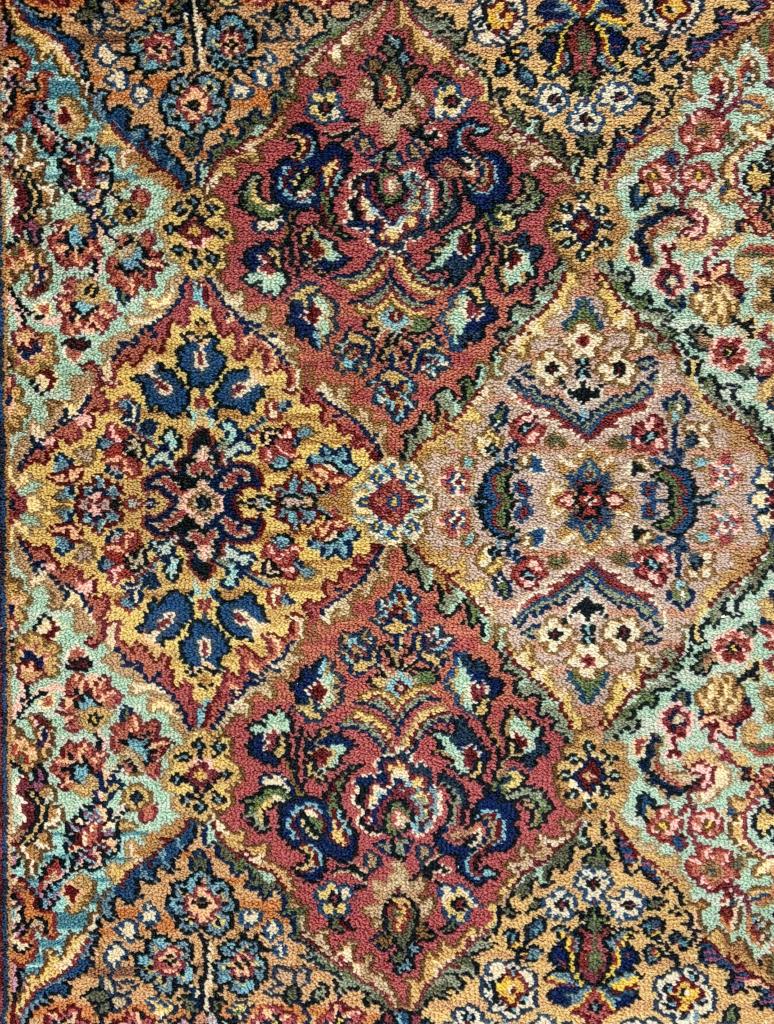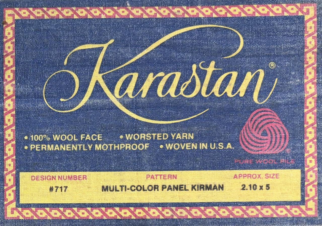 Karastan (Eden, North Carolina) “Multi-Colored Panel Kirman” (#717) style wool rug, machine-made, approximately 5′ x 2’10”. Introduced in 1937, style #717 quickly became one of Karastan’s most iconic and successful rugs remaining in production for several decades.