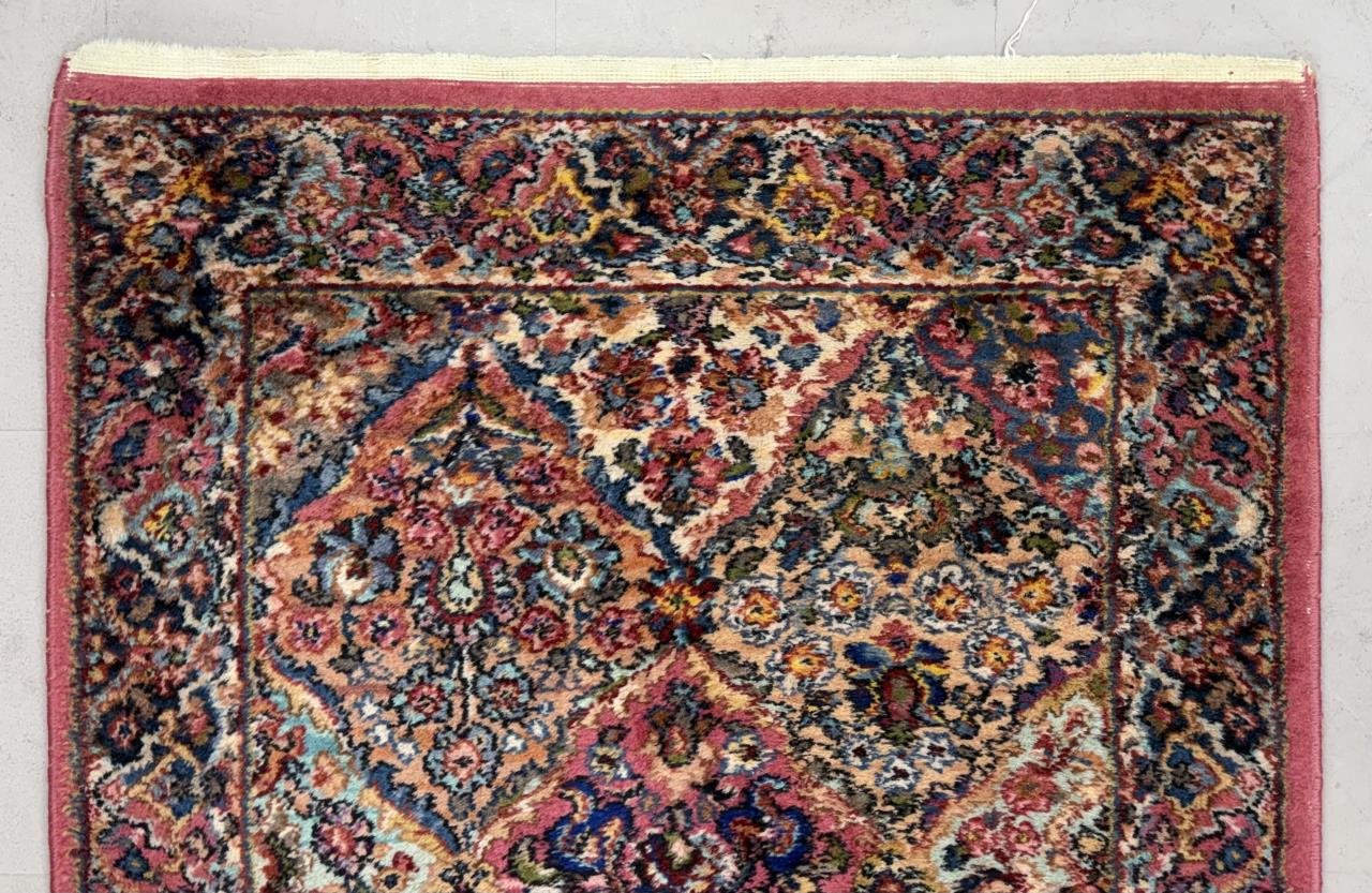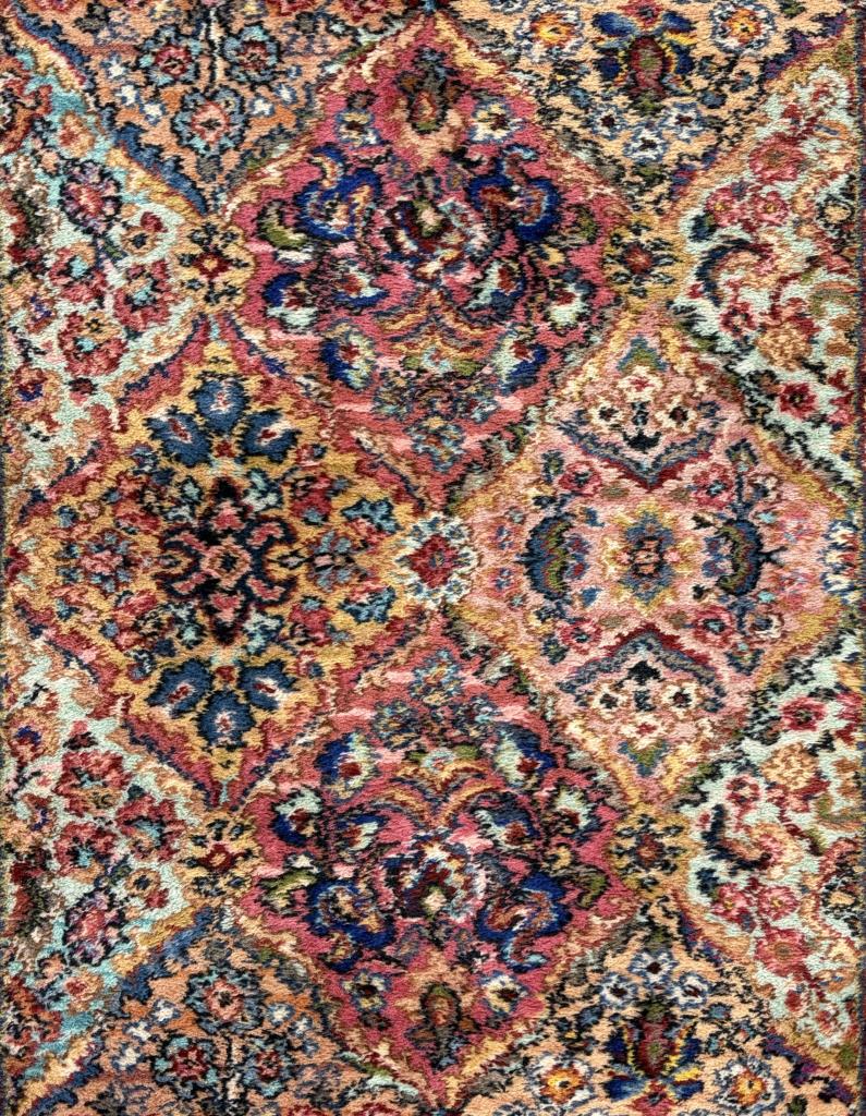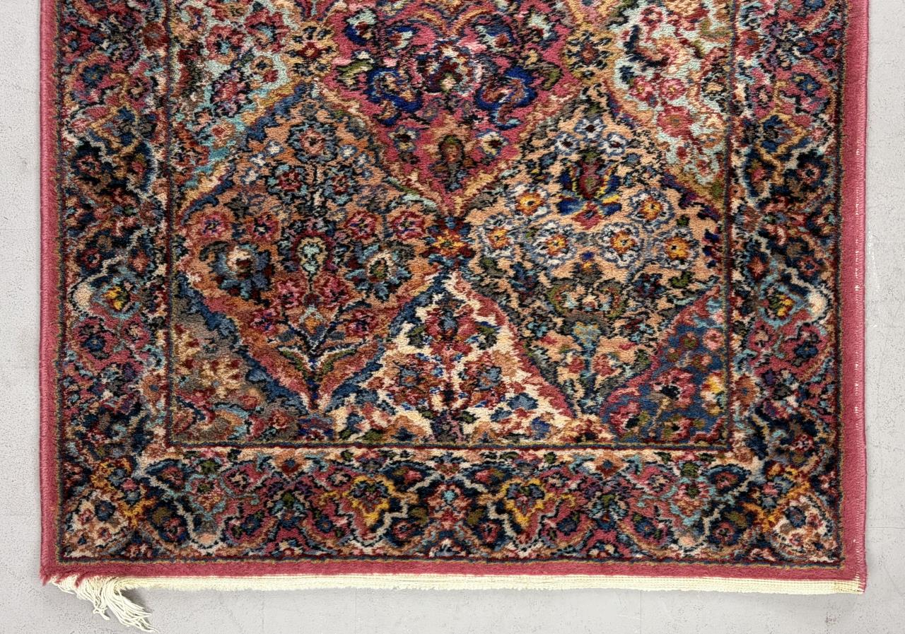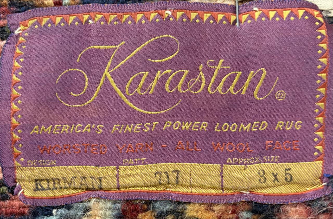 Karastan (Eden, North Carolina) “Multi-Colored Panel Kirman” (#717) style wool rug, machine-made, approximately 5′ x 2’10”. Introduced in 1937, style #717 quickly became one of Karastan’s most iconic and successful rugs remaining in production for several decades.