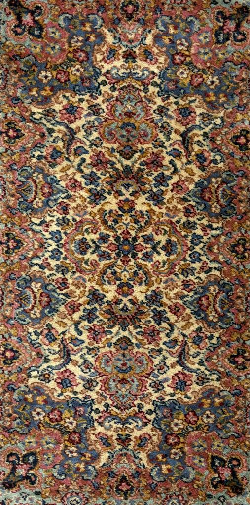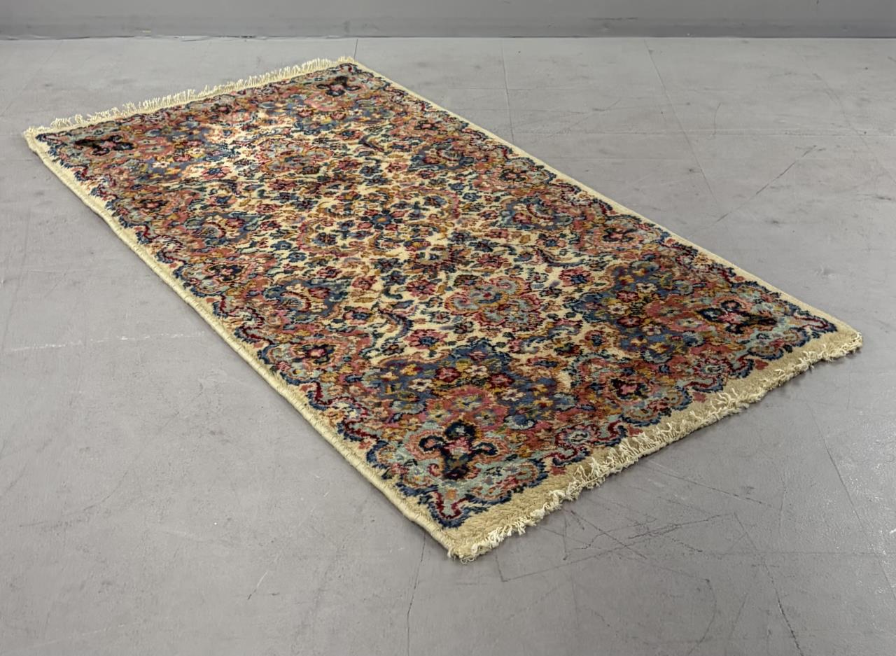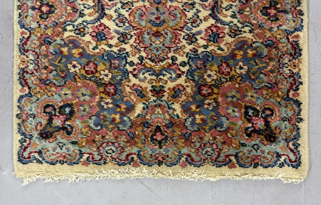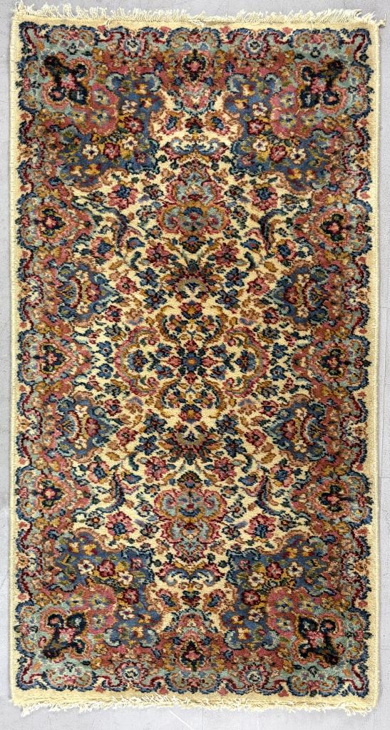 Karastan (Eden, North Carolina) “Ivory Kirman” (#759) style wool rug, machine-made, approximately 4′ x 2’2″.