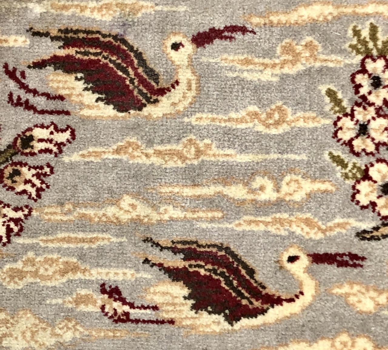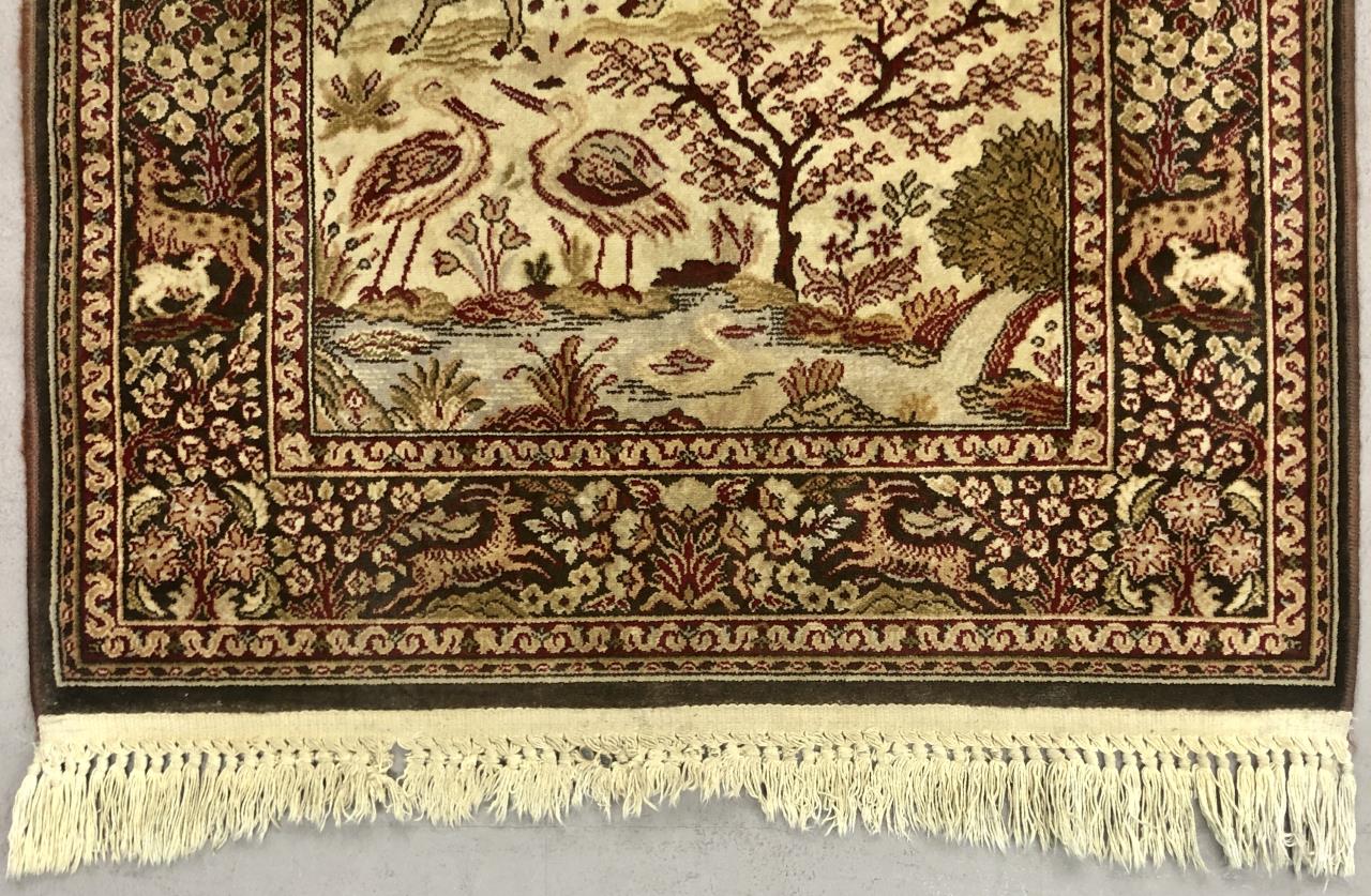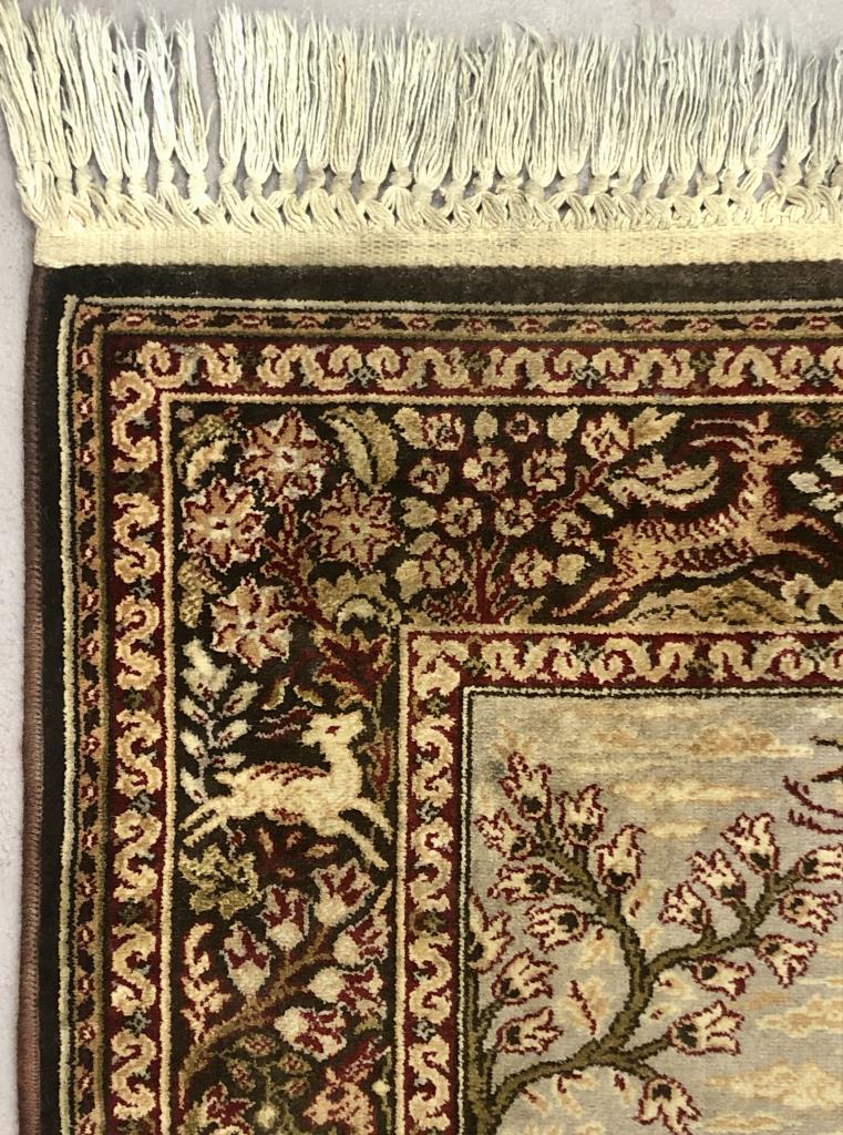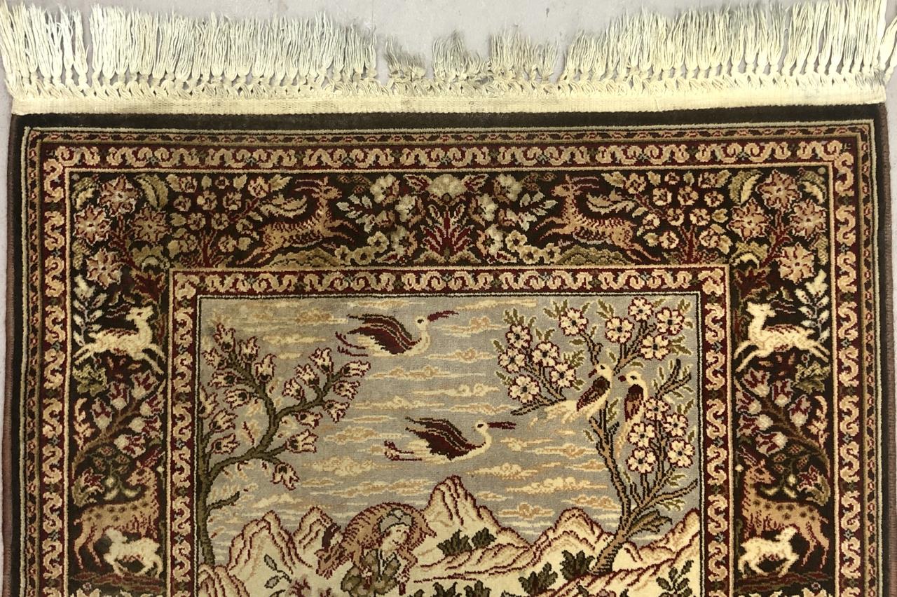 Belgian wool rug with Persian inspired pictorial hunting scene, label on back, mid to late 20th Century, machine-made, approximately 4’3″ x 2’8″.