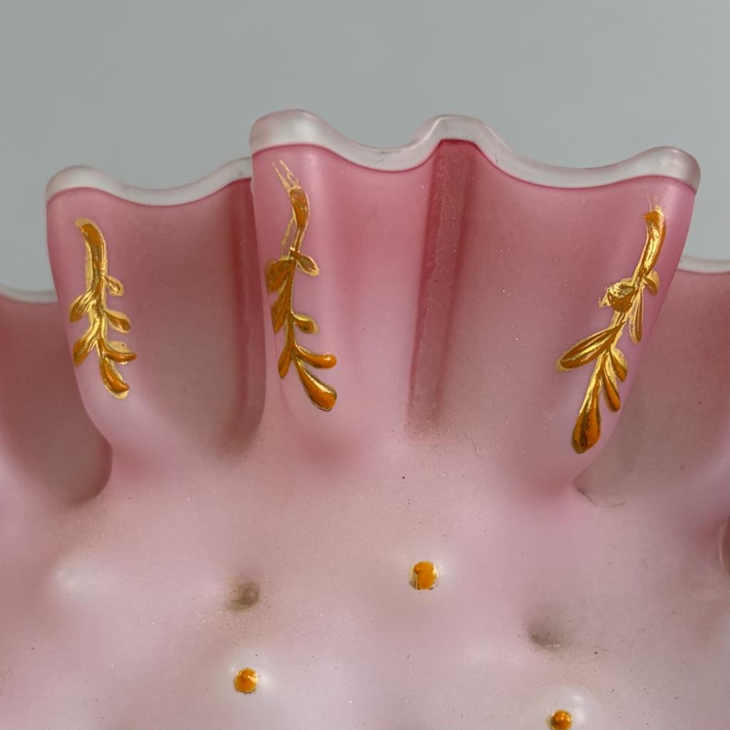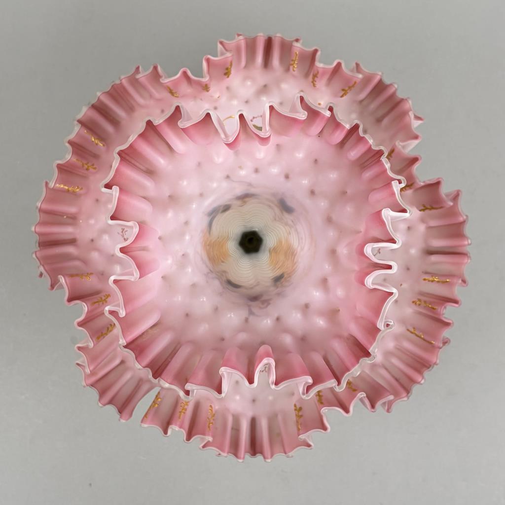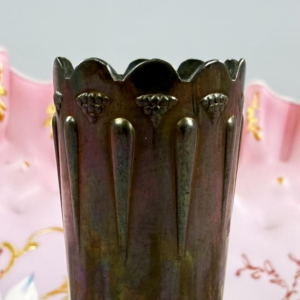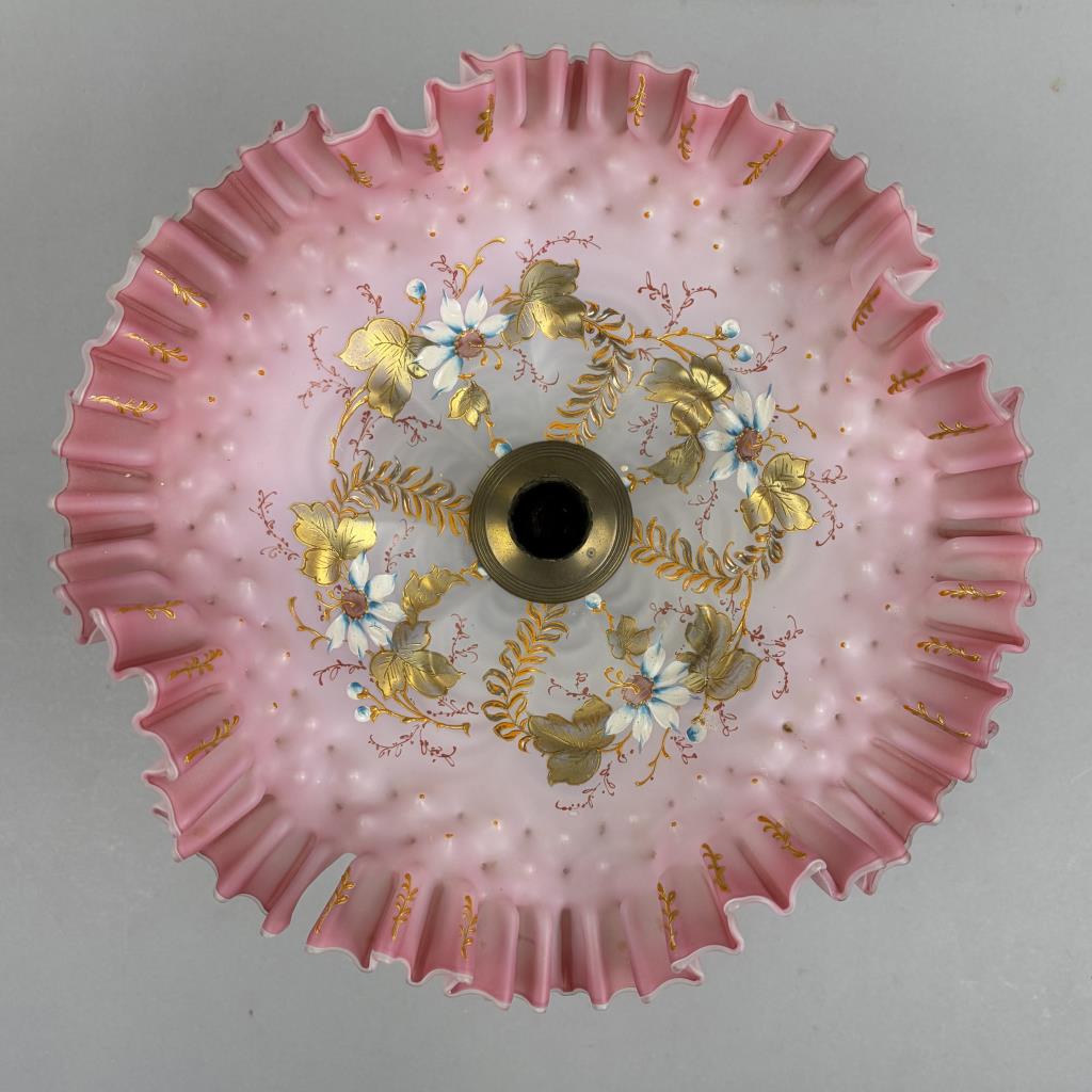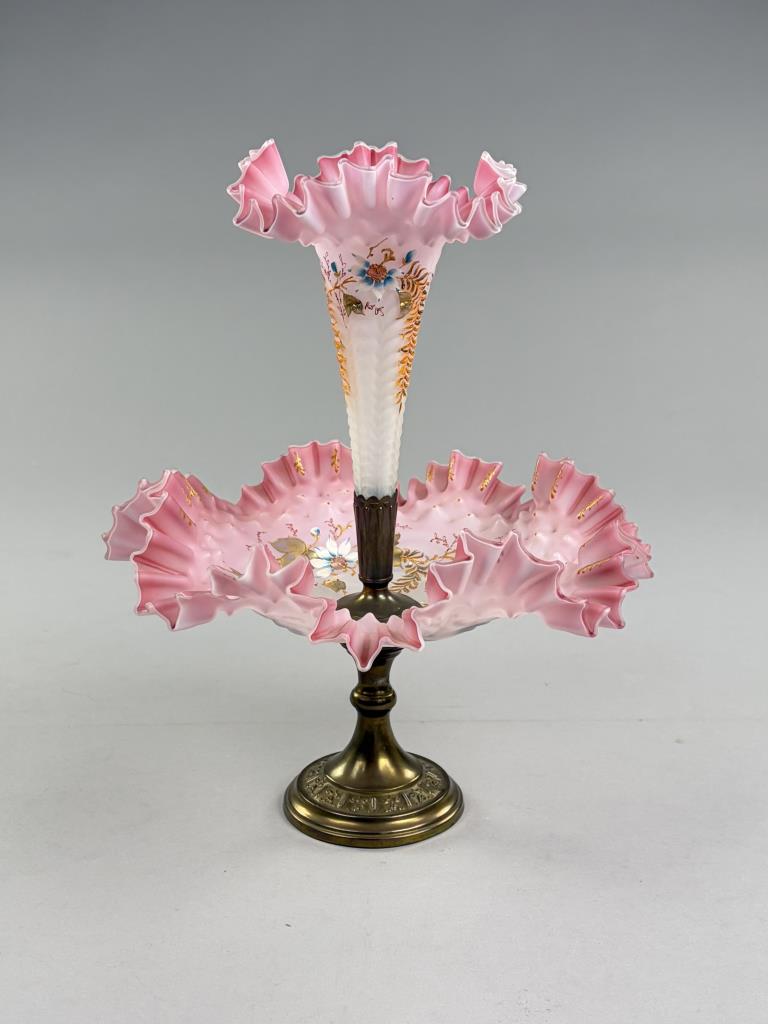 Antique Victorian Era epergne, enameled pink satin glass on a brass base, circa late 19th Century, 16″ (H).