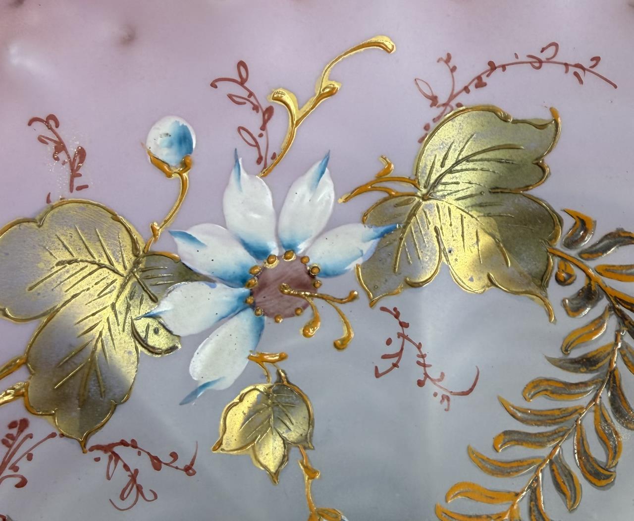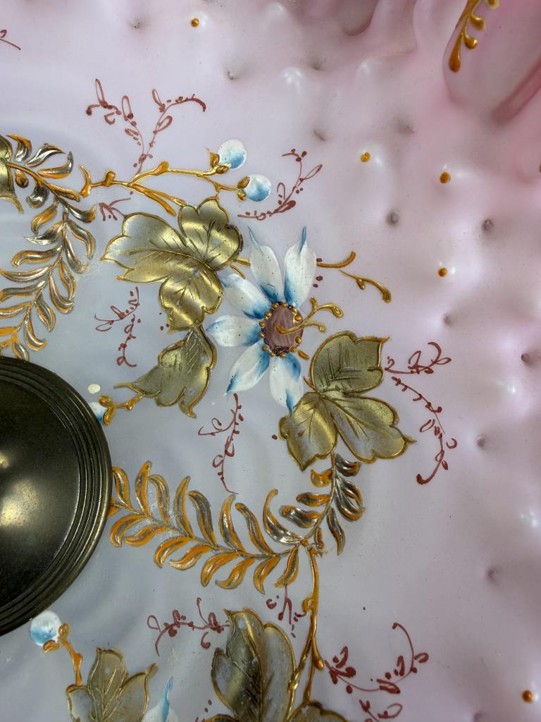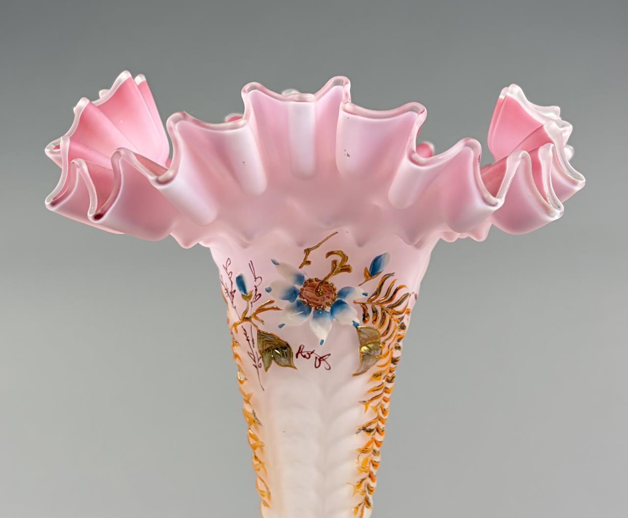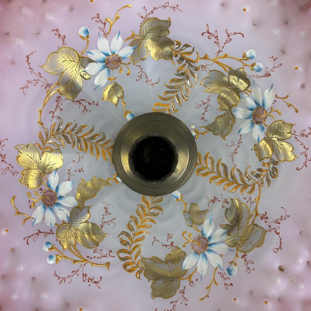 Antique Victorian Era epergne, enameled pink satin glass on a brass base, circa late 19th Century, 16″ (H).