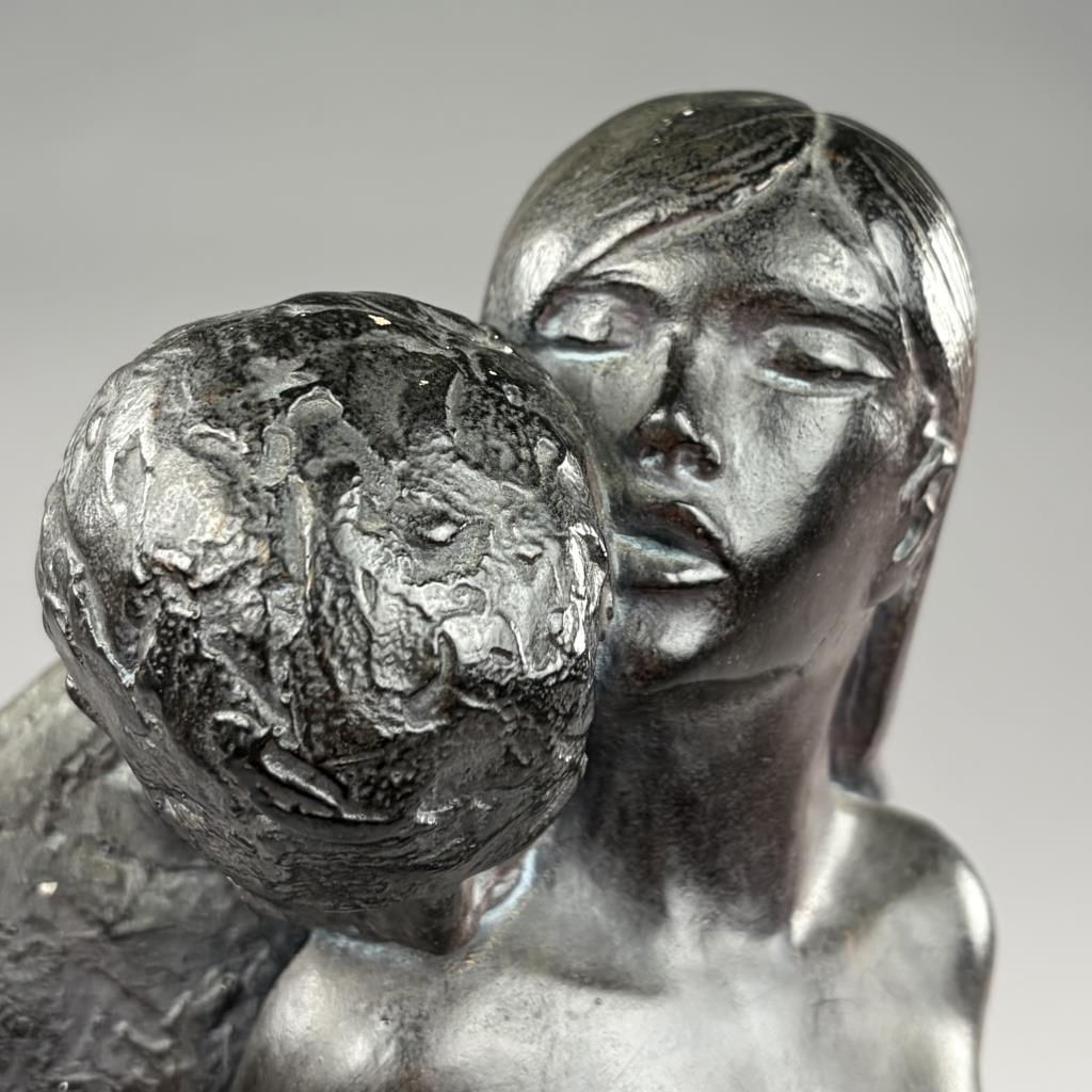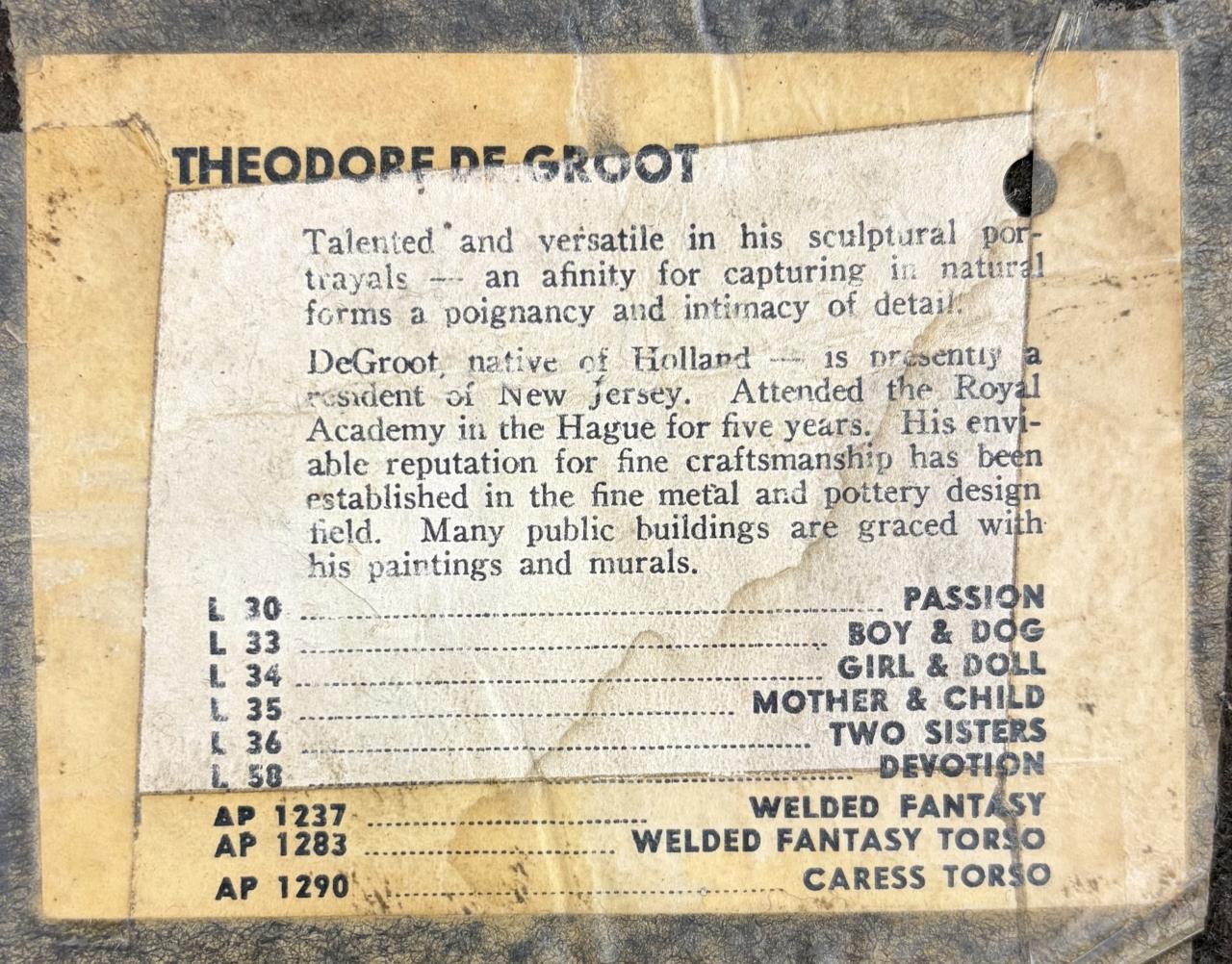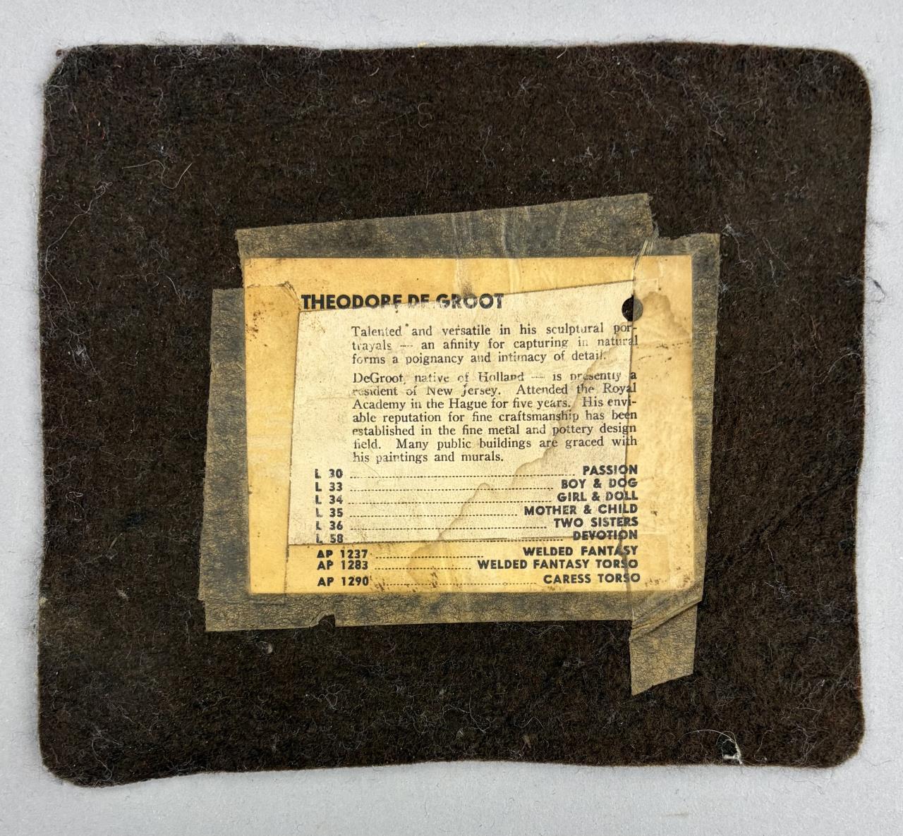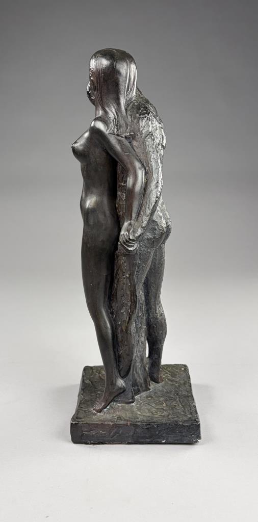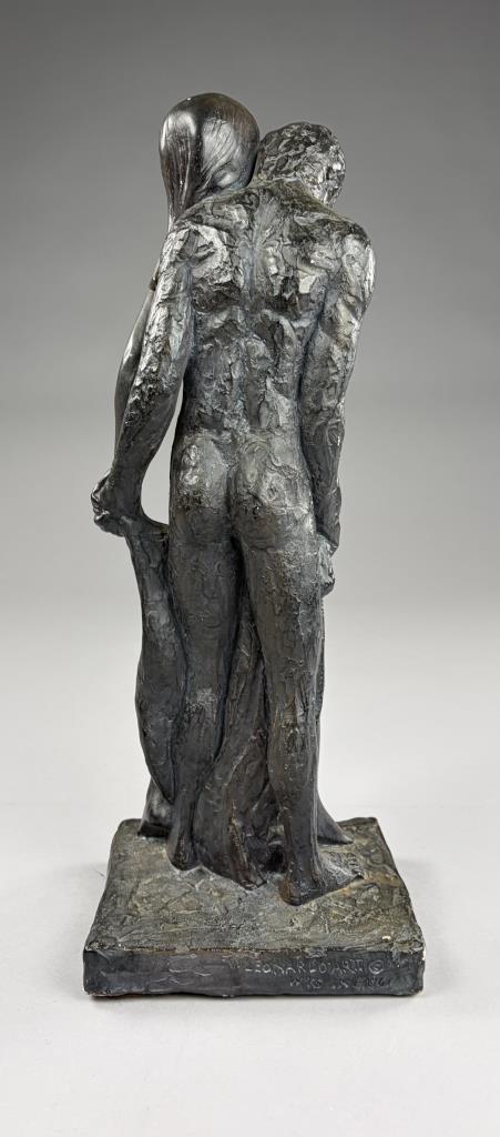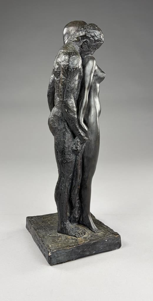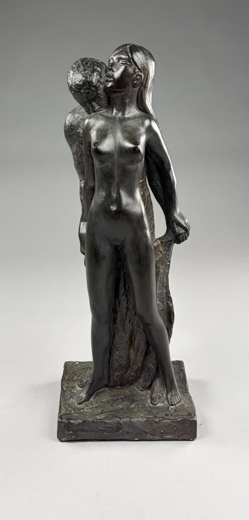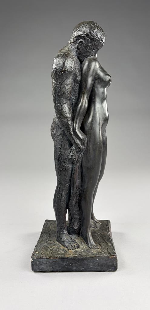 Theodore DeGroot (Dutch/American, 1920-2019), Mid Century Modern sculpture, titled “Passion” (also known as “Lover’s Embrace” or “The Naked Embrace”), 1967, plaster composition with bronzed colored finish, paper label on bottom for artist, marked on base “LEONARDO ART W KS INC 1967″, 20-1/2” (H).