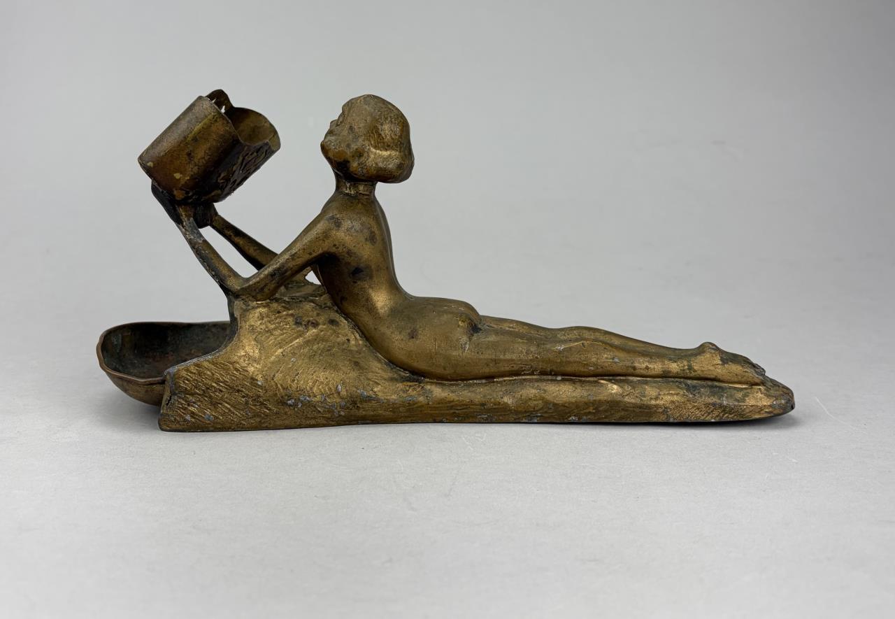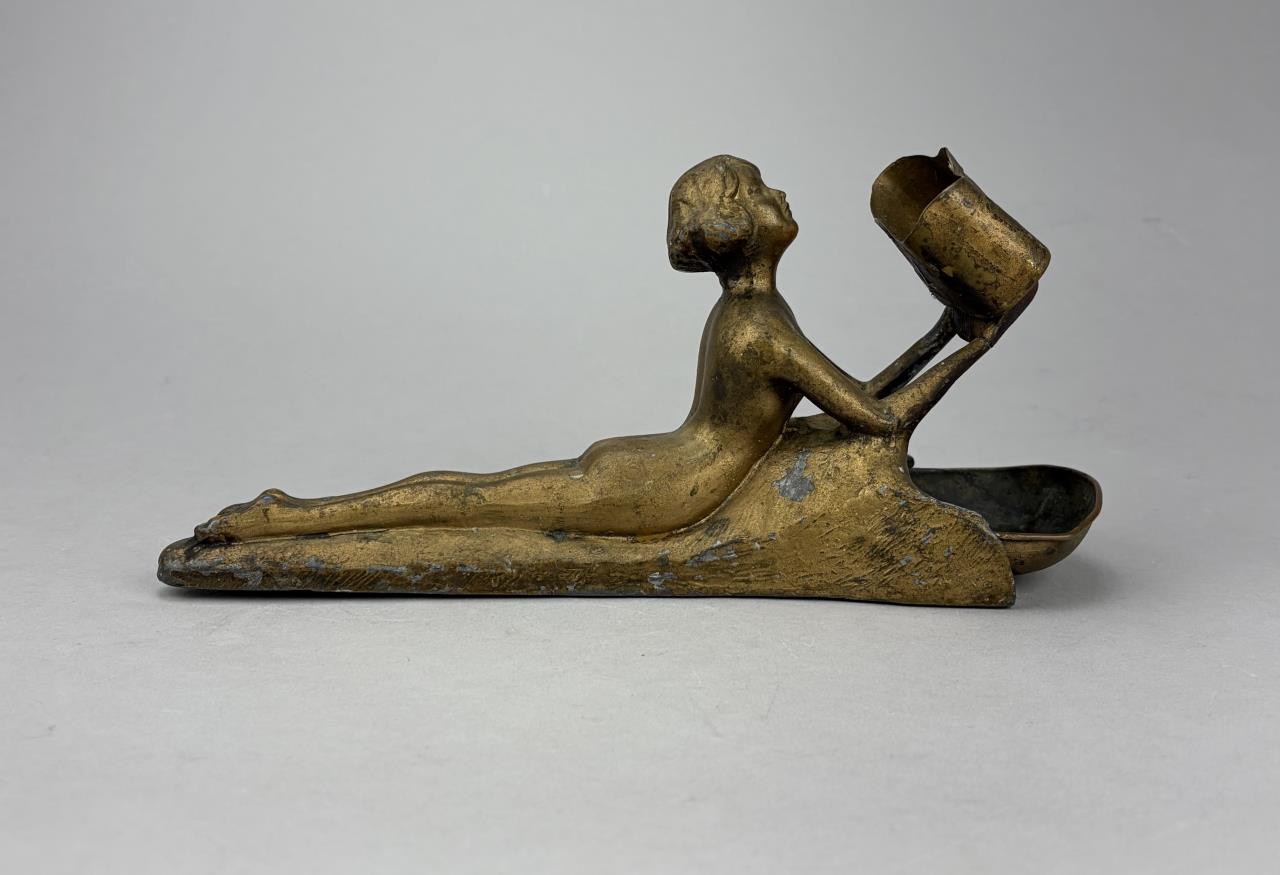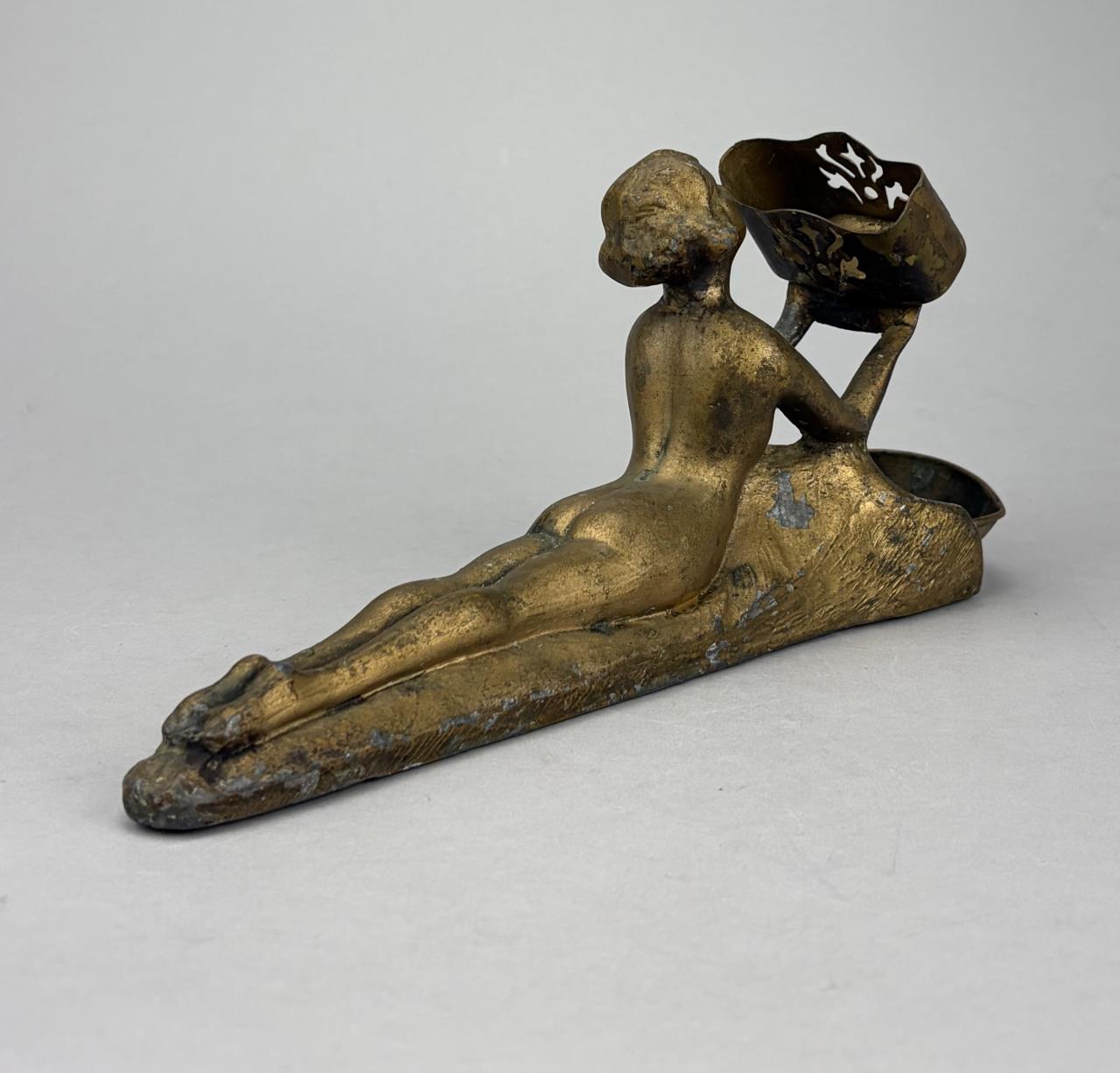 Art Deco figural female nude cigarette holder and ashtray, gilt painted cast metal, circa 1930s, 11″ (L).