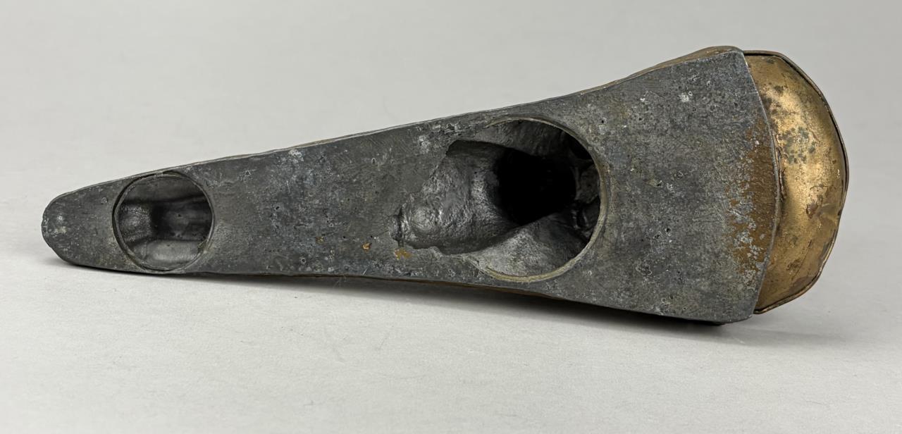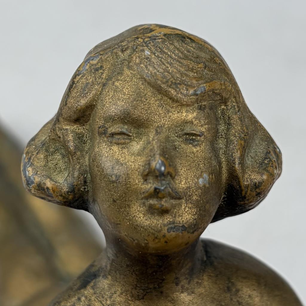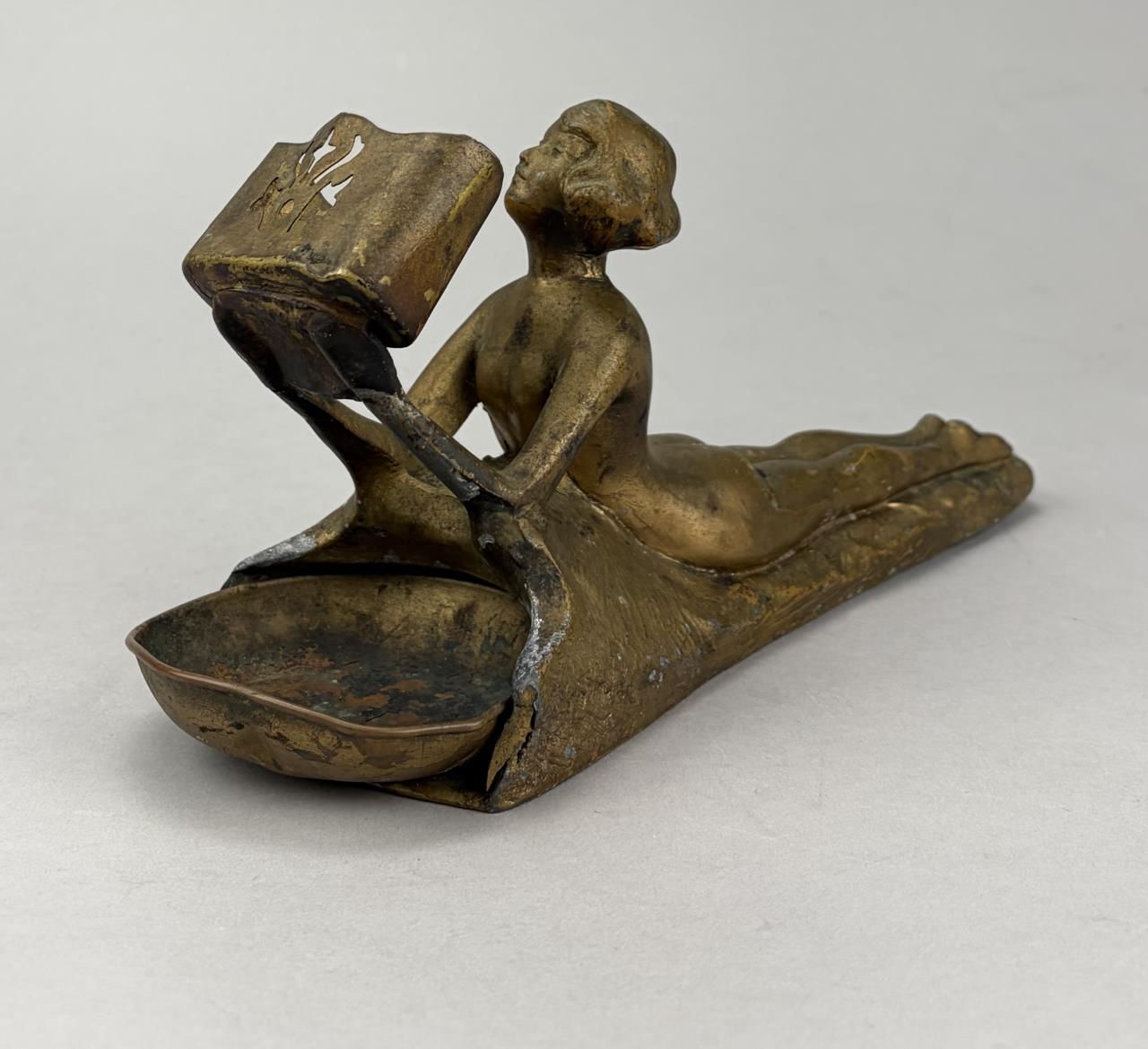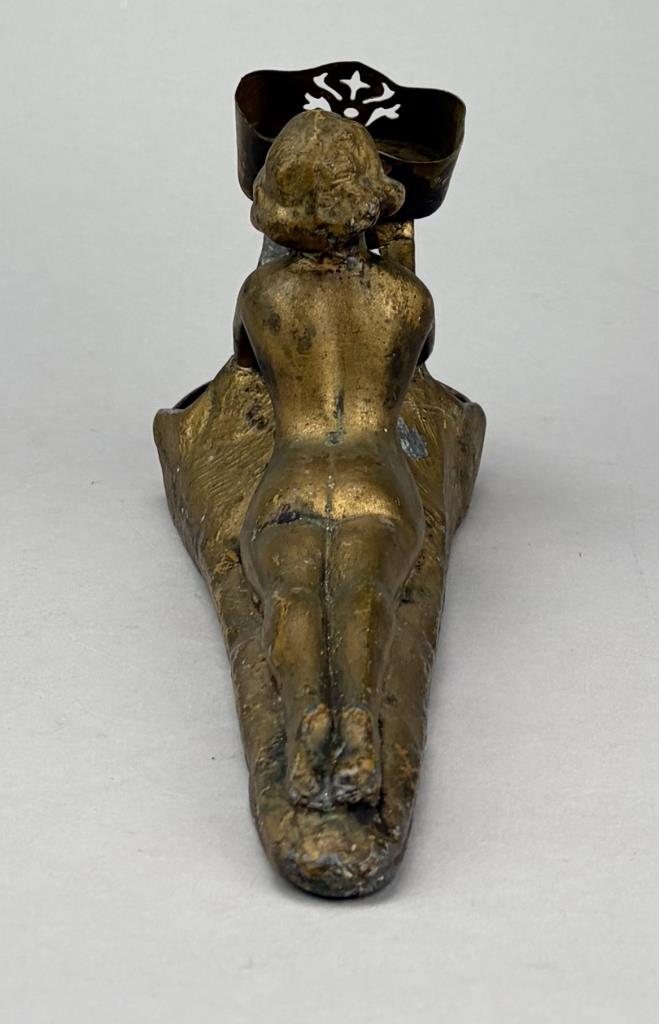 Art Deco figural female nude cigarette holder and ashtray, gilt painted cast metal, circa 1930s, 11″ (L).