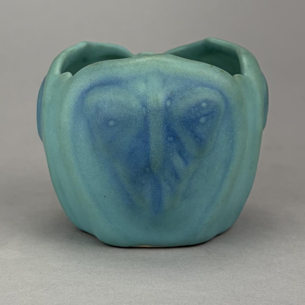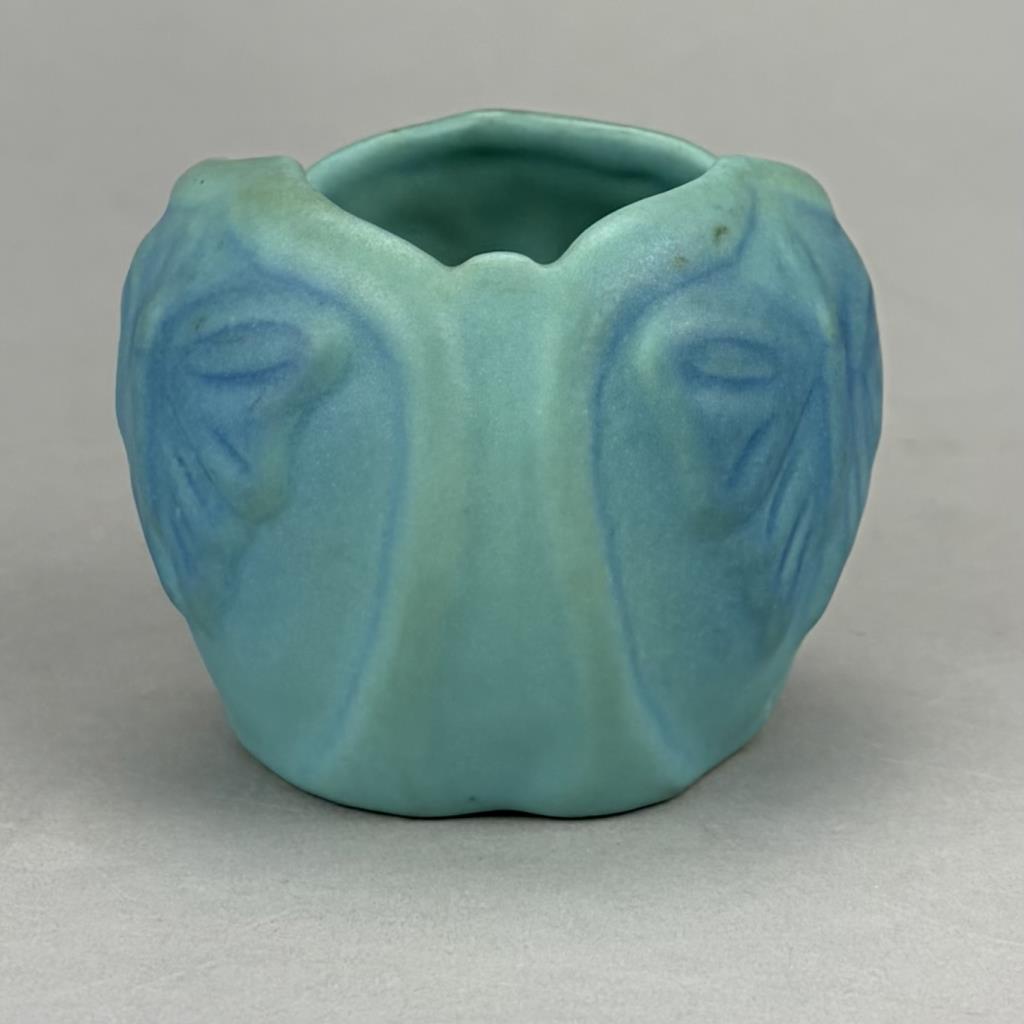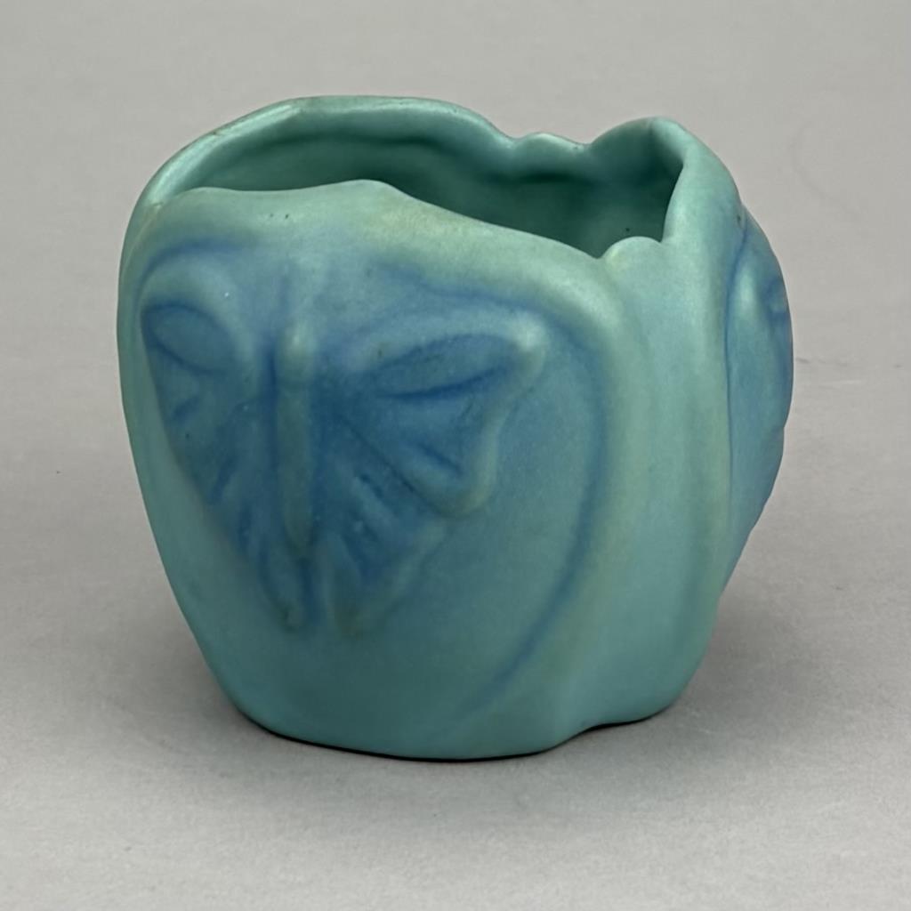 Van Briggle (Colorado Springs, Colorado), embossed butterfly vase, in Ming Turquoise, etched marks on bottom, 3″ (H).