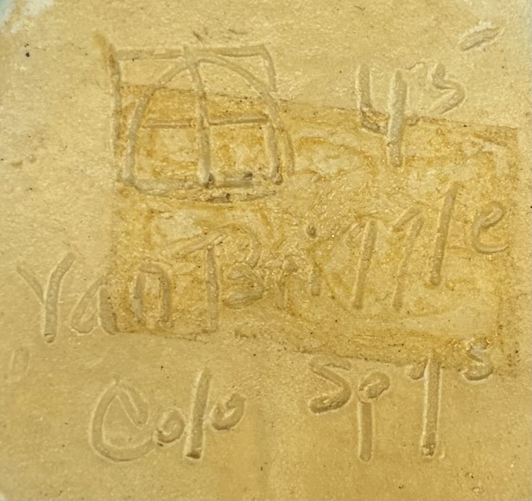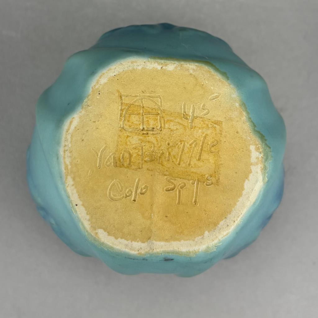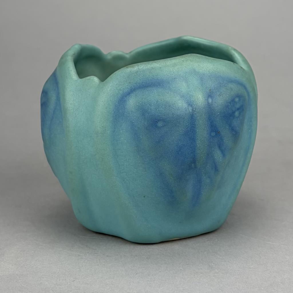 Van Briggle (Colorado Springs, Colorado), embossed butterfly vase, in Ming Turquoise, etched marks on bottom, 3″ (H).
