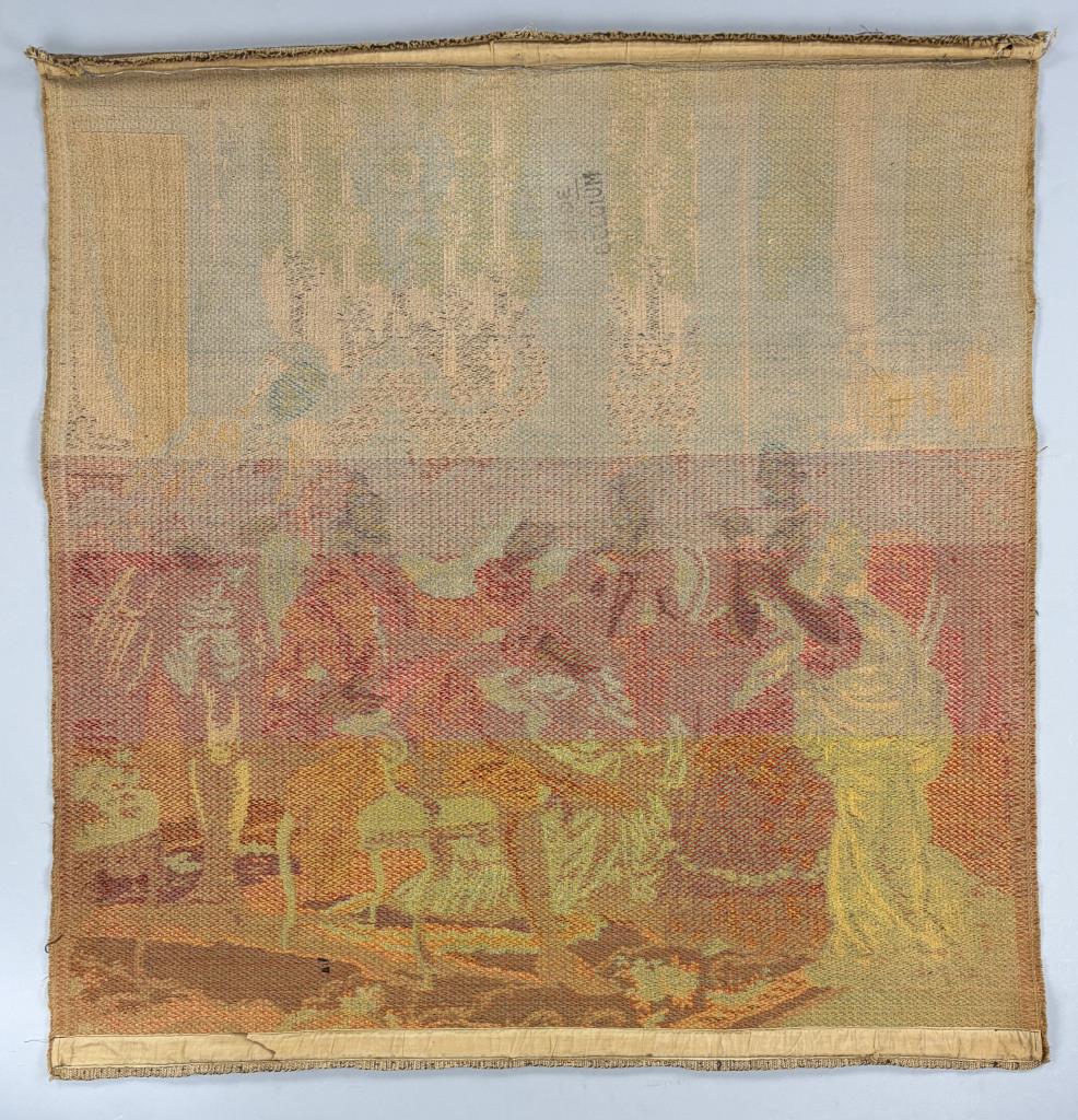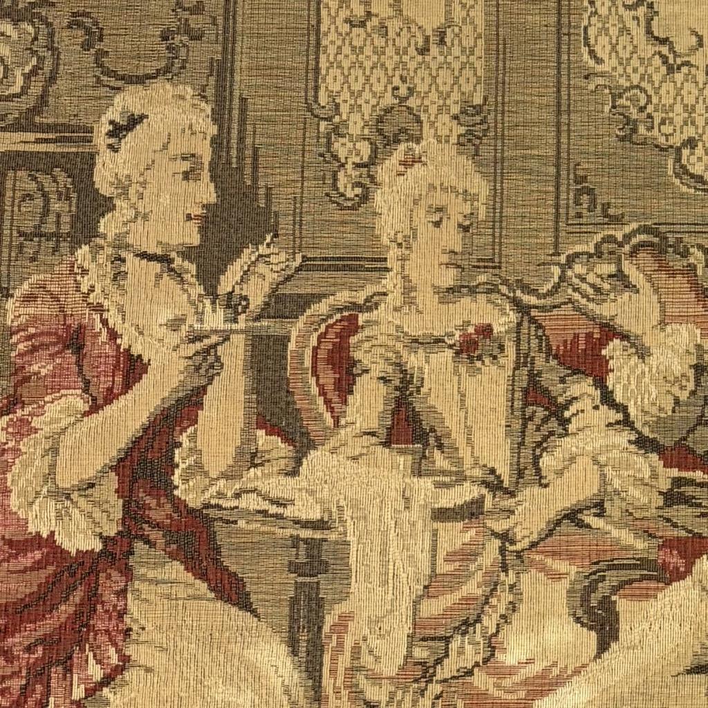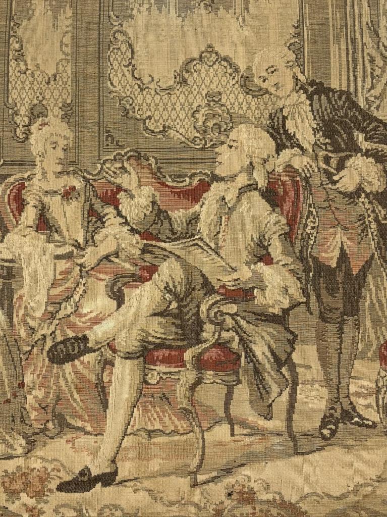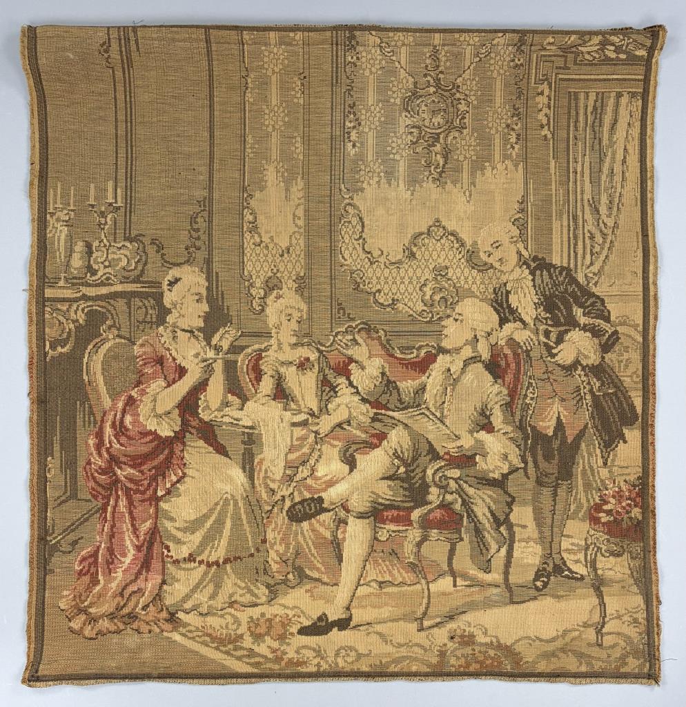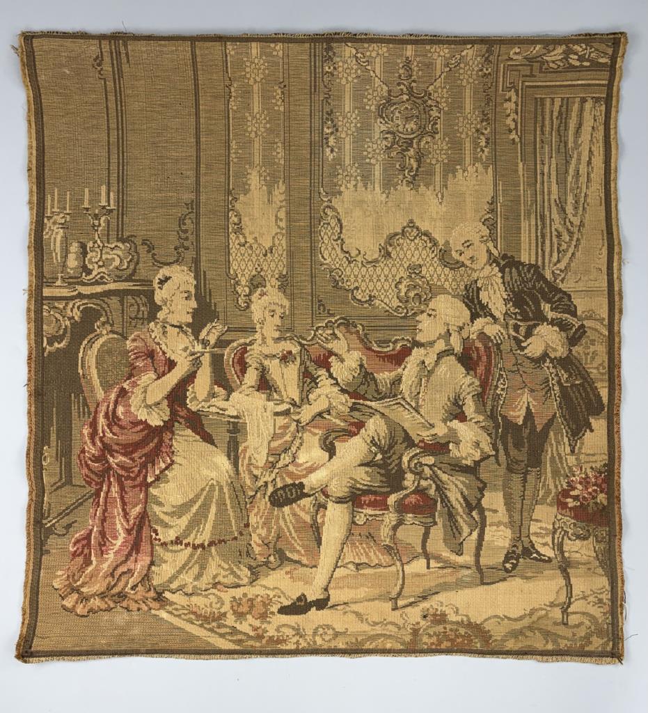 Belgian Aubusson style Jacquard woven pictorial tapestry, depicting an 18th Century courtly scene, most likely a wool and cotton blend, with pocketed hanging rods at both the top and bottom, 20th Century, 38″ x 36″.