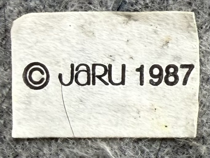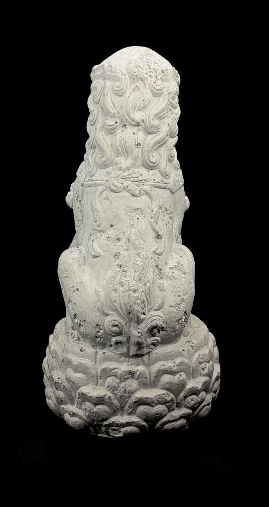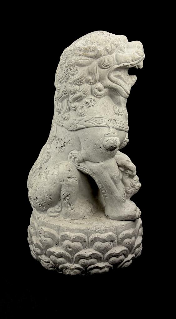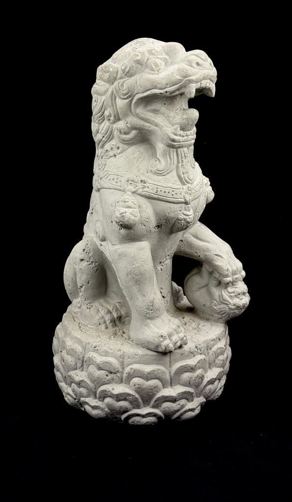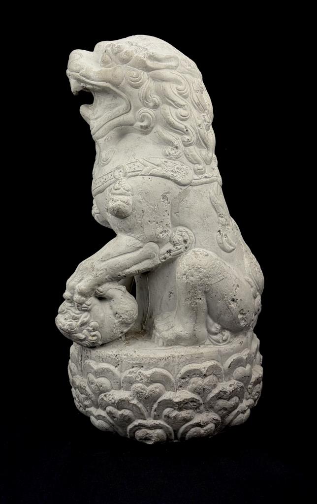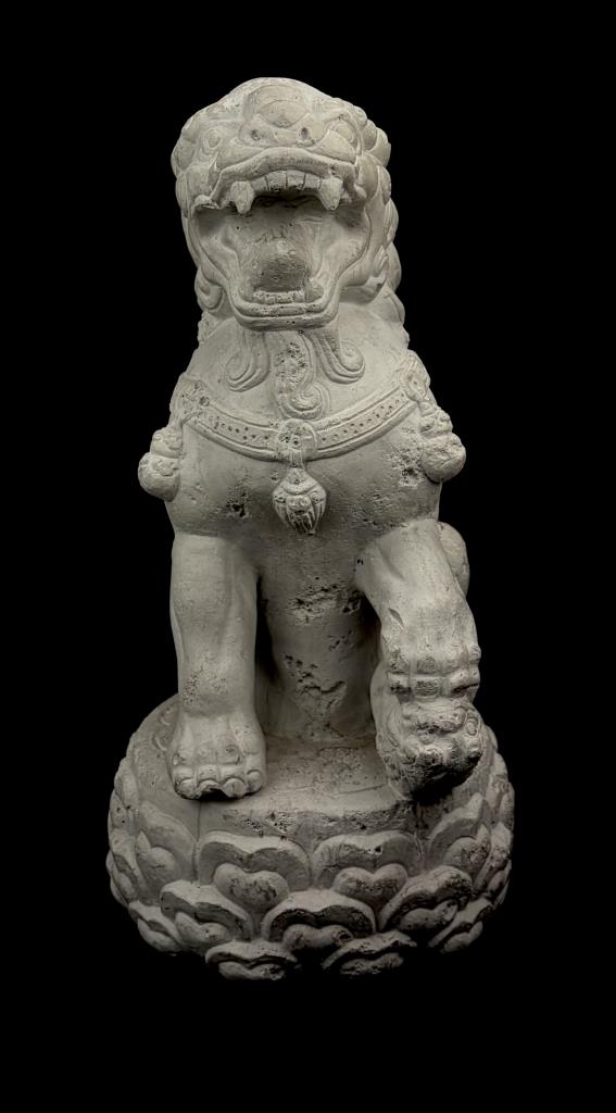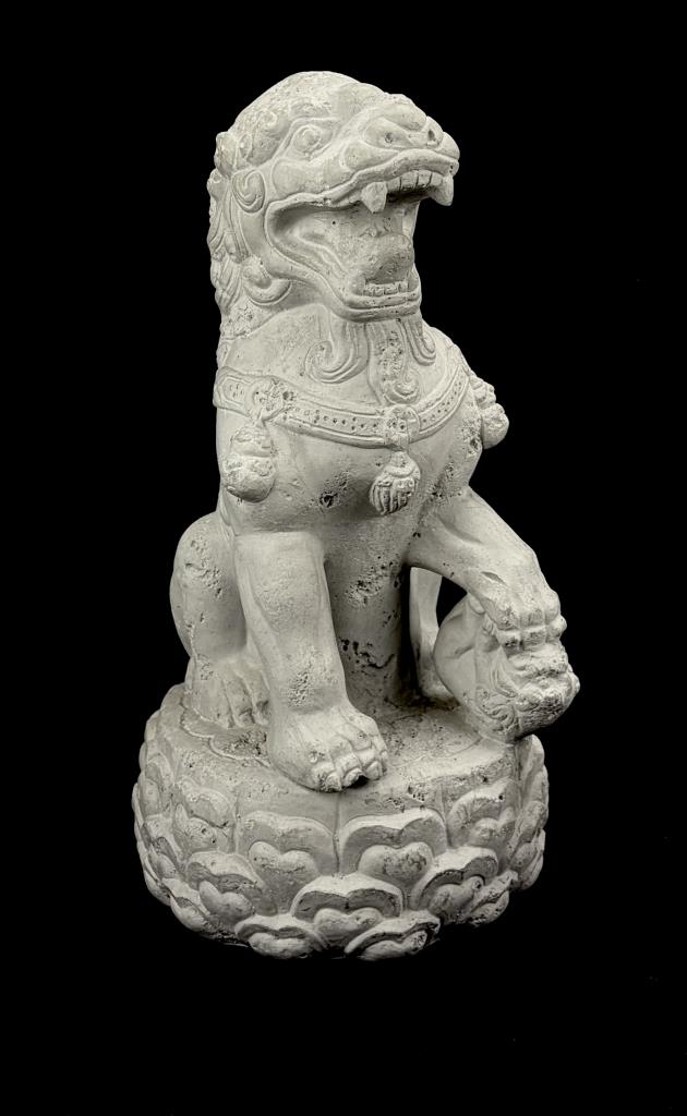 Jaru (Los Angles, California), Chinese guardian Shi lion, also know as a Fu dog or Foo dog, statue, paper label on underside, cast plaster, 14-5/8″ (H).