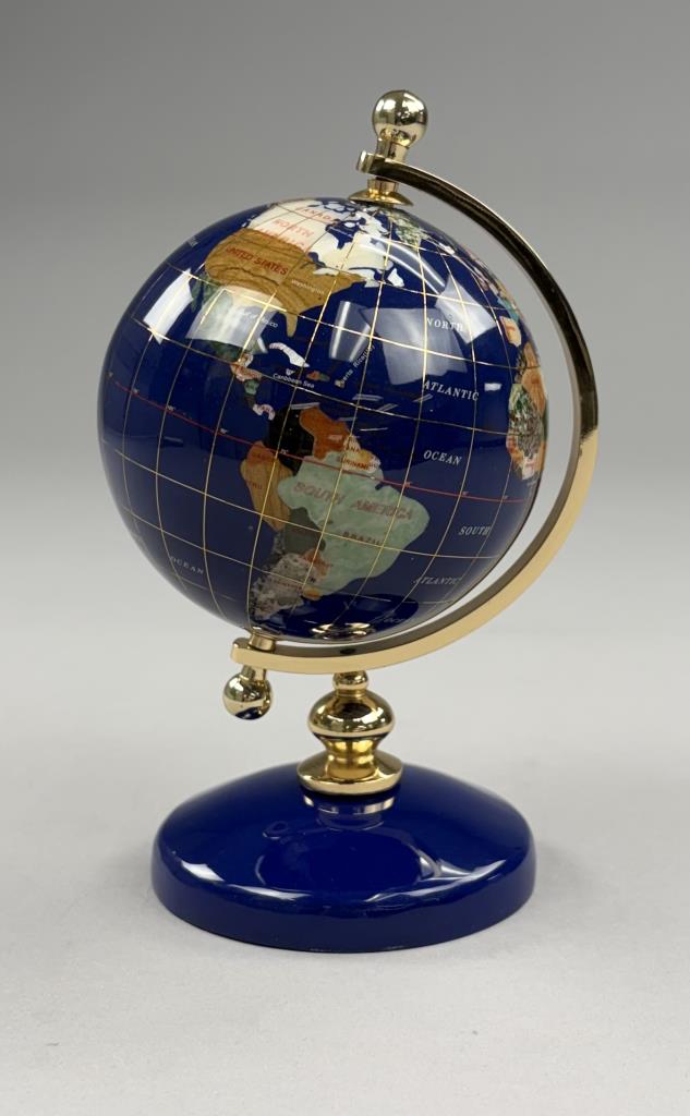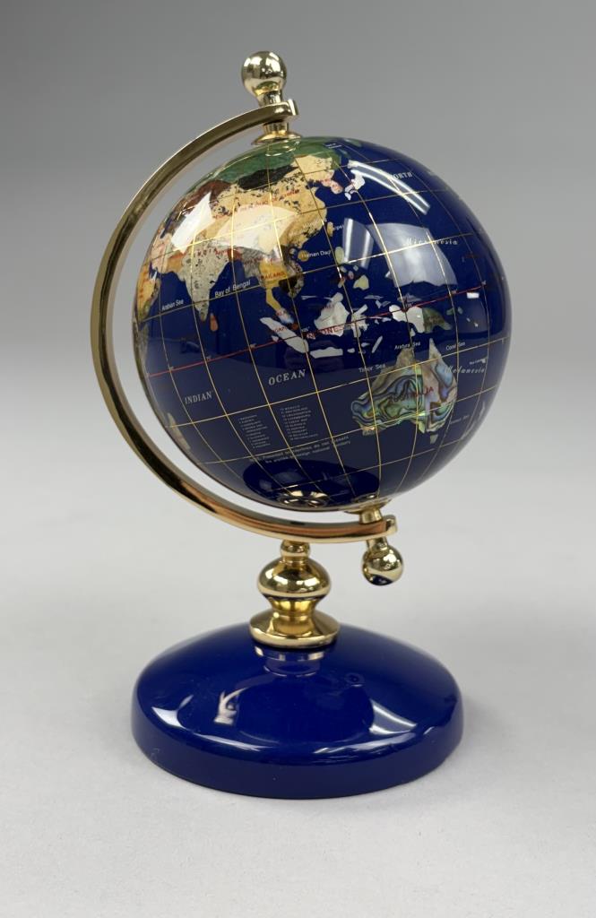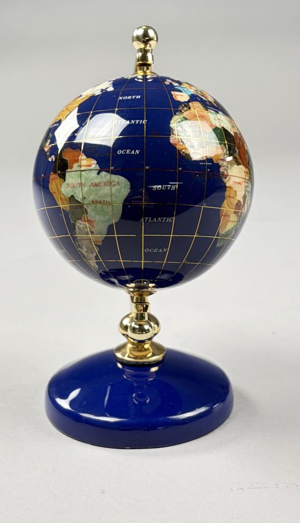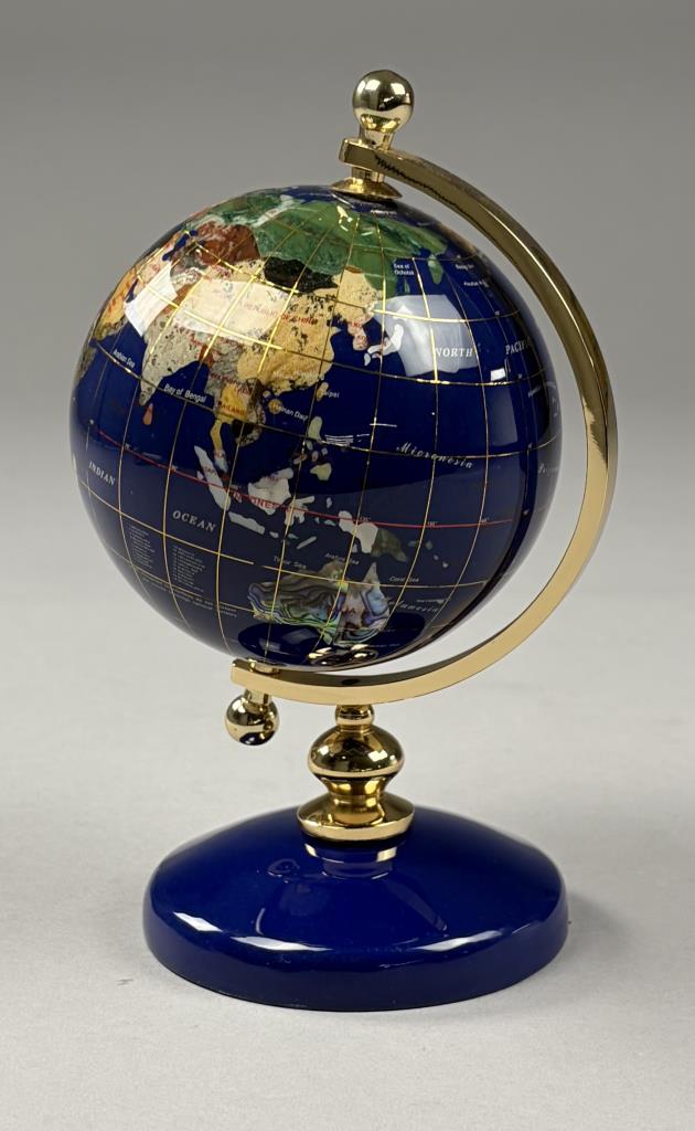 Inlaid globe with lapis, gemstones, and shells on stand, 8″ (H – including stand).