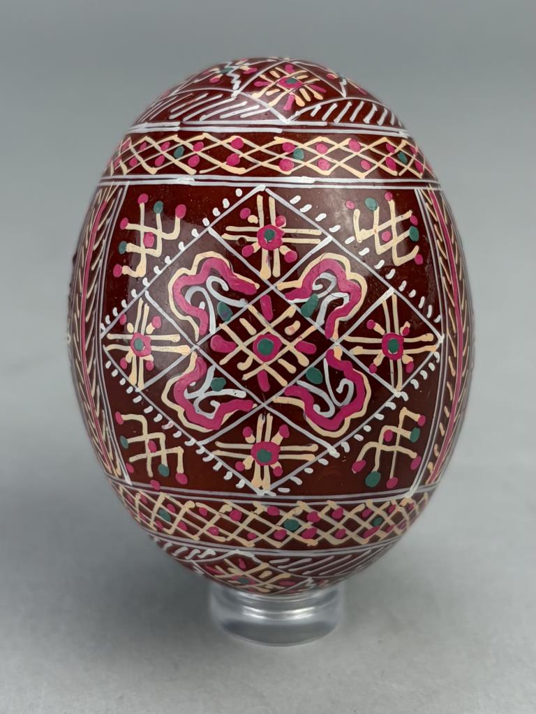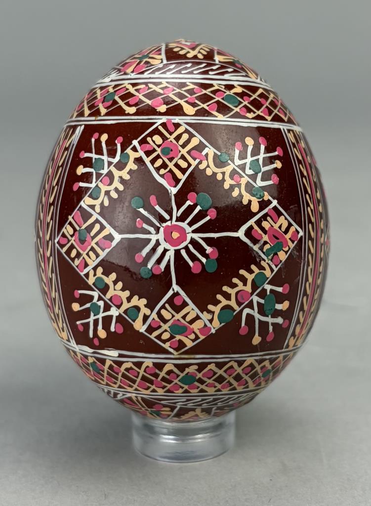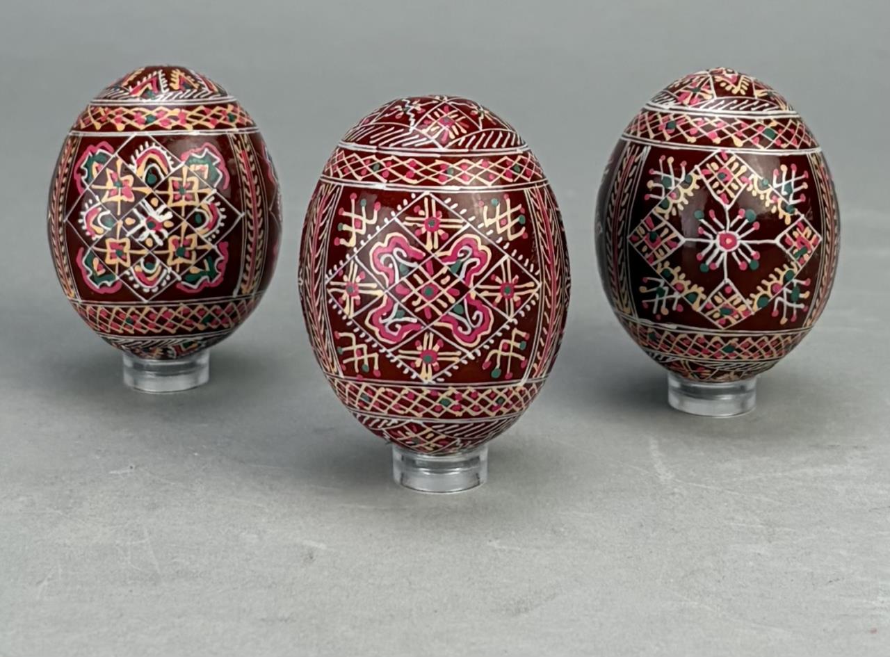 Three traditional style Ukrainian Easter eggs, also known as “Pysanky”, hand-painted wood, lucite stands not included.