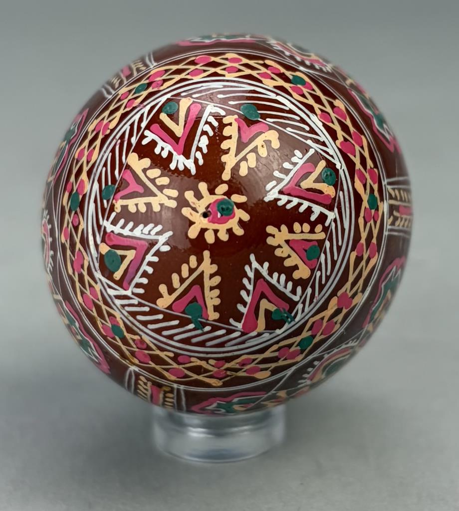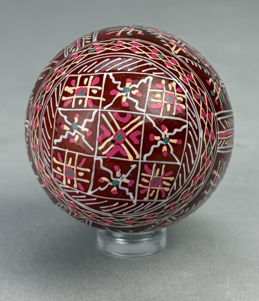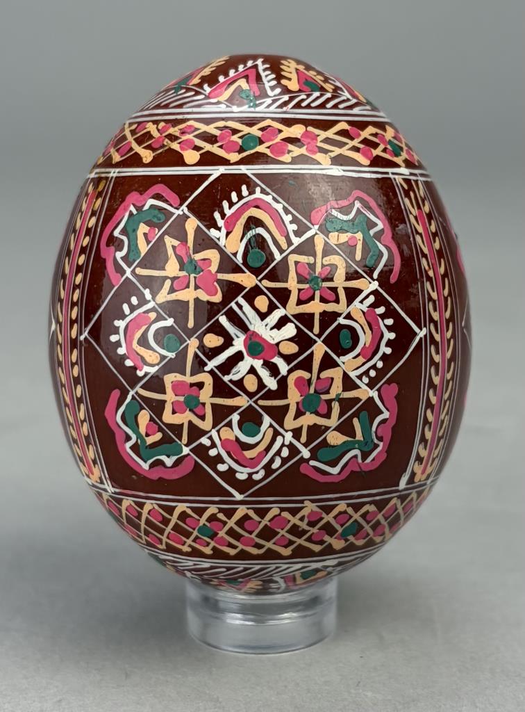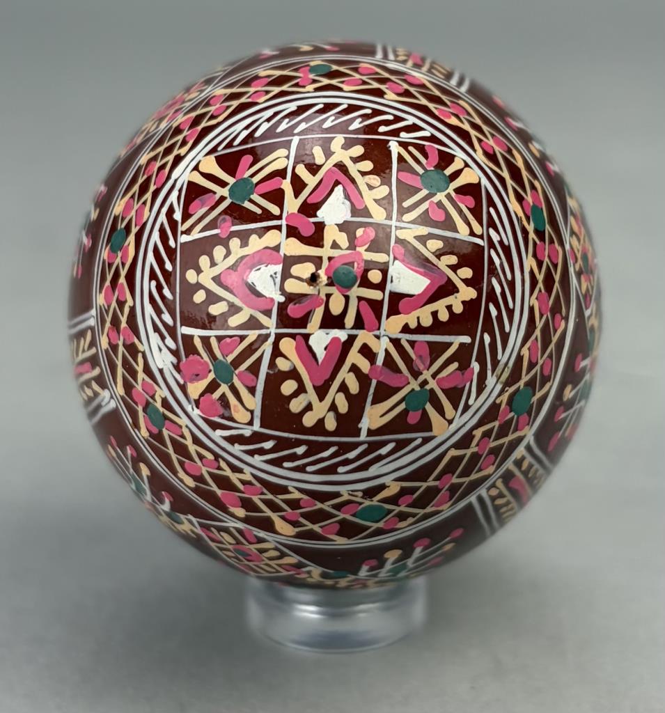 Three traditional style Ukrainian Easter eggs, also known as “Pysanky”, hand-painted wood, lucite stands not included.
