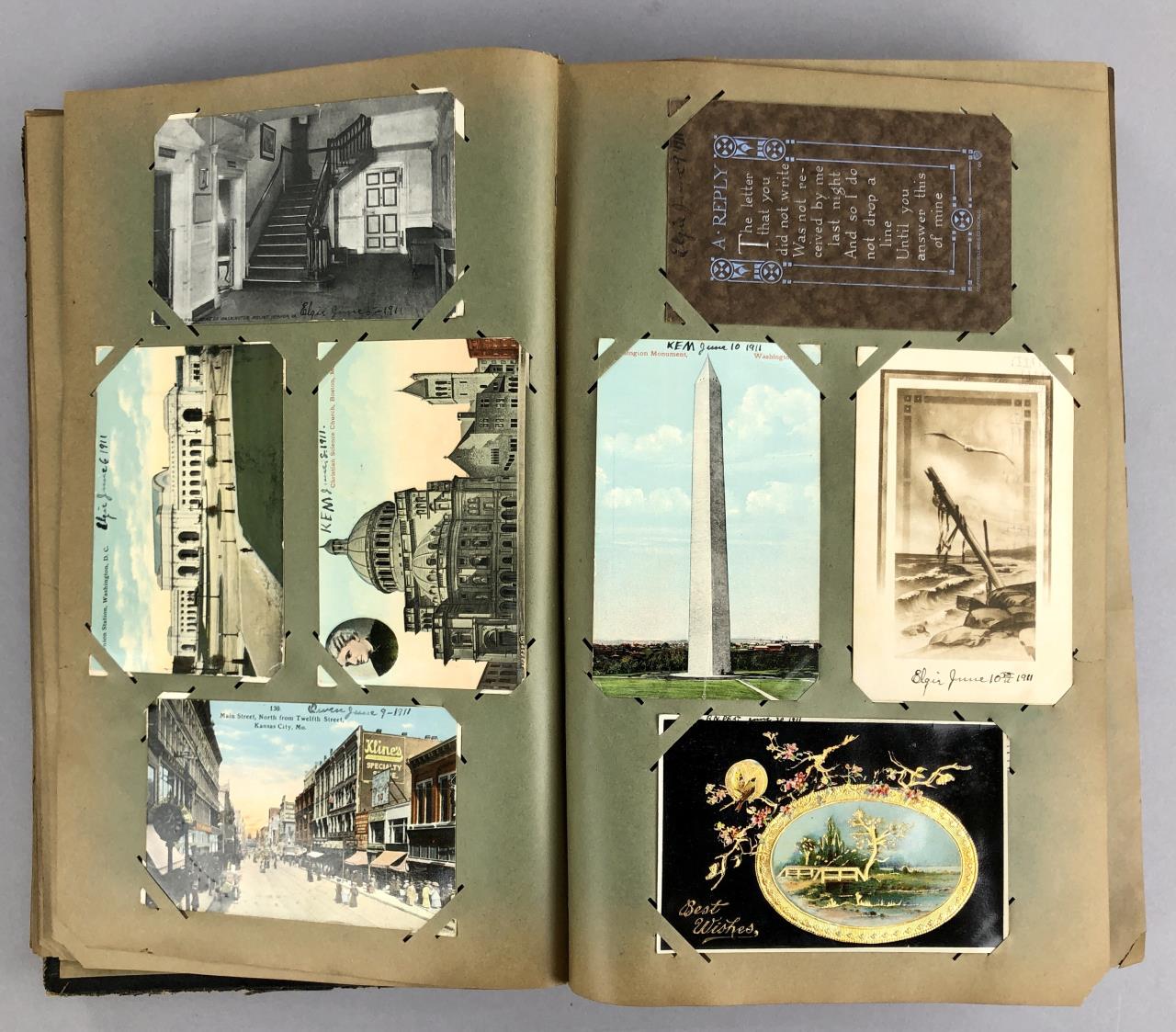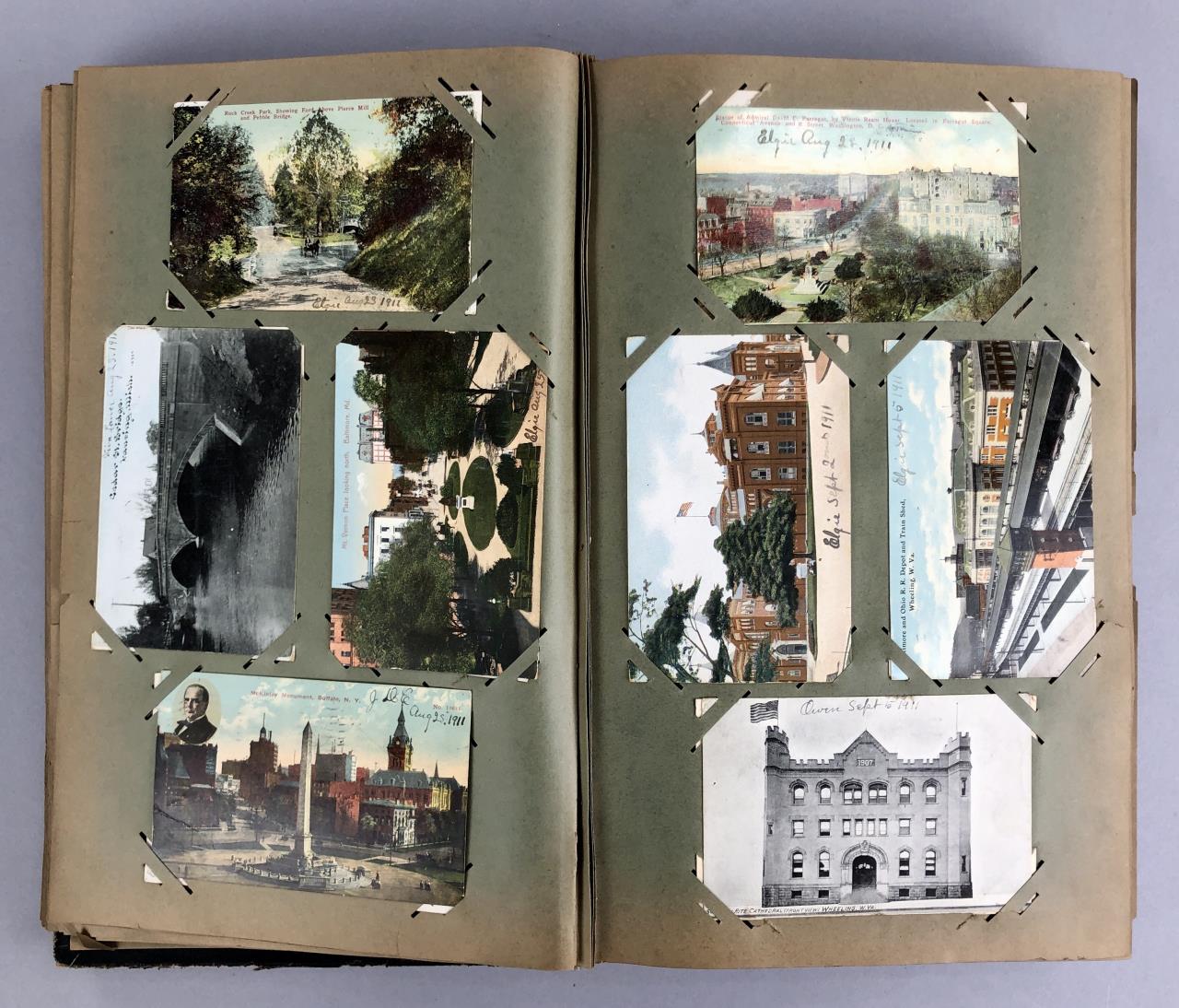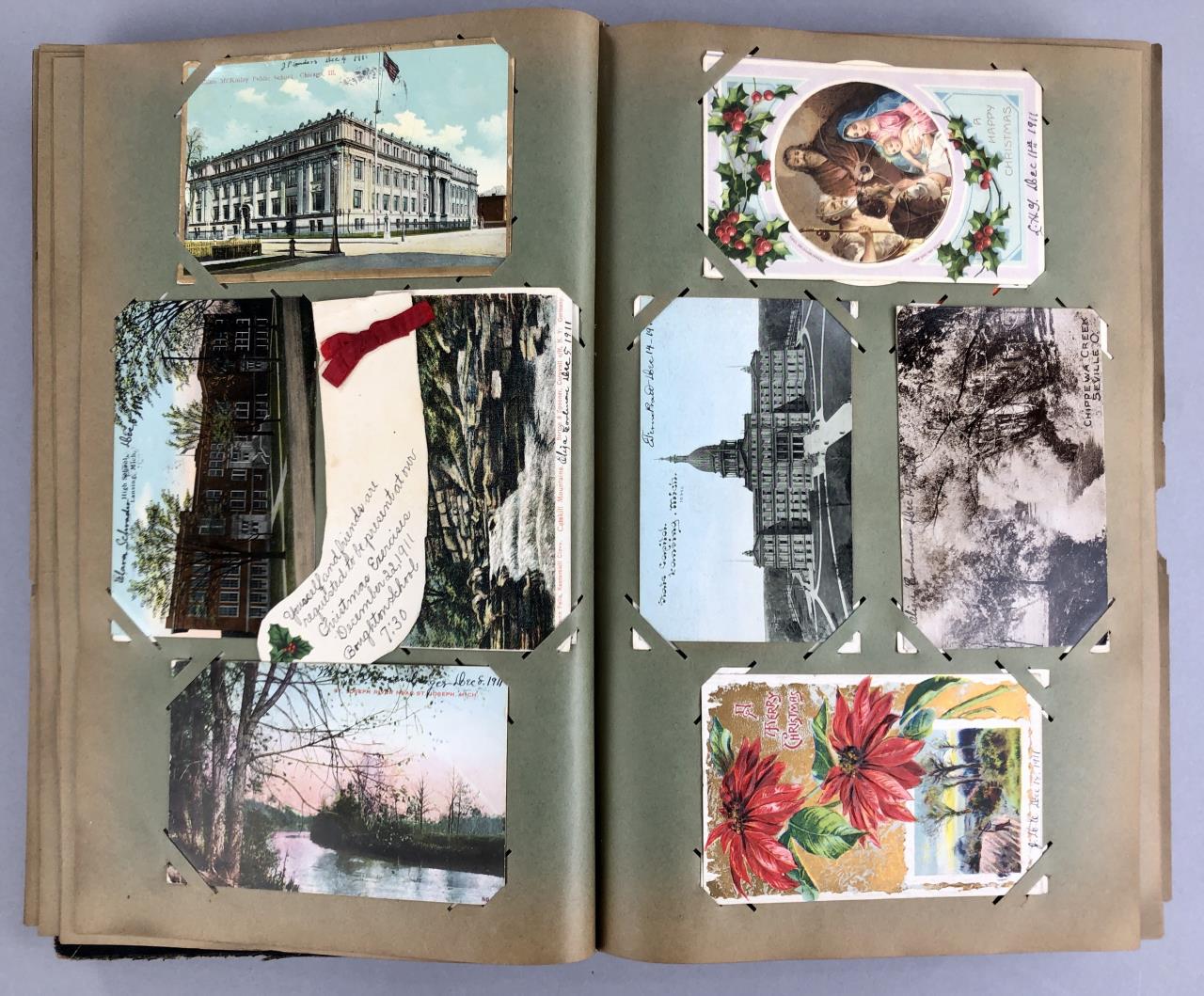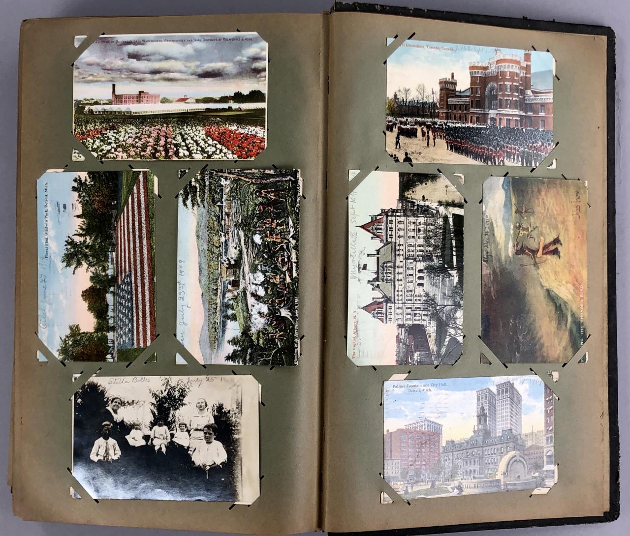 Antique post card album with almost 500 post cards, some real photos, New Year’s, Christmas, Fourth of July, Thanksgiving, Detroit, Grand Ledge, Michigan Agriculture College (Michigan State University), Lansing, Michigan, West Virginia, Ohio, stream ships, Washington D.C., Boston, and many more, circa 1905-1915