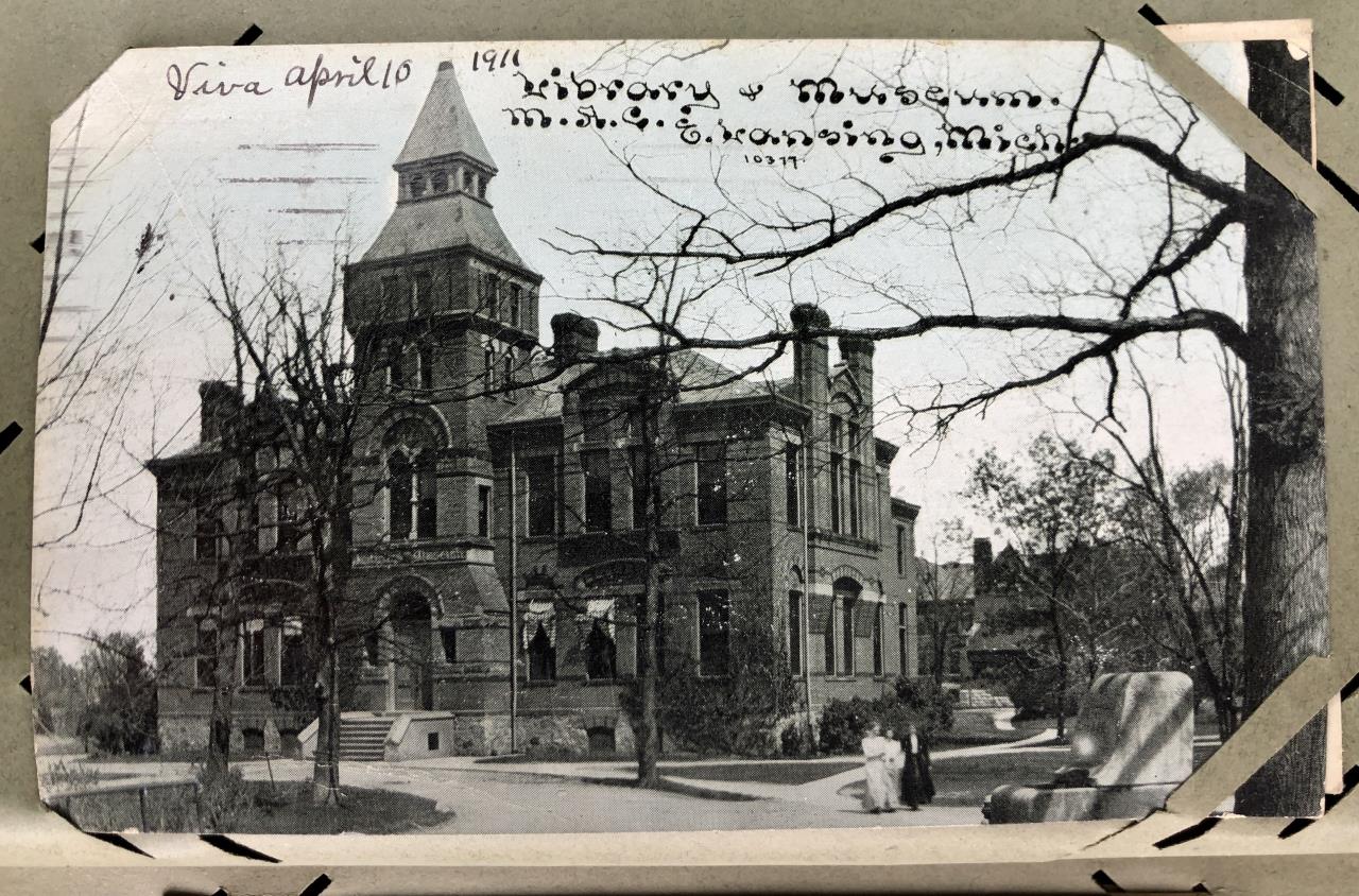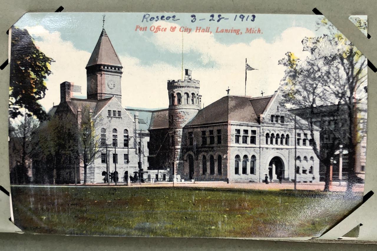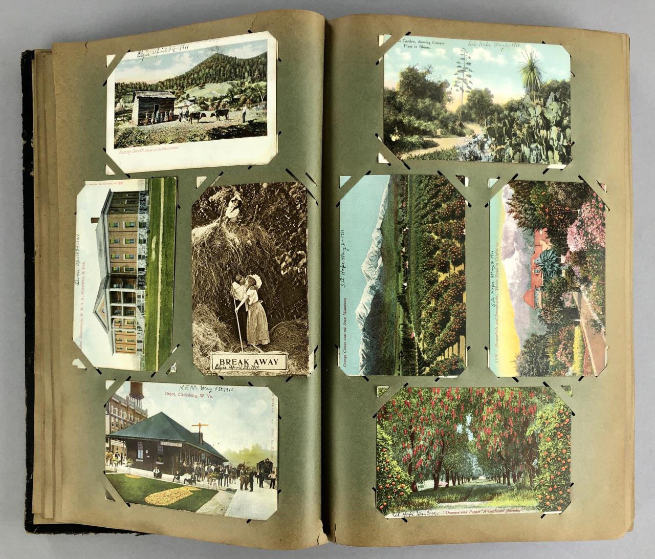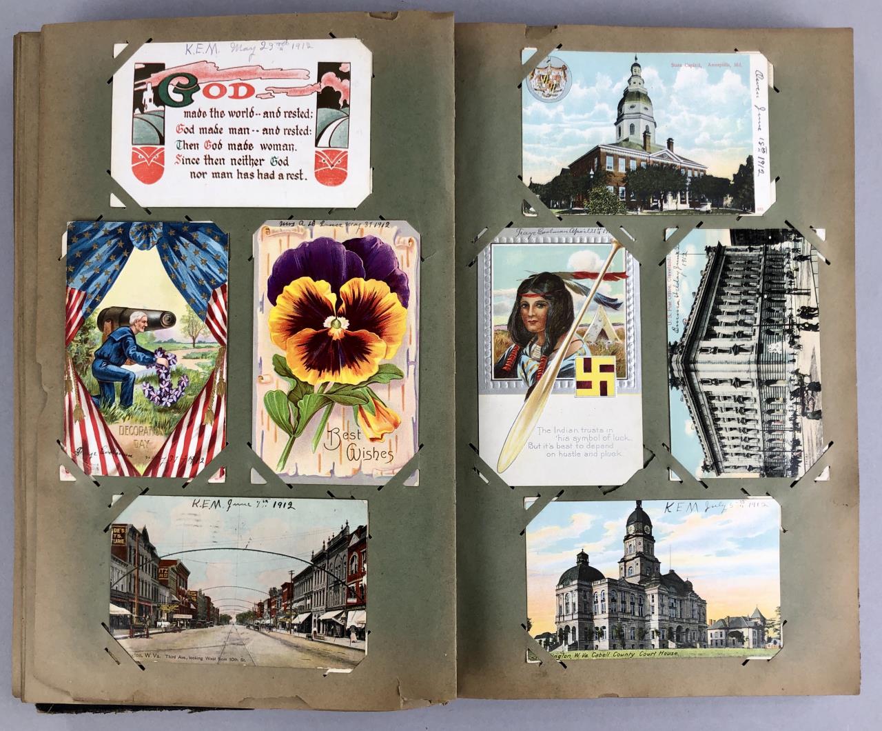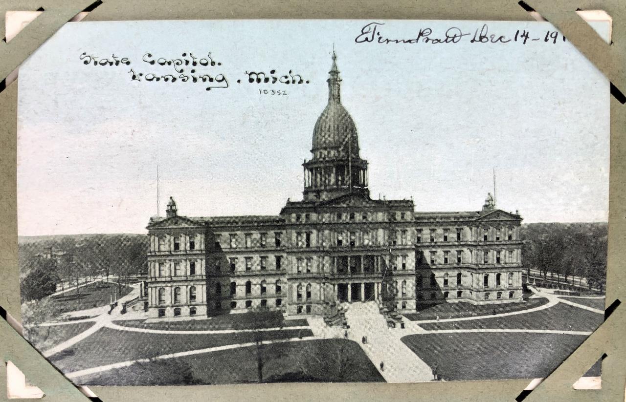 Antique post card album with almost 500 post cards, some real photos, New Year’s, Christmas, Fourth of July, Thanksgiving, Detroit, Grand Ledge, Michigan Agriculture College (Michigan State University), Lansing, Michigan, West Virginia, Ohio, stream ships, Washington D.C., Boston, and many more, circa 1905-1915