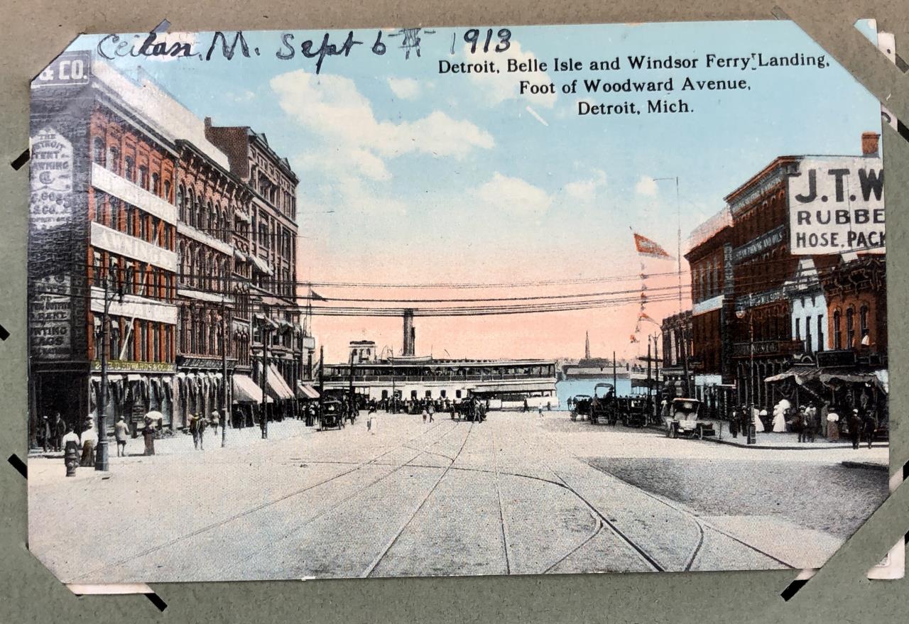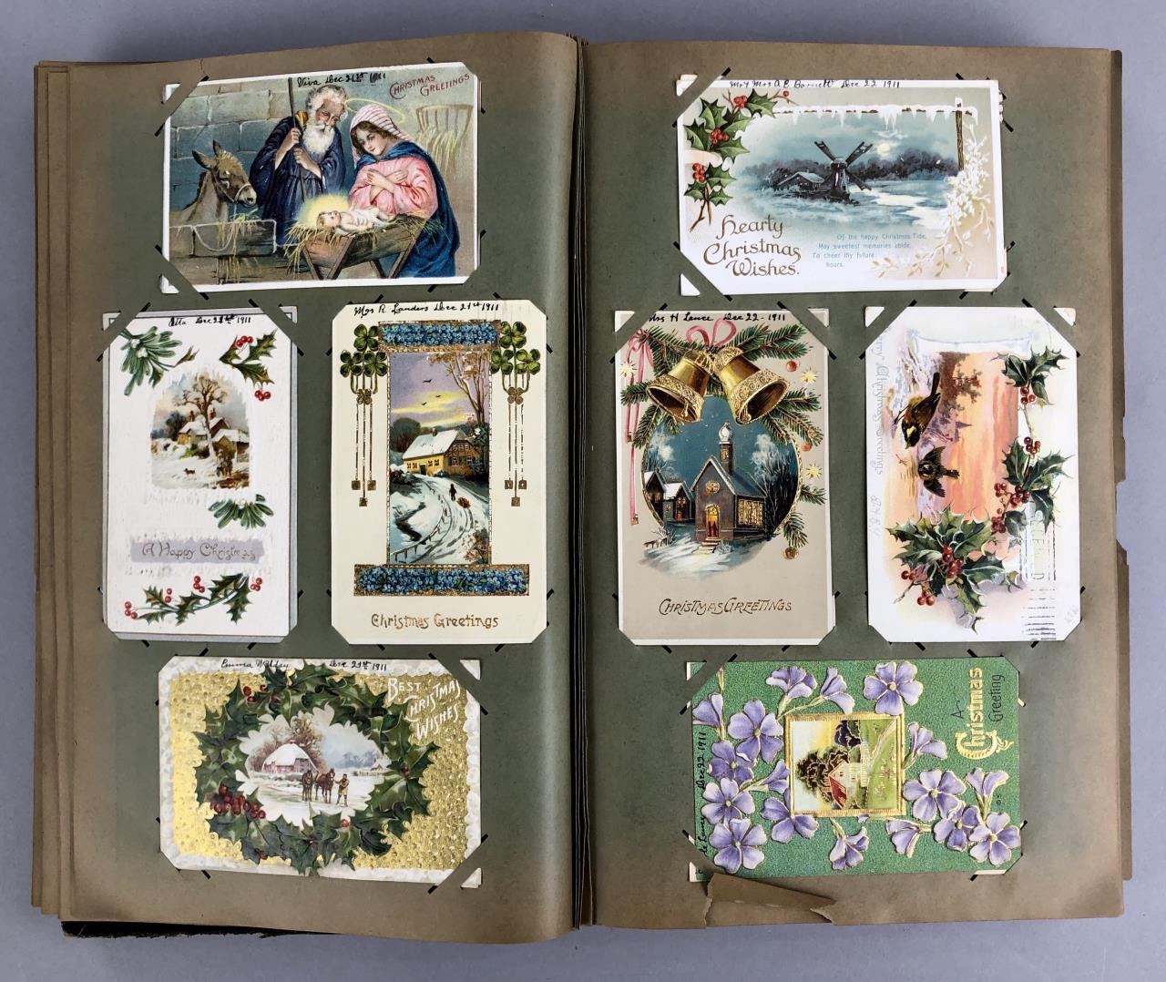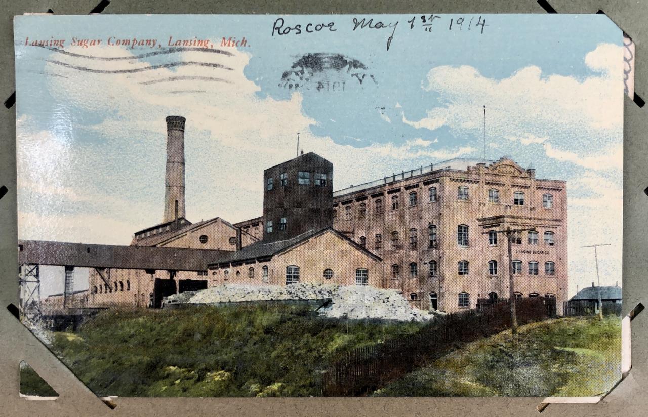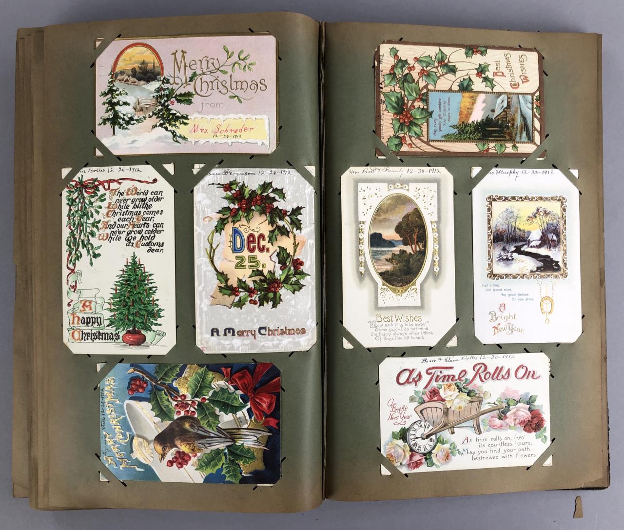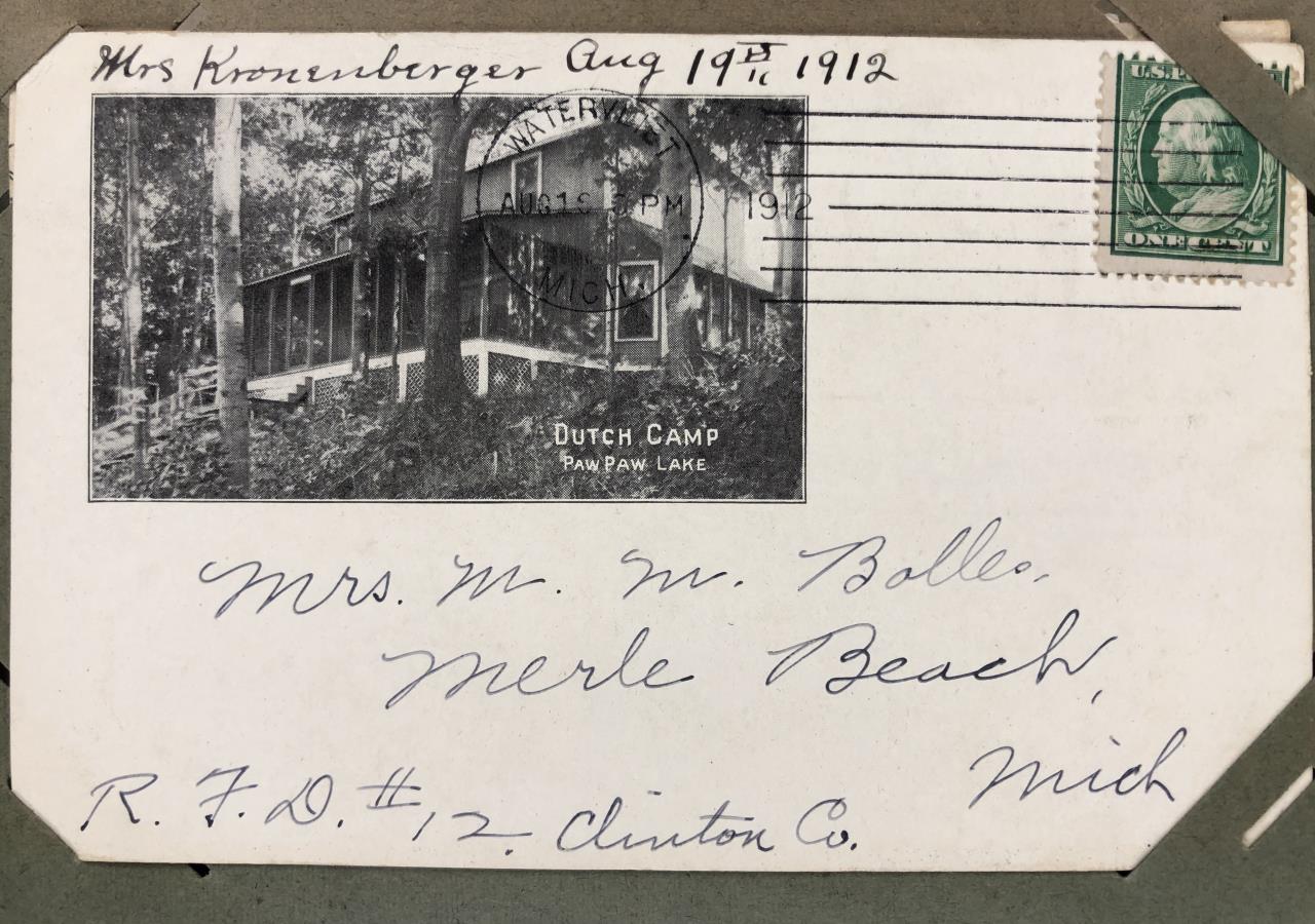 Antique post card album with almost 500 post cards, some real photos, New Year’s, Christmas, Fourth of July, Thanksgiving, Detroit, Grand Ledge, Michigan Agriculture College (Michigan State University), Lansing, Michigan, West Virginia, Ohio, stream ships, Washington D.C., Boston, and many more, circa 1905-1915