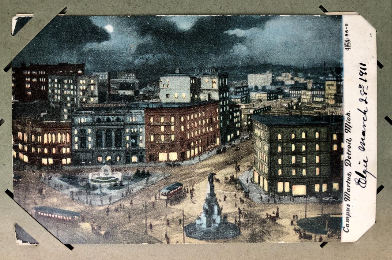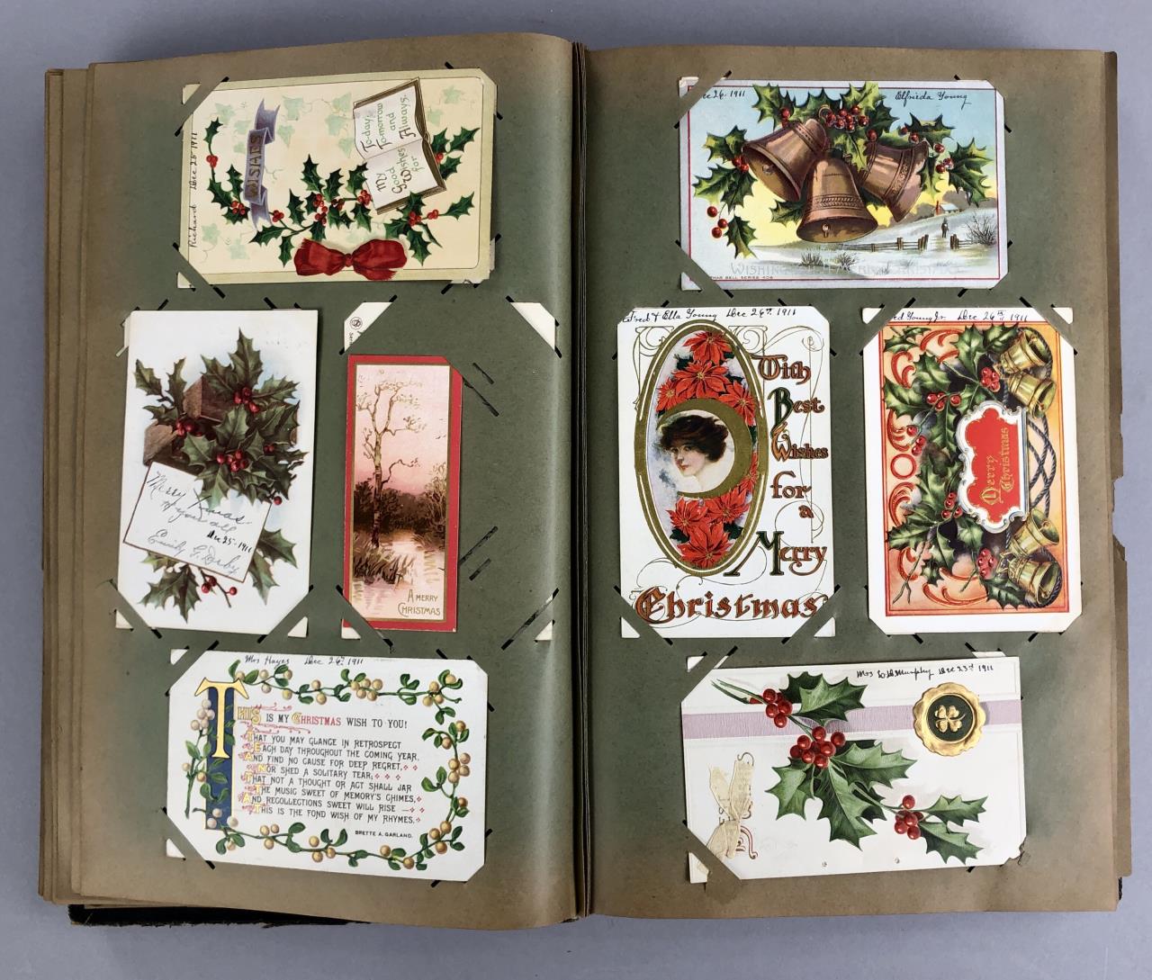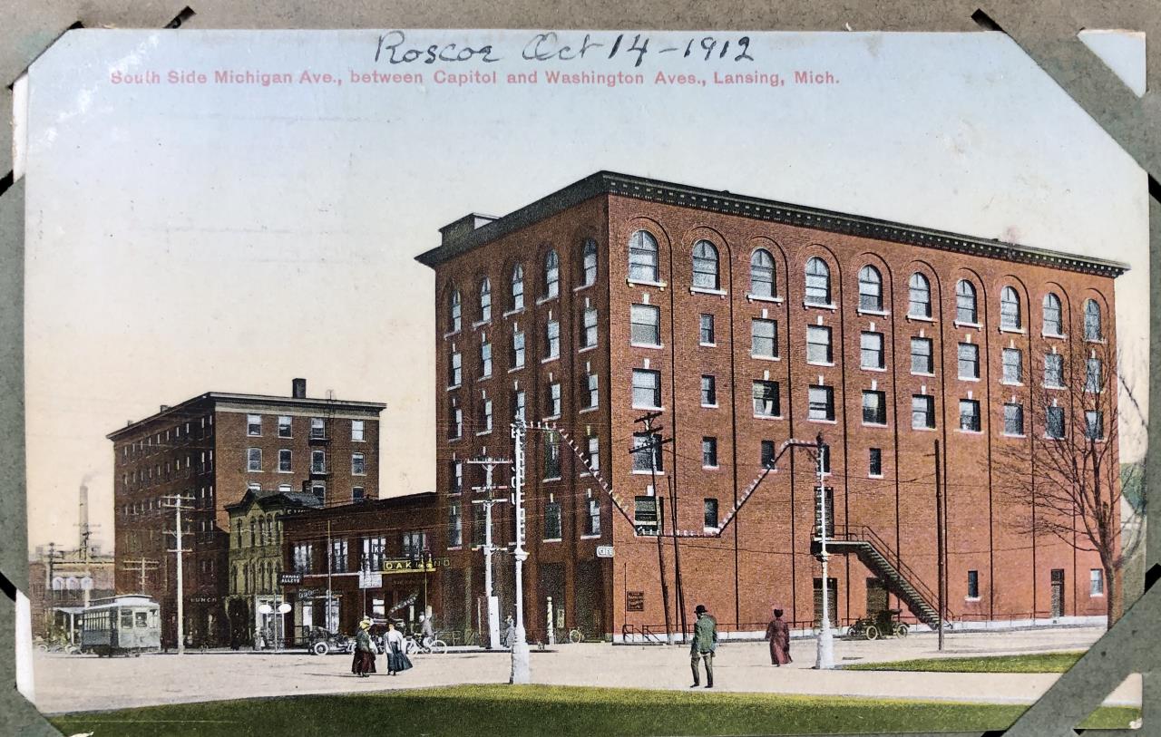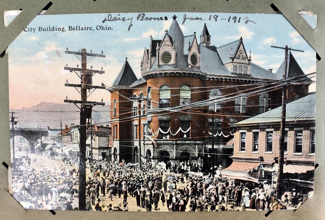 Antique post card album with almost 500 post cards, some real photos, New Year’s, Christmas, Fourth of July, Thanksgiving, Detroit, Grand Ledge, Michigan Agriculture College (Michigan State University), Lansing, Michigan, West Virginia, Ohio, stream ships, Washington D.C., Boston, and many more, circa 1905-1915