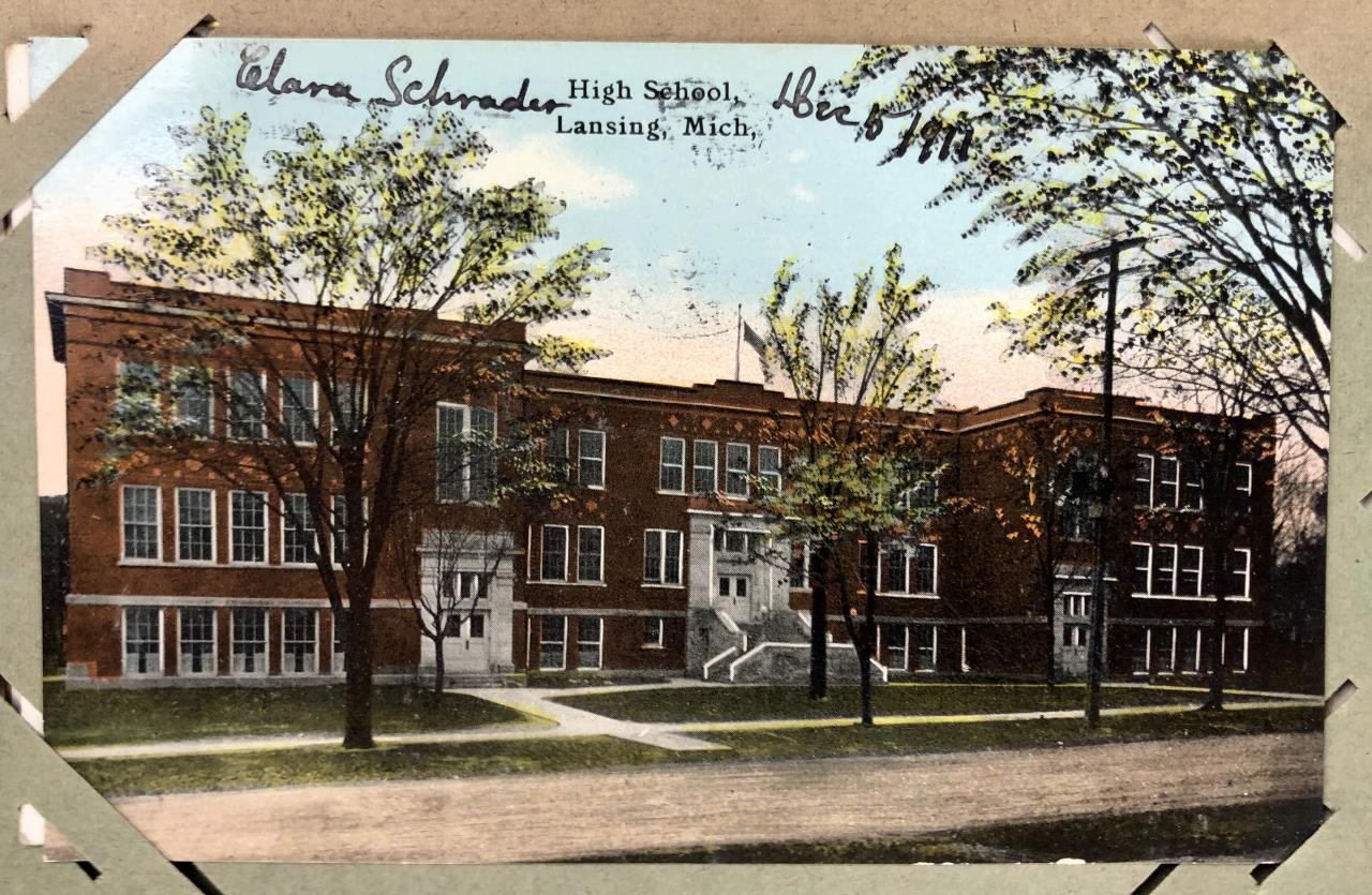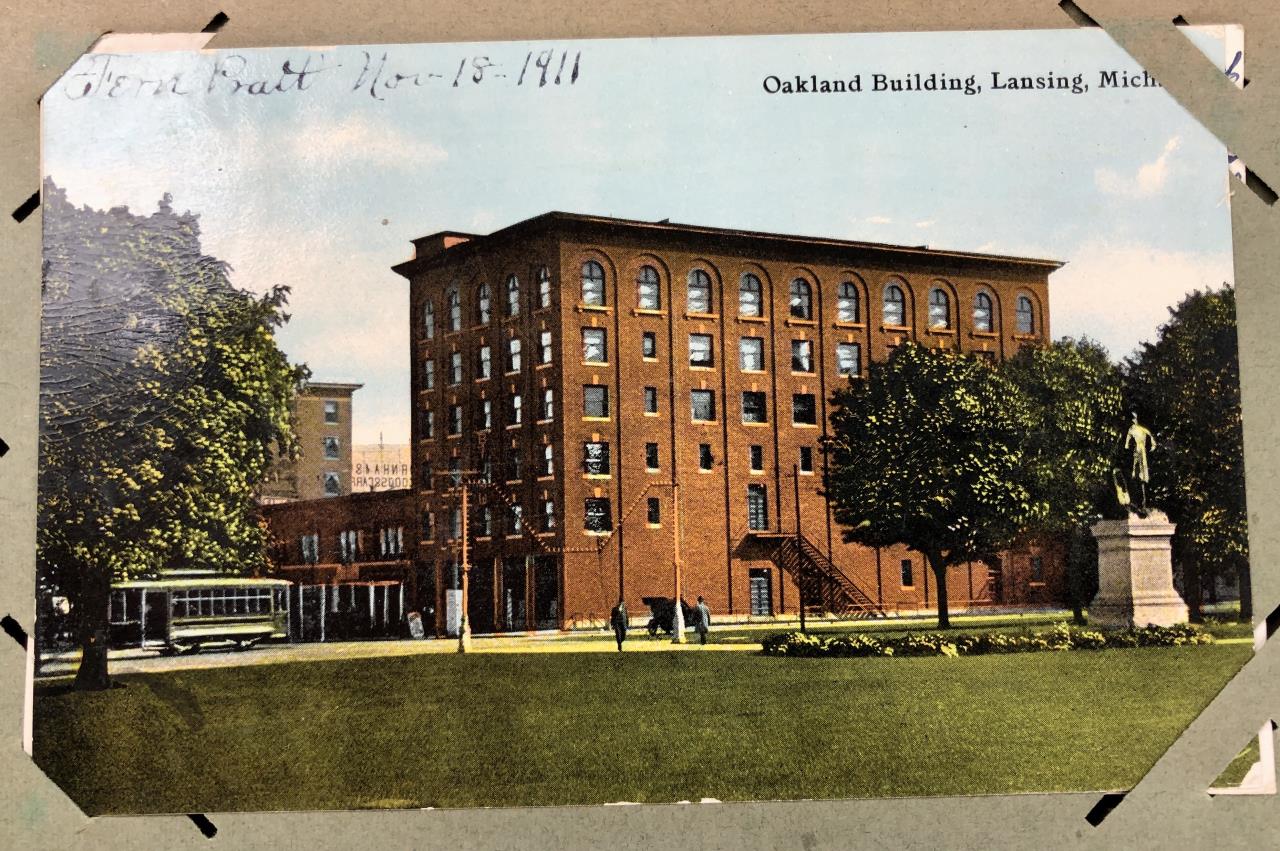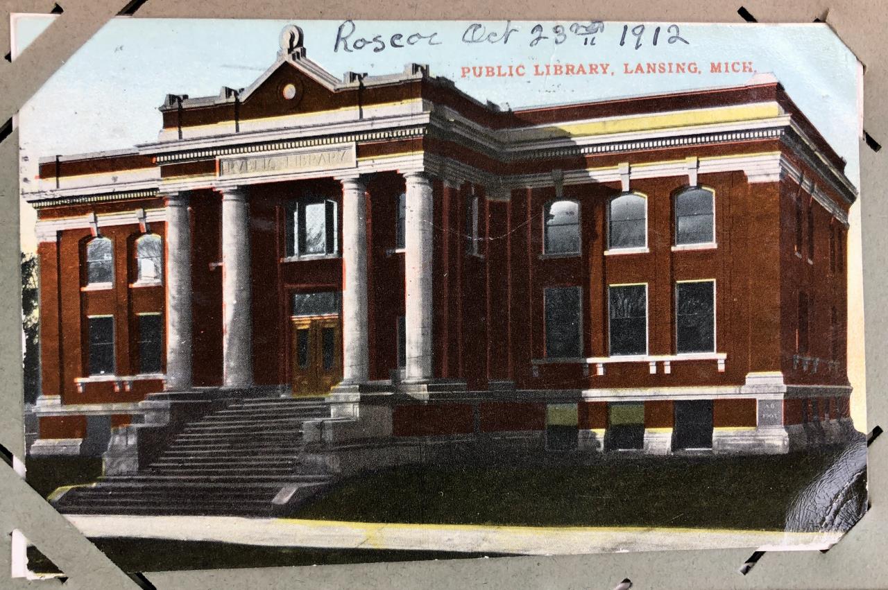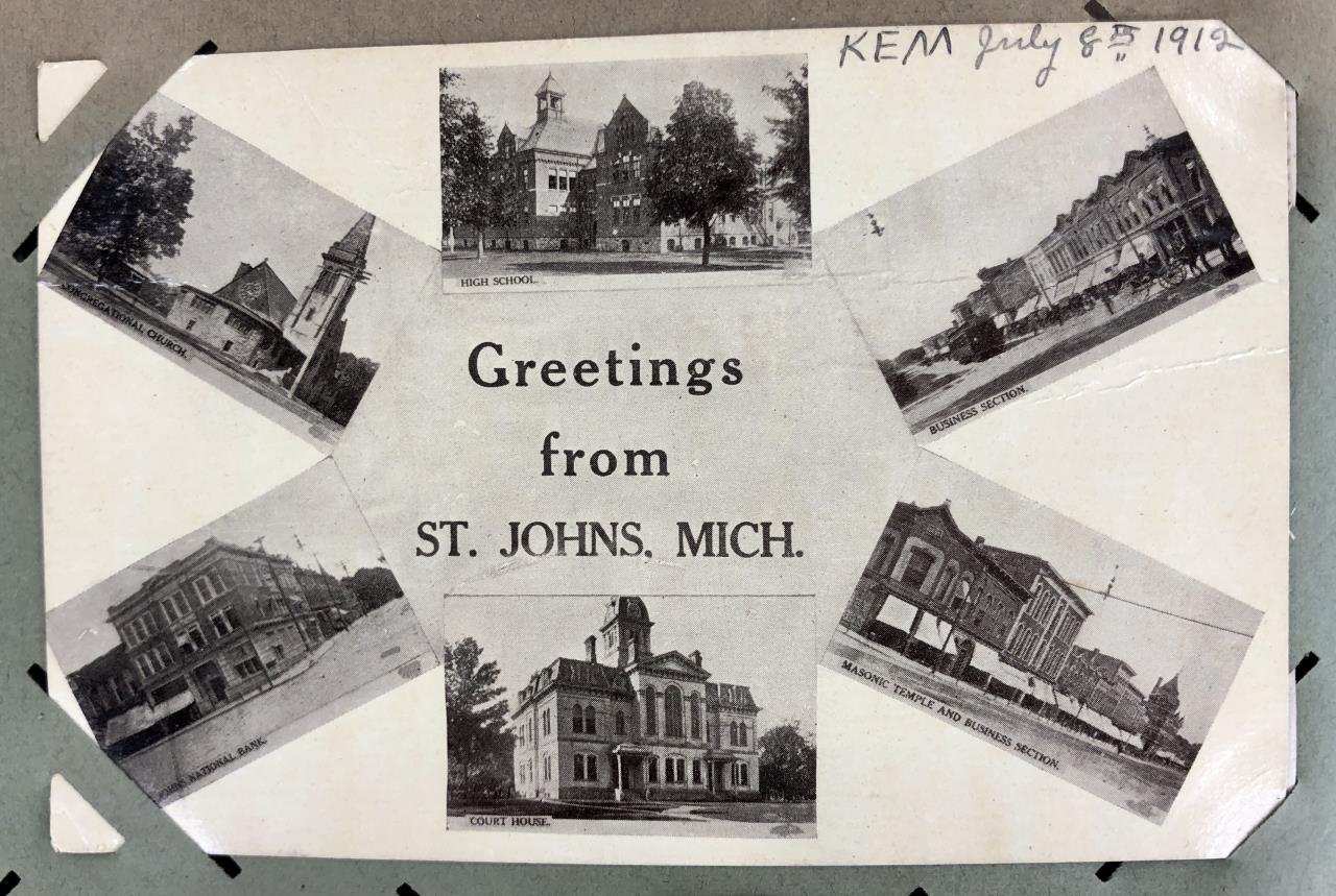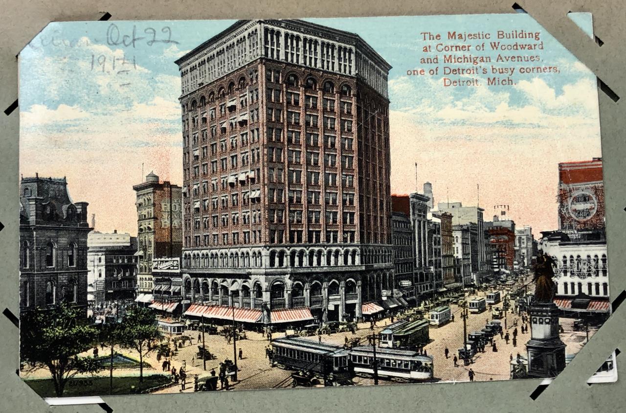 Antique post card album with almost 500 post cards, some real photos, New Year’s, Christmas, Fourth of July, Thanksgiving, Detroit, Grand Ledge, Michigan Agriculture College (Michigan State University), Lansing, Michigan, West Virginia, Ohio, stream ships, Washington D.C., Boston, and many more, circa 1905-1915