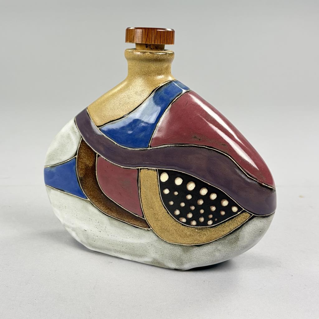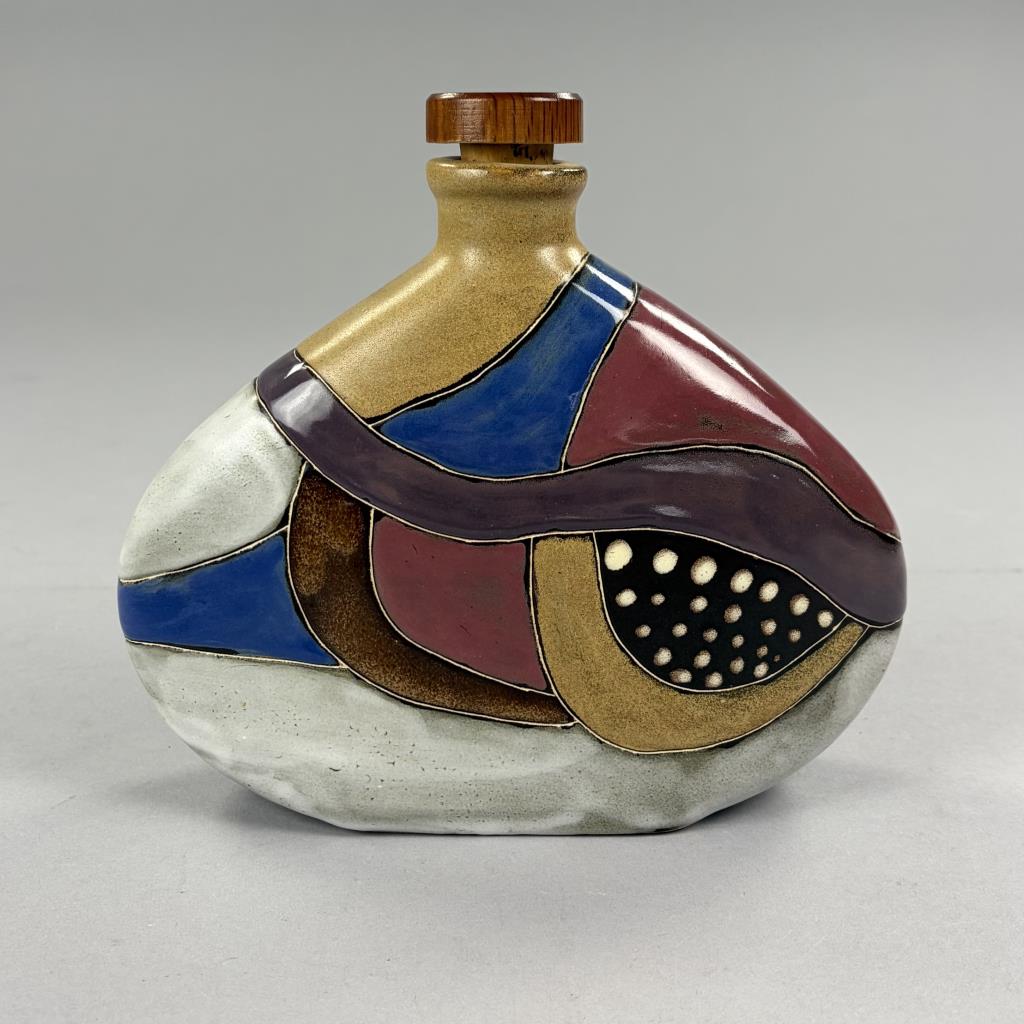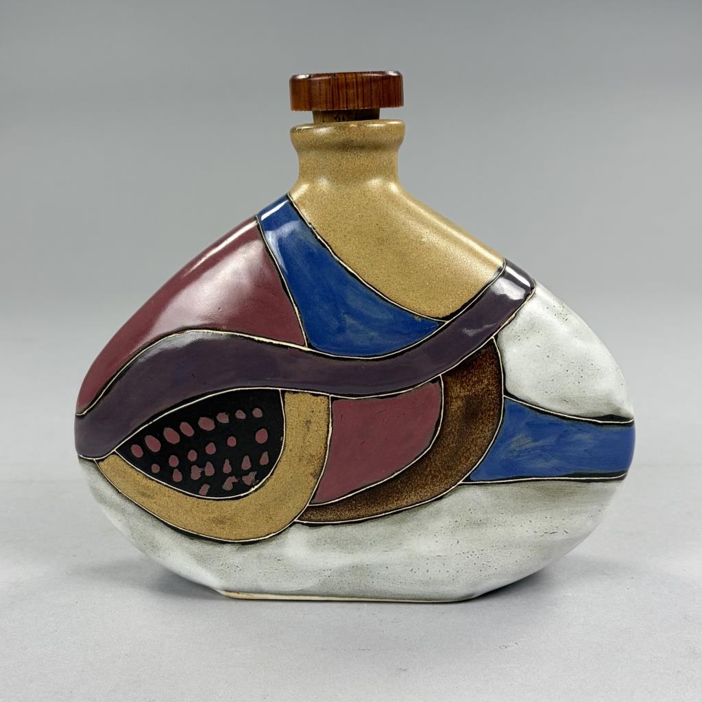Mara of Mexico modernist decanter, in the “Abstract Curves / Colors” pattern, enamel glazed stoneware, 7-3/4″ (H).