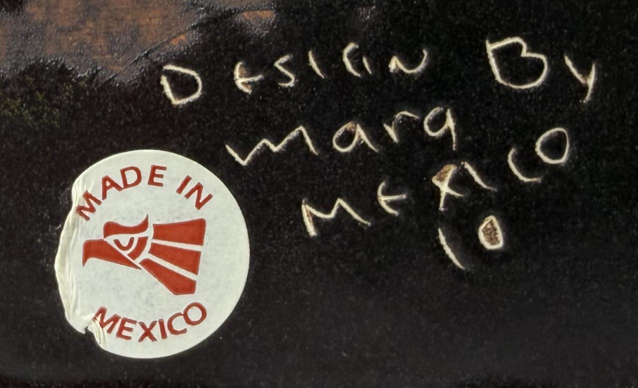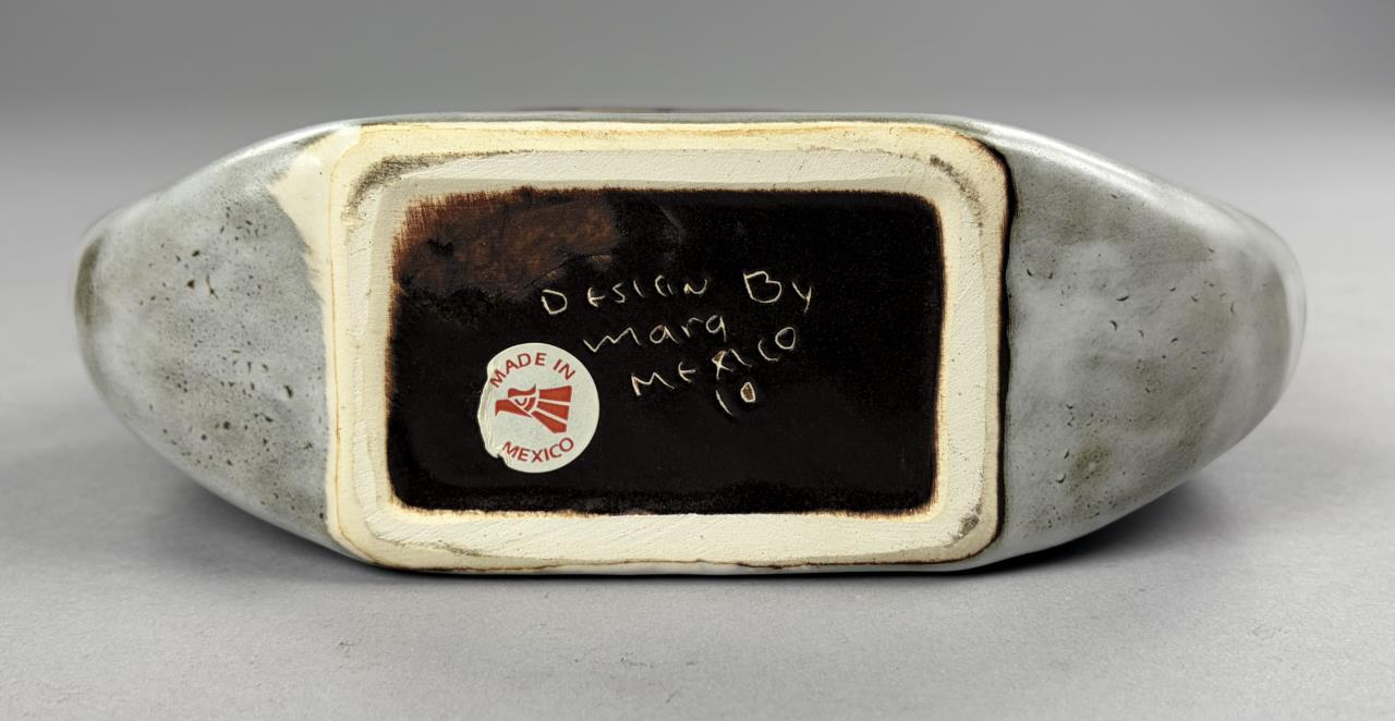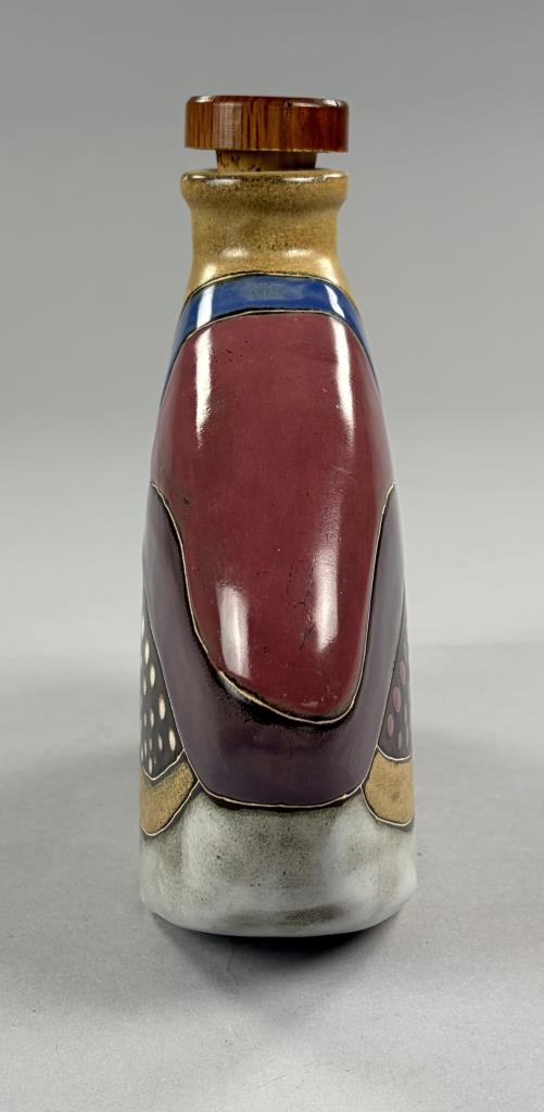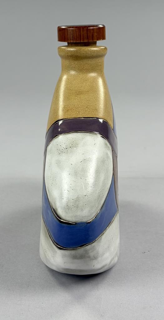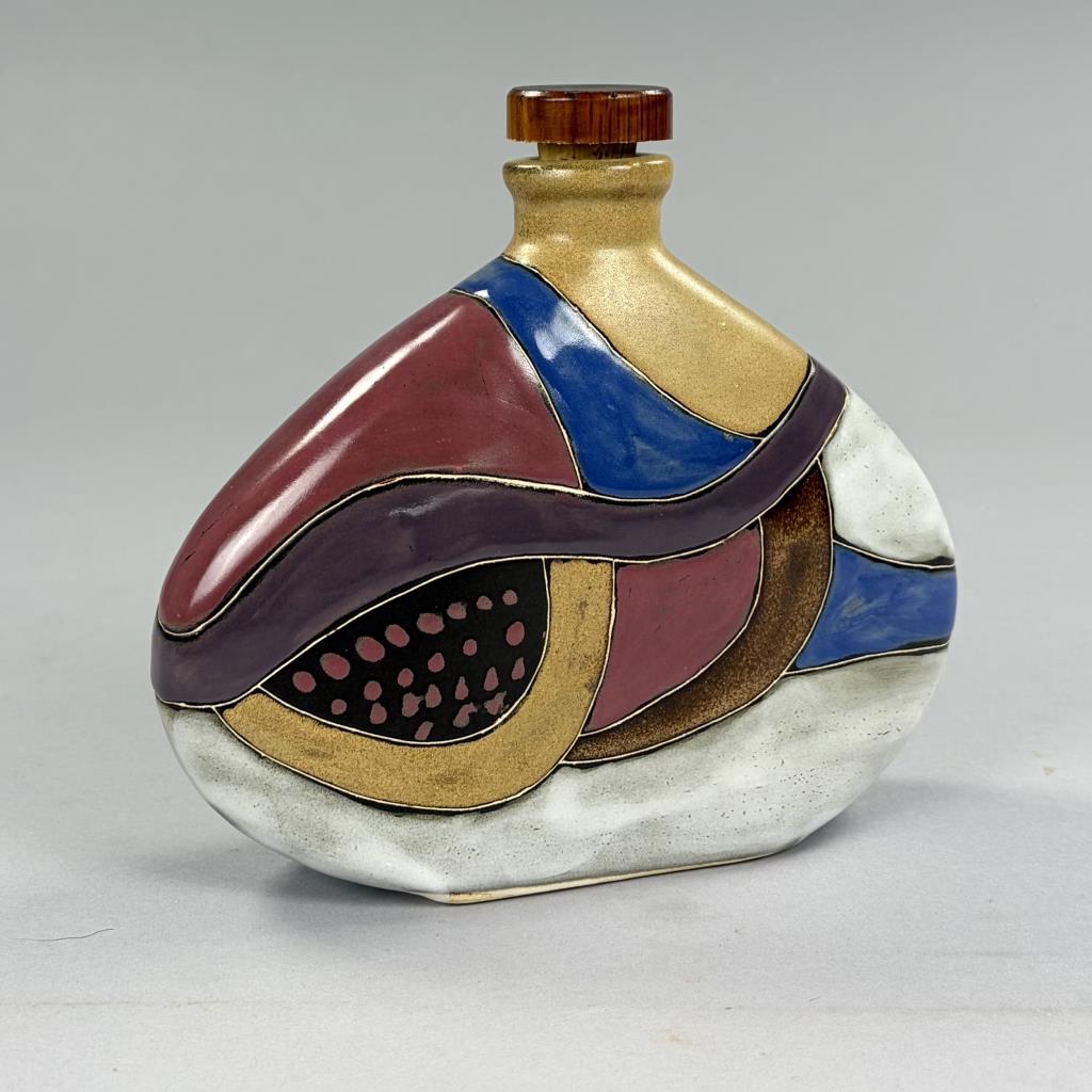 Mara of Mexico modernist decanter, in the “Abstract Curves / Colors” pattern, enamel glazed stoneware, 7-3/4″ (H).