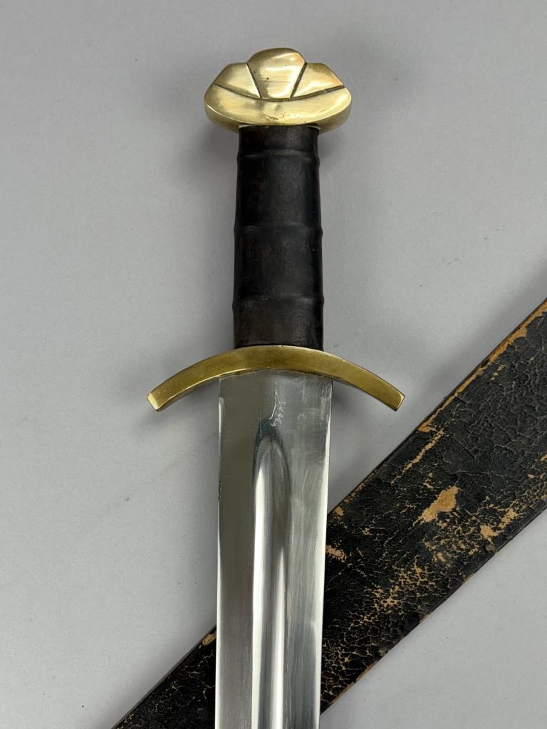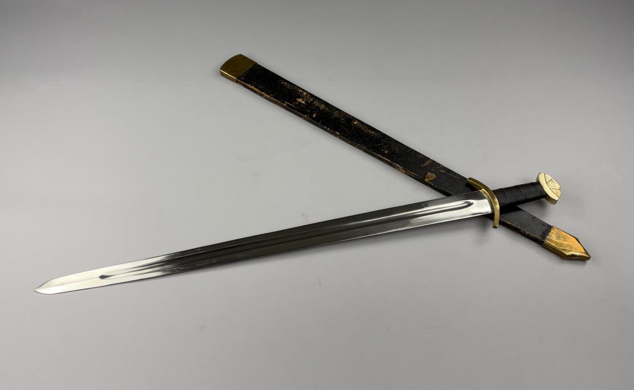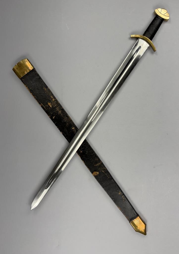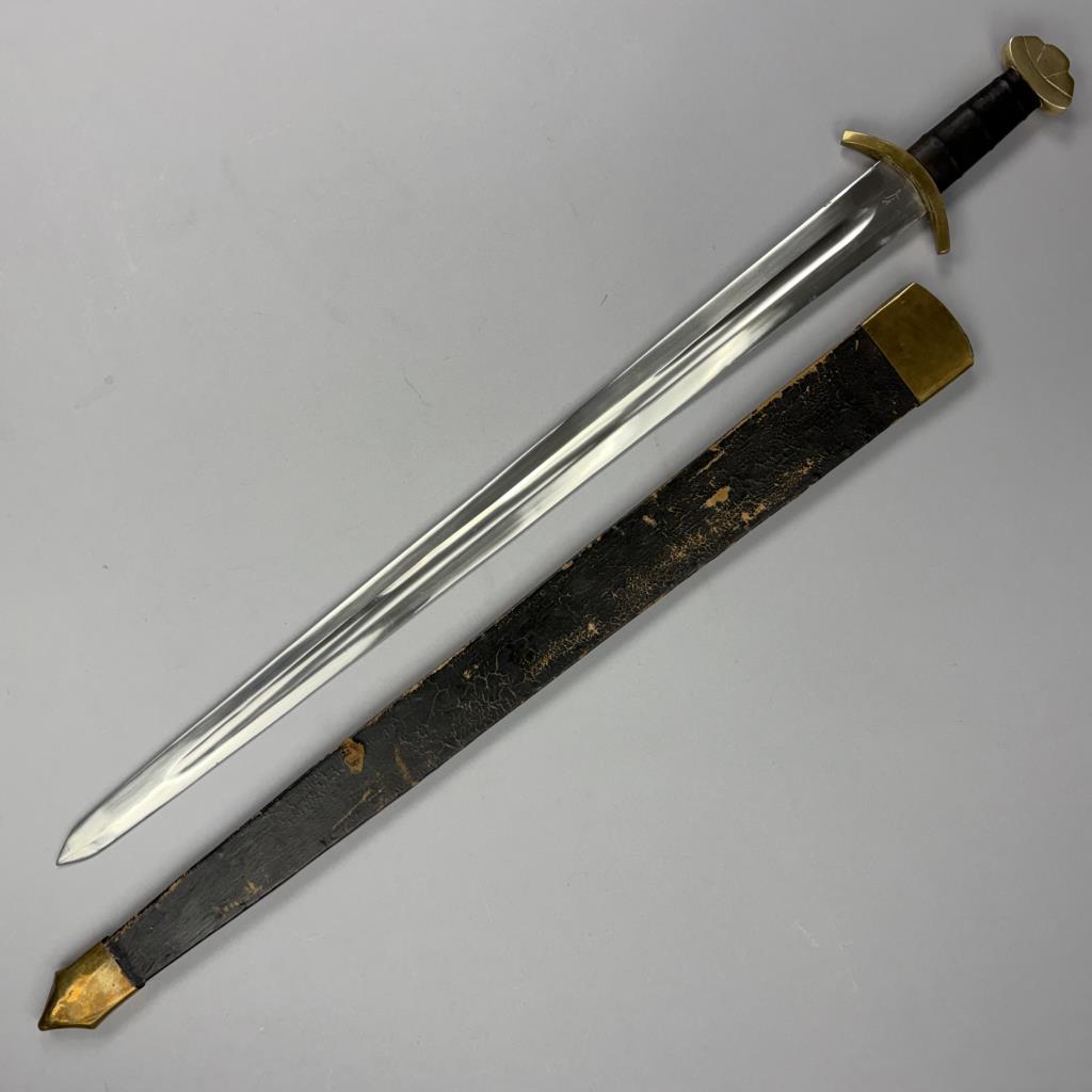Windlass Steelcrafts (India) for Museum Replica Limited (Conyers, Georgia), high carbon steel three lobe pommel Viking style sword, marked on underside of guard, with peened handle, likely hand-hammered blade (30-9/16″ L), with leather scabbard, circa mid 20th Century, total length 37-1/2″ (including scabbard).