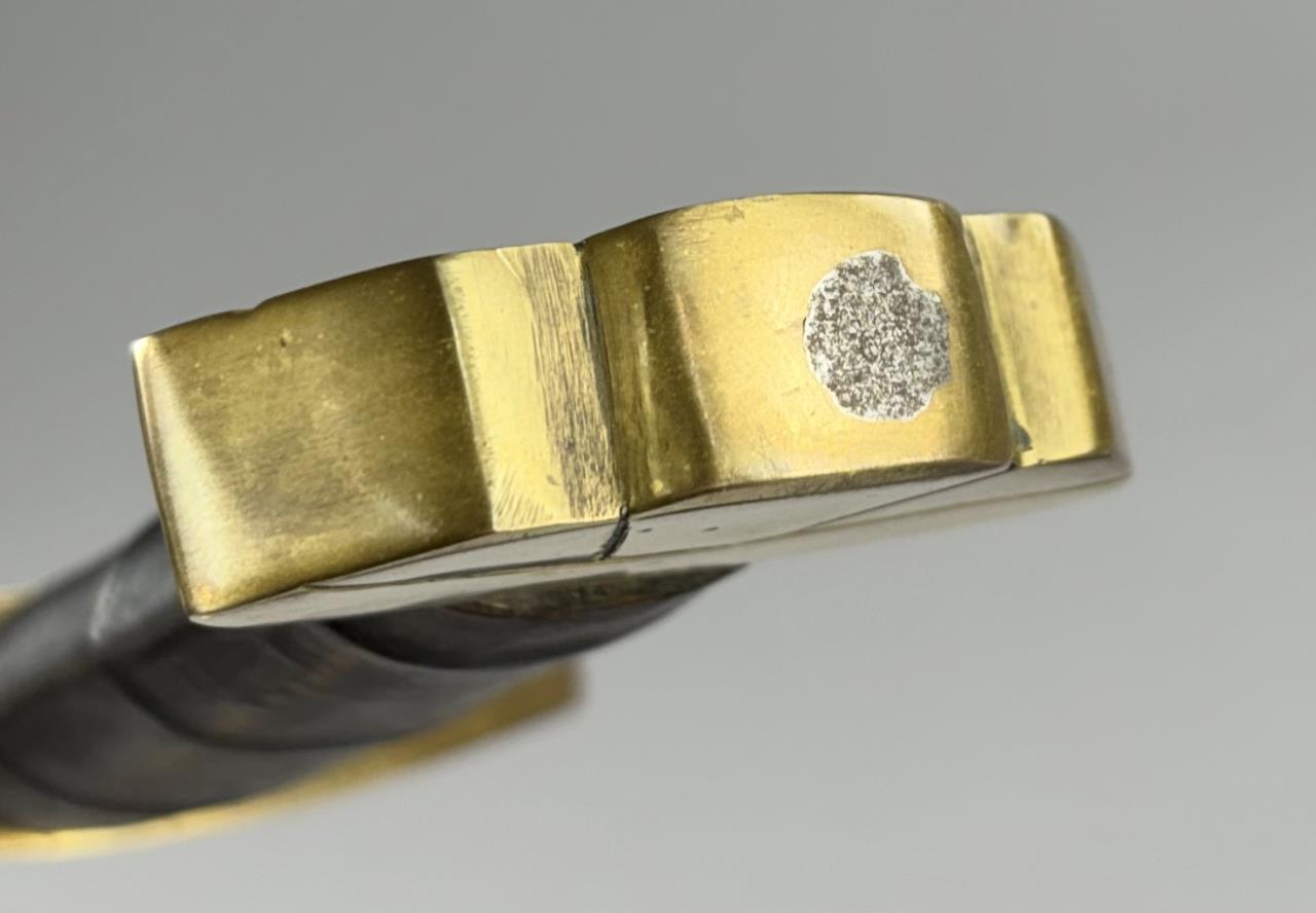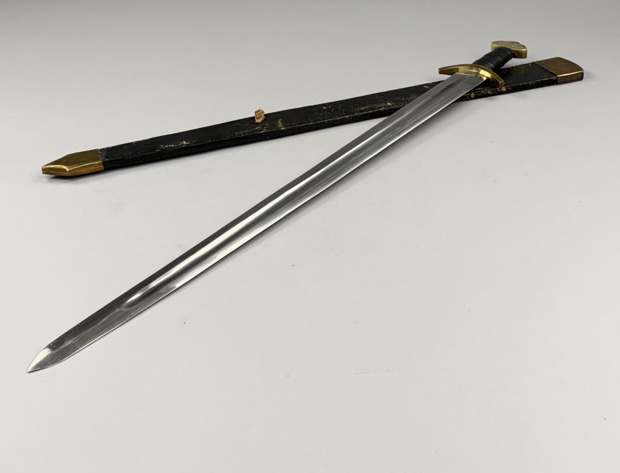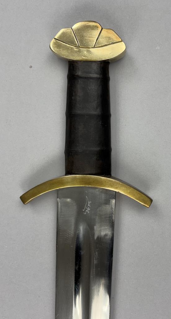 Windlass Steelcrafts (India) for Museum Replica Limited (Conyers, Georgia), high carbon steel three lobe pommel Viking style sword, marked on underside of guard, with peened handle, likely hand-hammered blade (30-9/16″ L), with leather scabbard, circa mid 20th Century, total length 37-1/2″ (including scabbard).