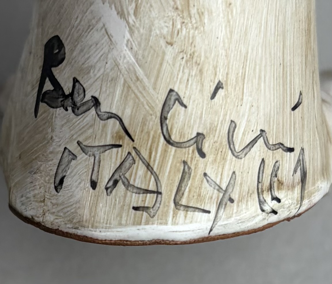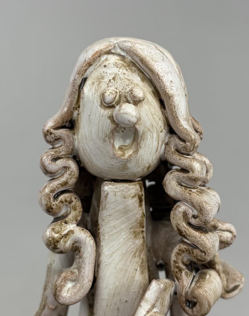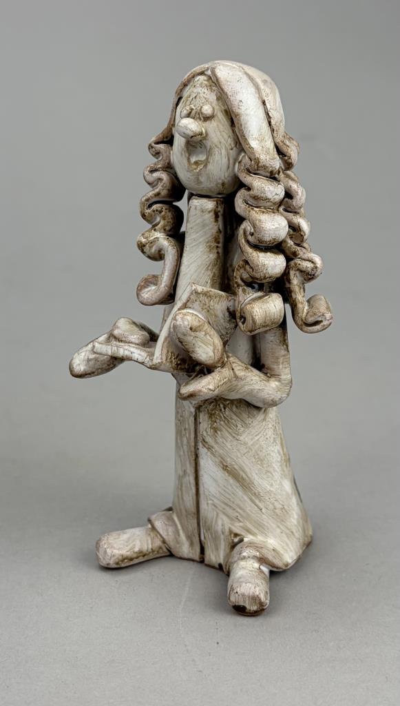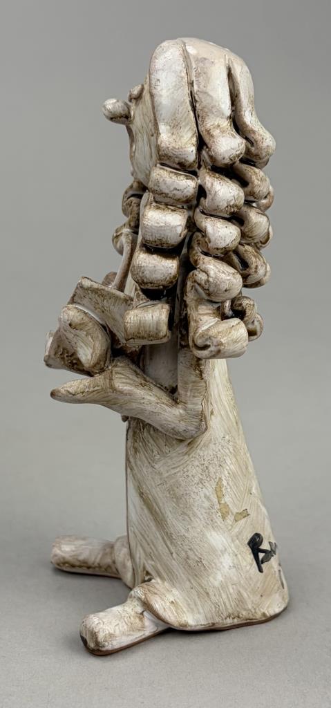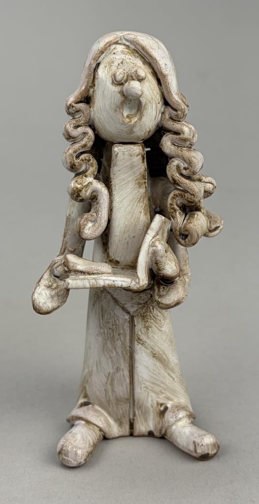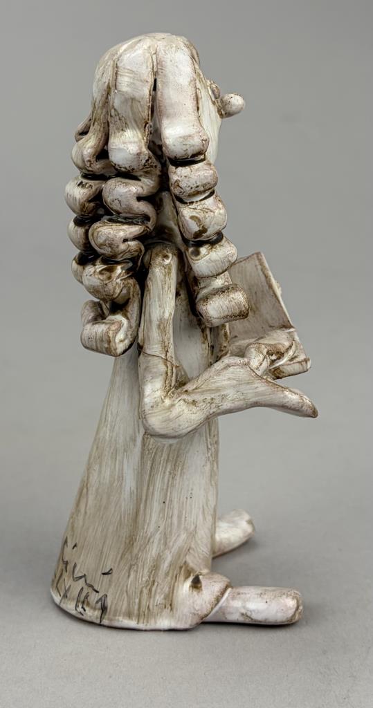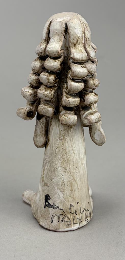 Dino Bencini (Italian, b. 1935) hand sculptured figure of a wigged barrister, glazed ceramic, signed on back, circa 1960s / 1970s, 5″ (H).