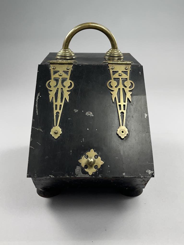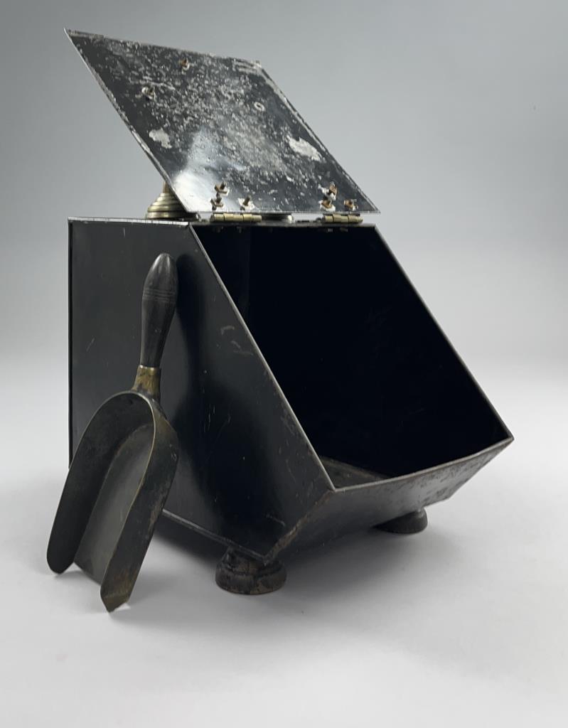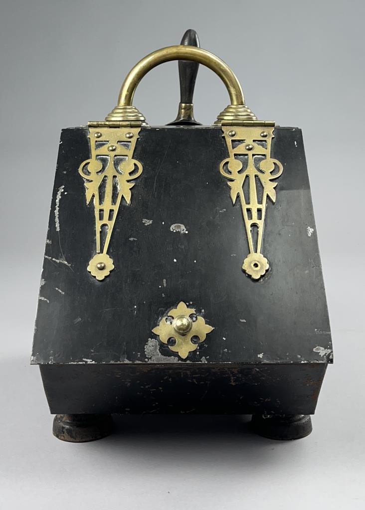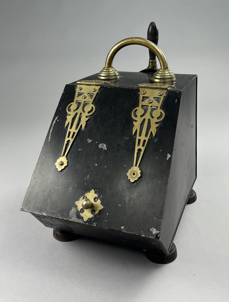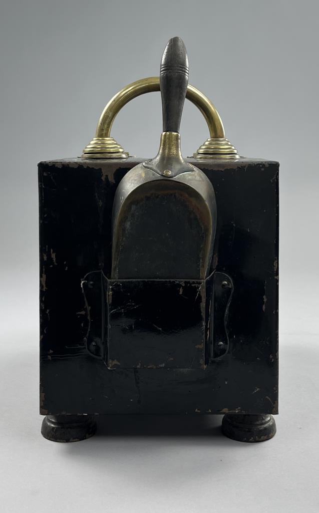 Antique, Victorian Era, coal scuttle or coal hod, painted metal and brass, with brass and wood shovel, late 19th / early 20th Century.