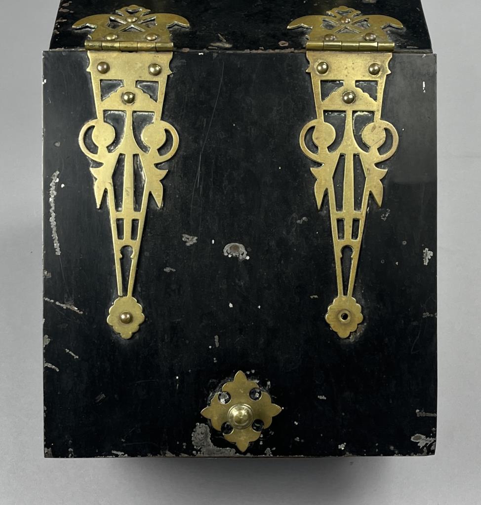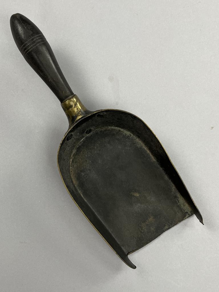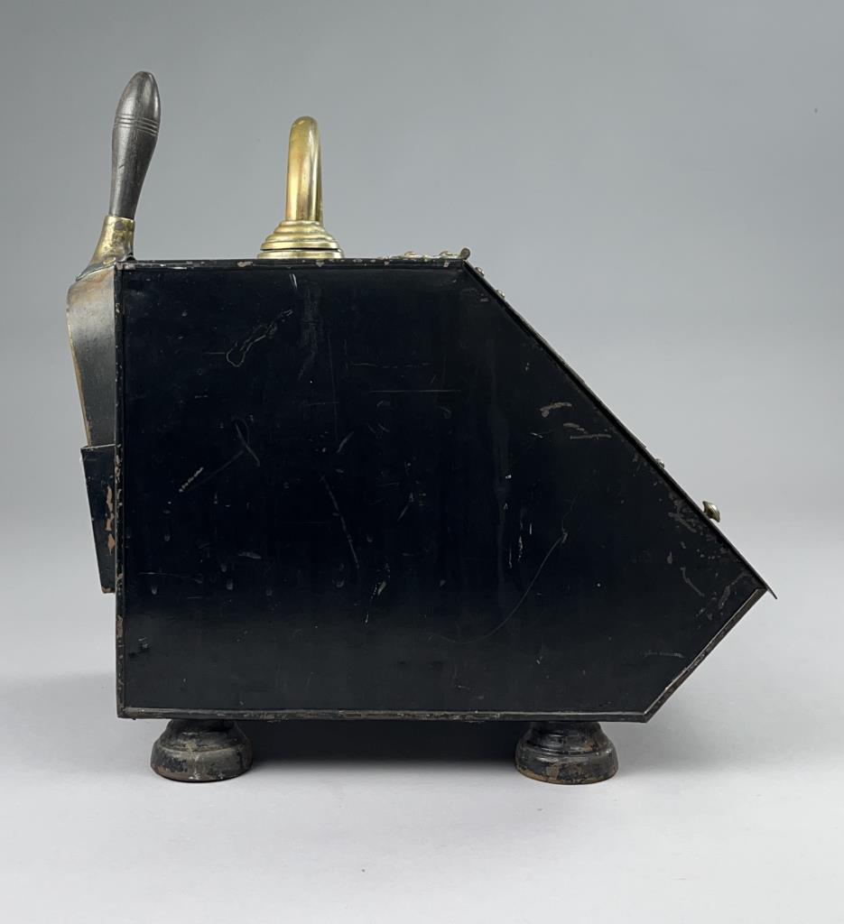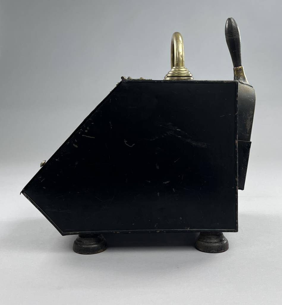 Antique, Victorian Era, coal scuttle or coal hod, painted metal and brass, with brass and wood shovel, late 19th / early 20th Century.