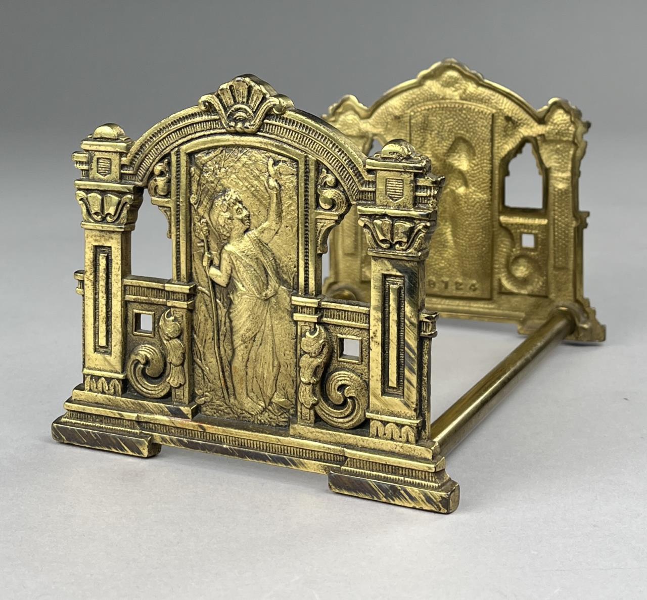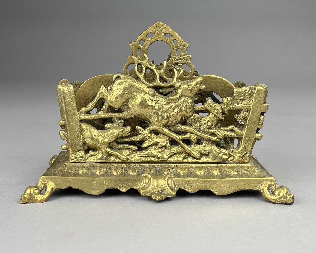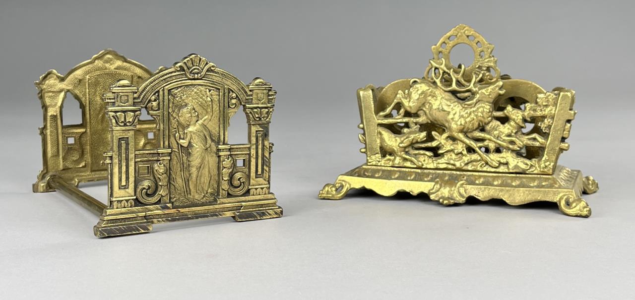 Adjustable sliding cast brass book rack depicting a child with a bird and letter holder depicting an elk and dog.