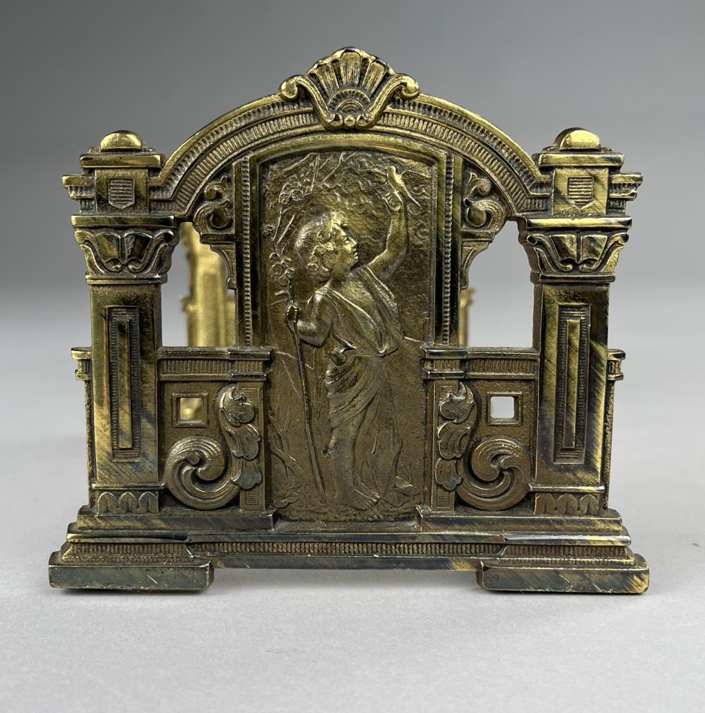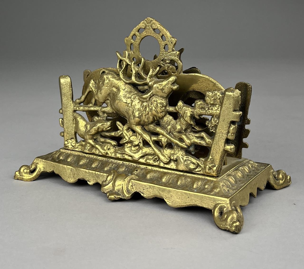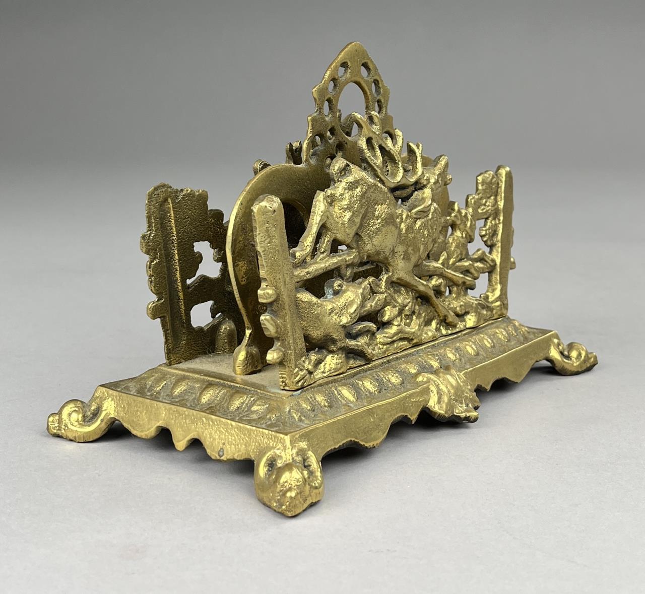 Adjustable sliding cast brass book rack depicting a child with a bird and letter holder depicting an elk and dog.