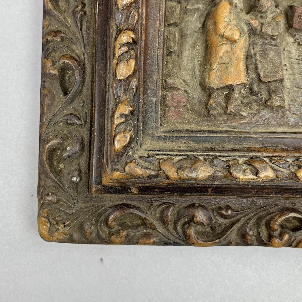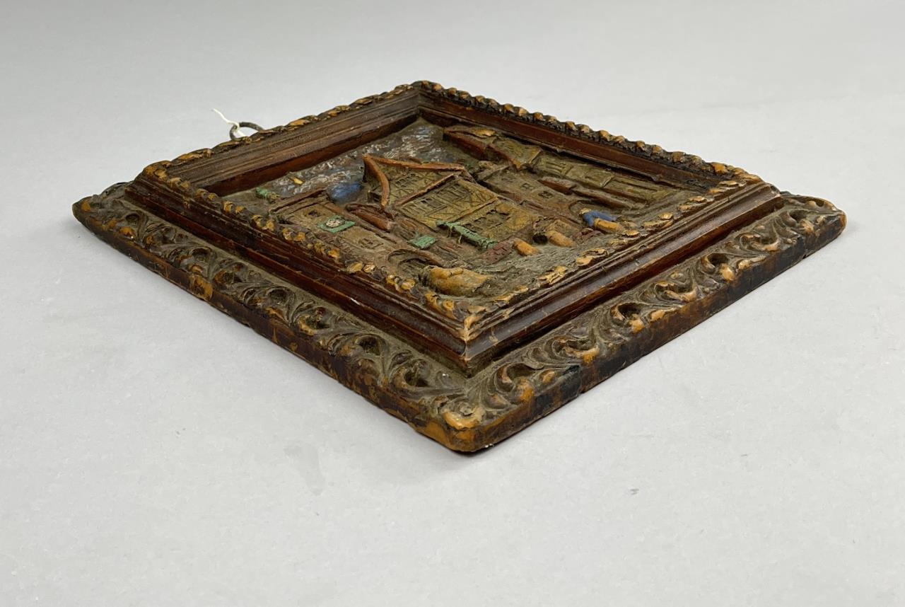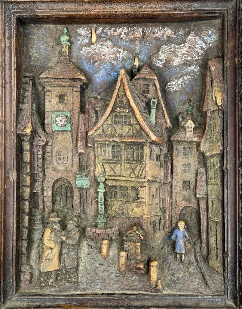 German hand painted beeswax relief wall plaque, depicting Rothenburg ob der Tauber, circa mid 20th Century, 13-1/8″ x 11″ x 1-1/2″.
