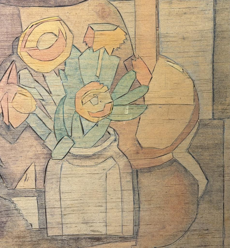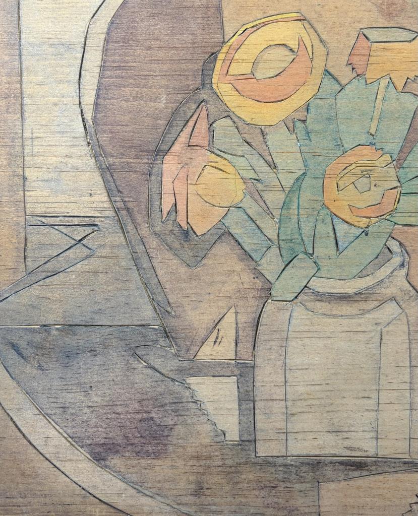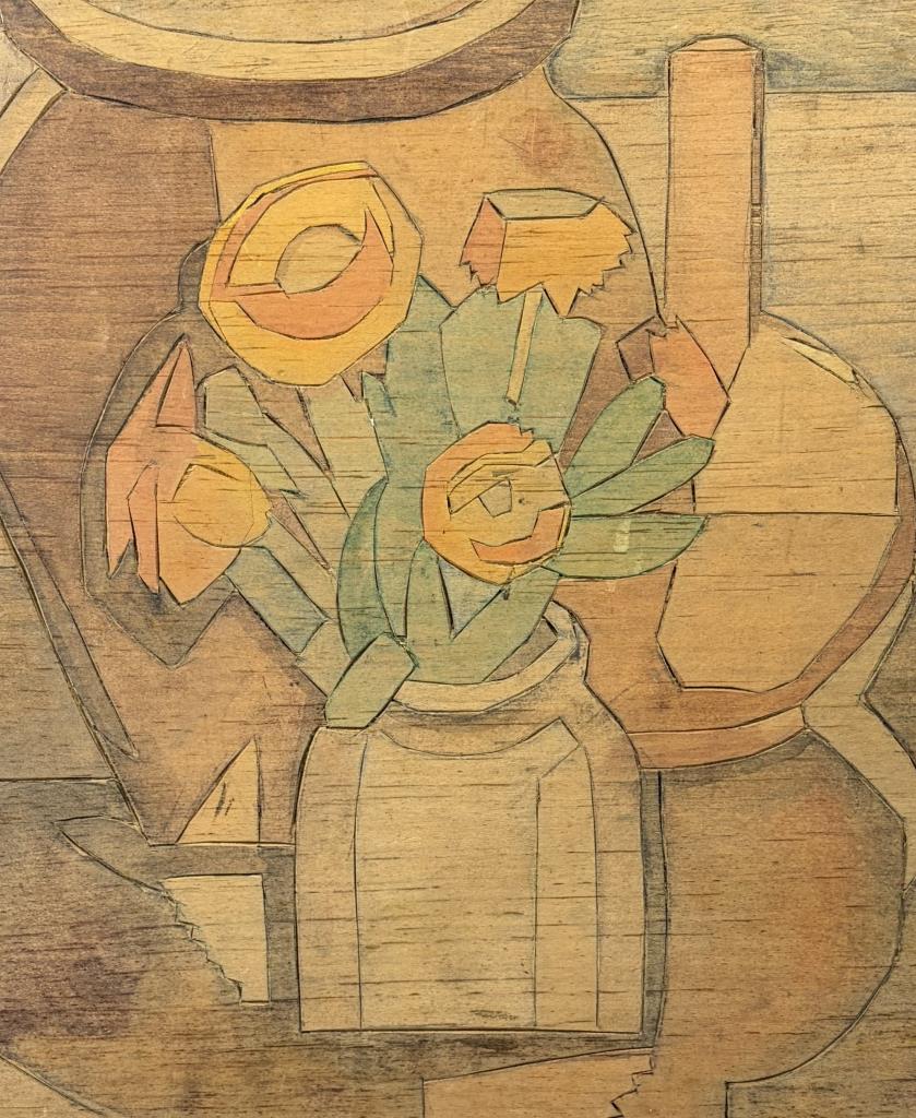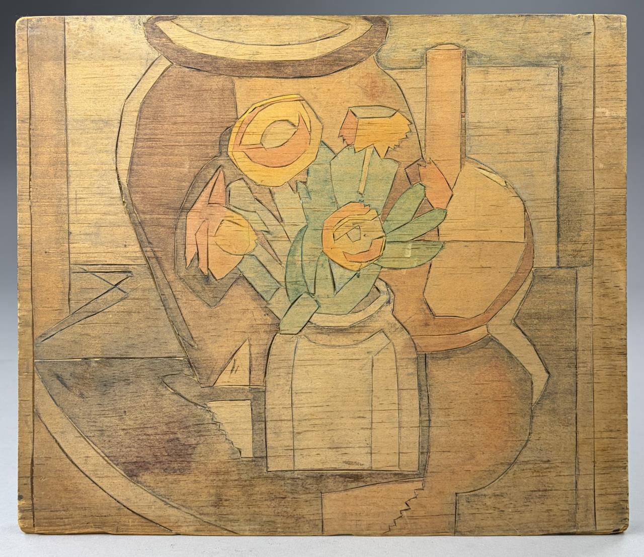 Attributed to Flora Itwin Schofield (also known as Flora Schoenfeld) (American, 1871-1960), double-sided carved wood block, one side with a floral still life and the other with a female nude, Provincetown style carved white line woodblock painted in color inks, early 20th Century, 11-7/8″ x 14″.