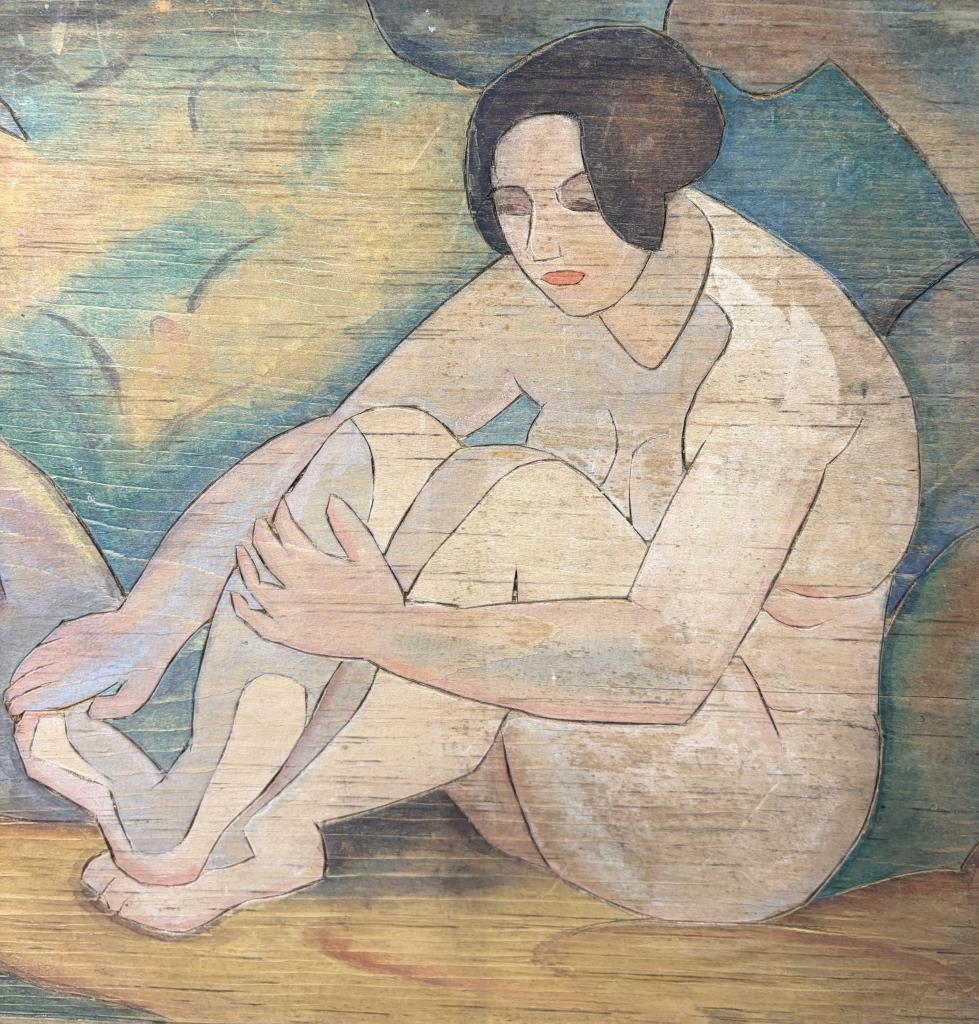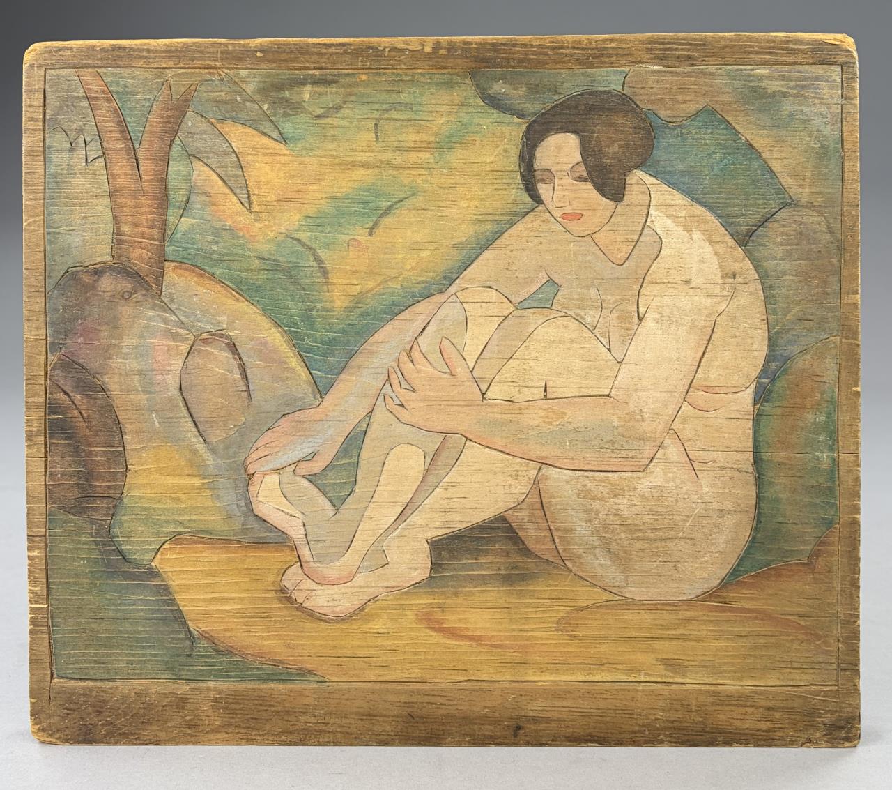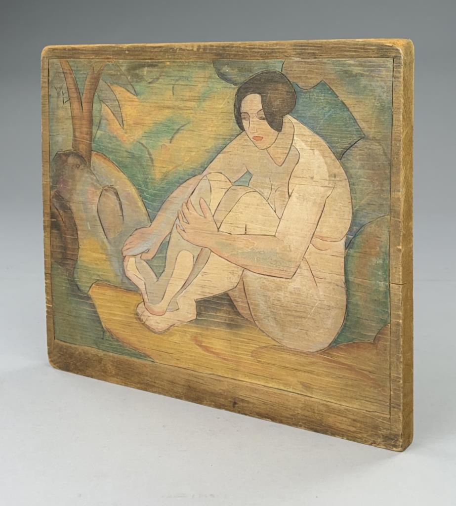 Attributed to Flora Itwin Schofield (also known as Flora Schoenfeld) (American, 1871-1960), double-sided carved wood block, one side with a floral still life and the other with a female nude, Provincetown style carved white line woodblock painted in color inks, early 20th Century, 11-7/8″ x 14″.