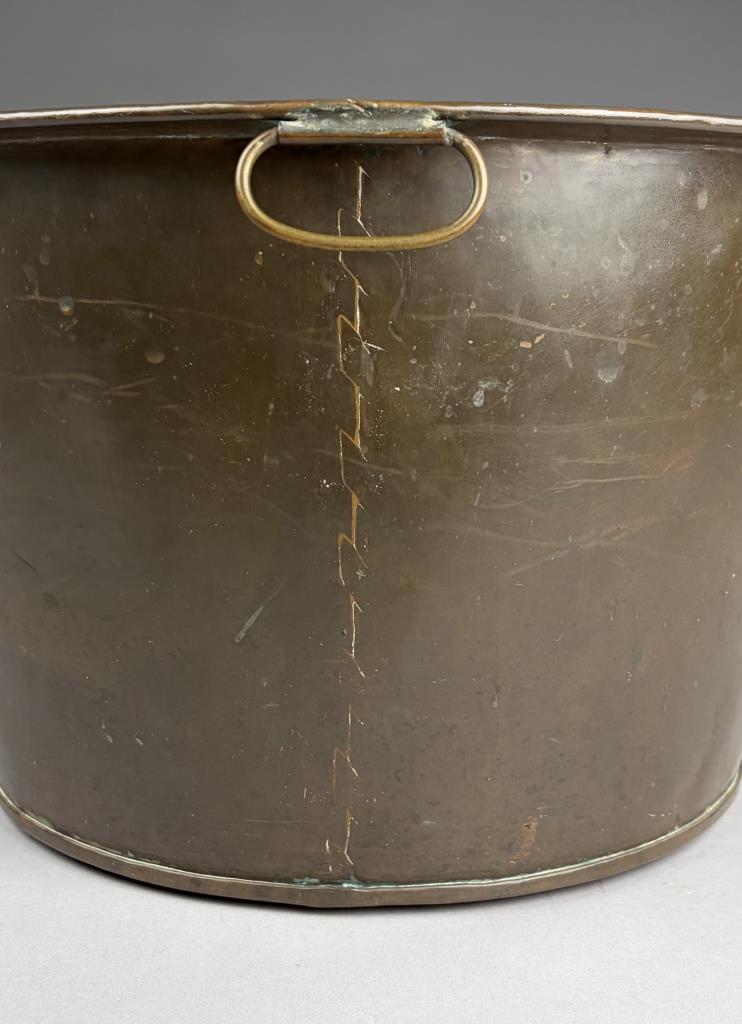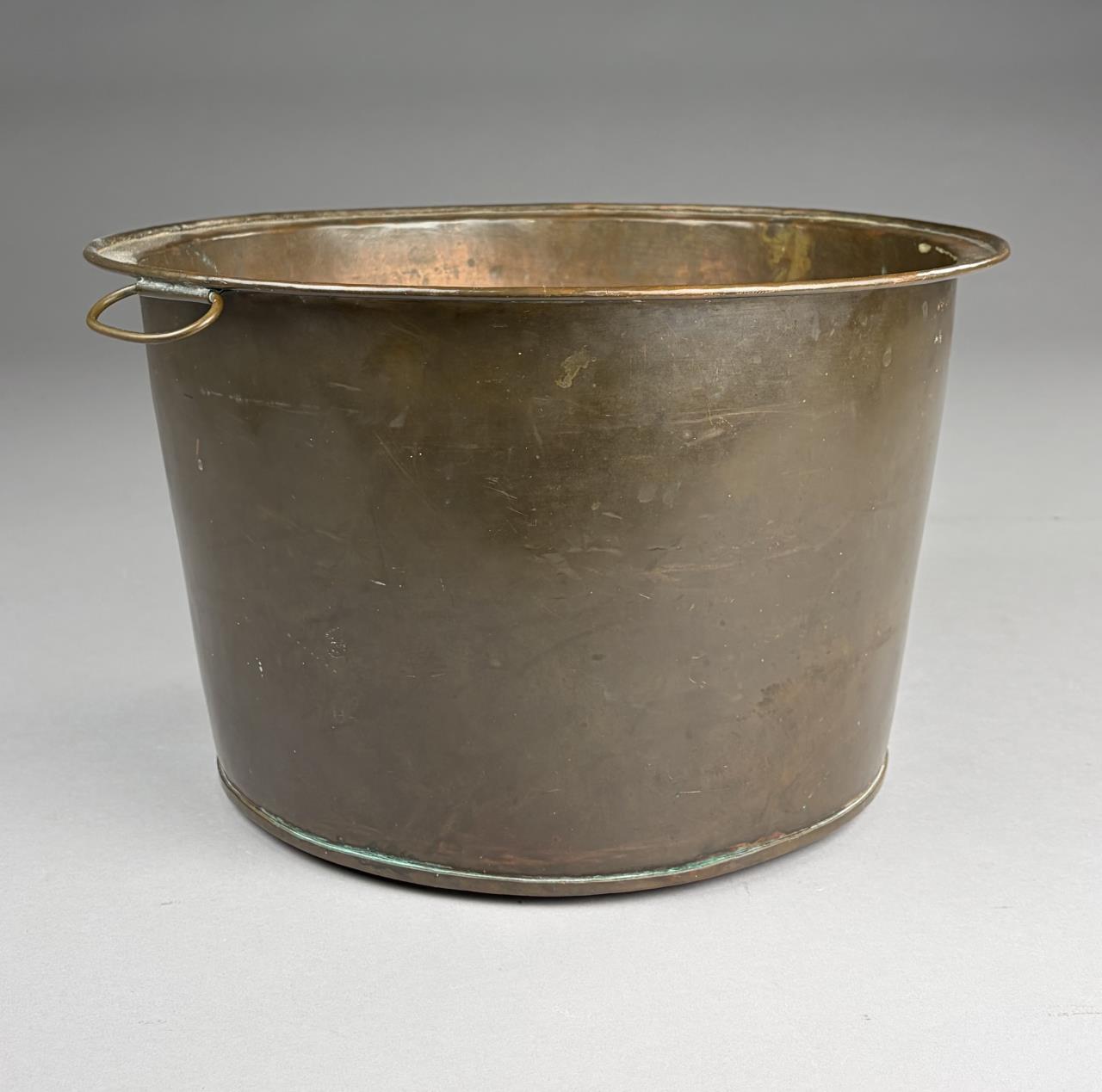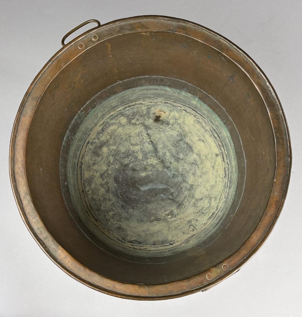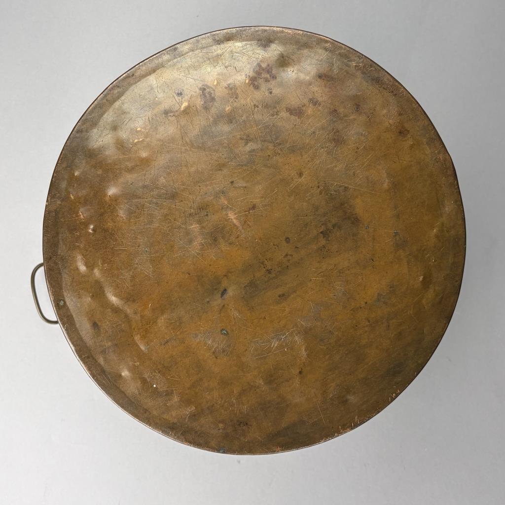 Antique hand hammered copper pot, with two organic leaf-form rivetted movable loop handles and dog-tooth seam construction, 14″ (D) 8-1/2″ (H)