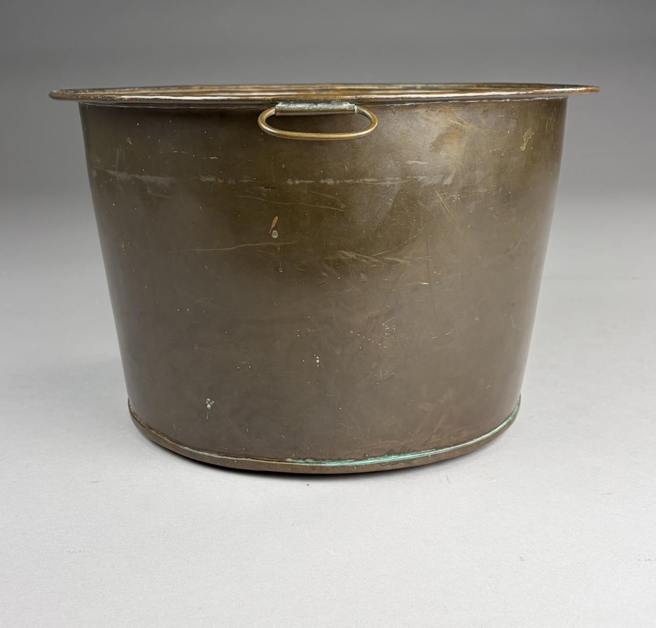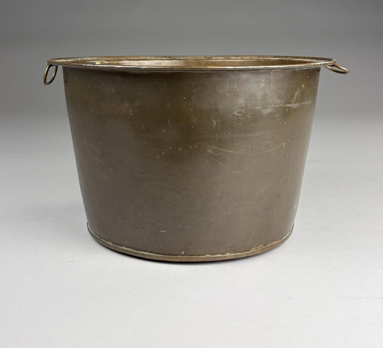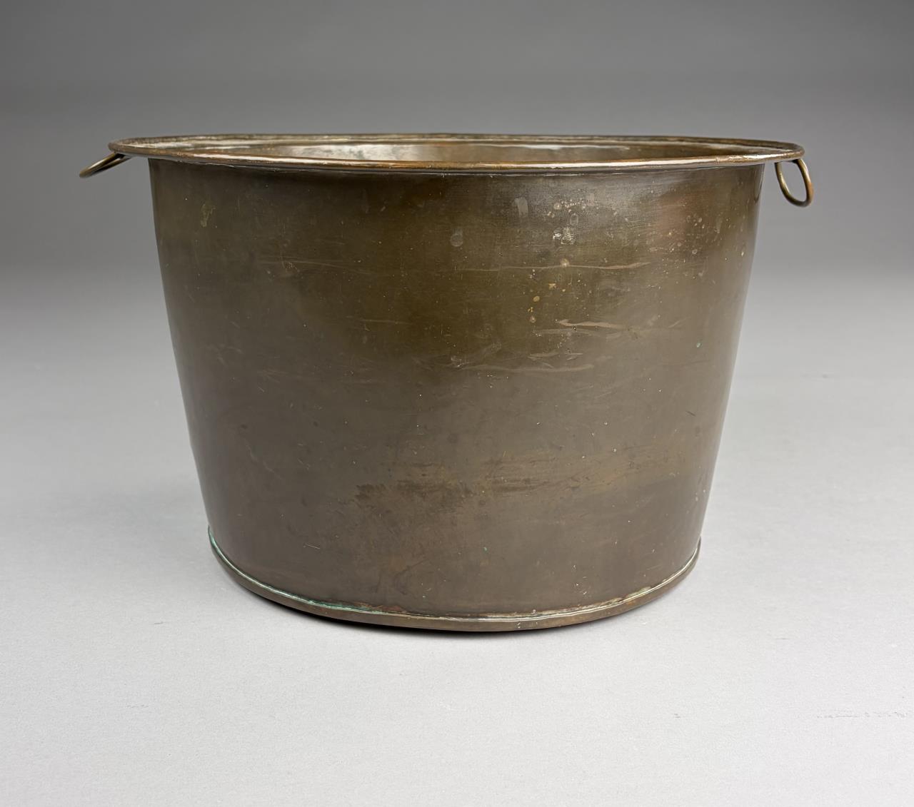 Antique hand hammered copper pot, with two organic leaf-form rivetted movable loop handles and dog-tooth seam construction, 14″ (D) 8-1/2″ (H)