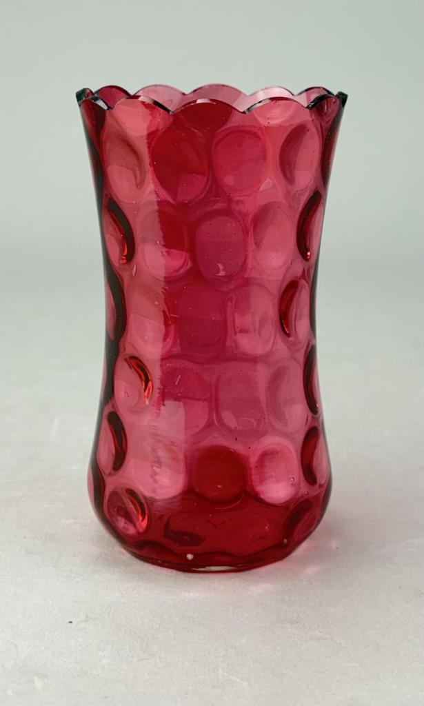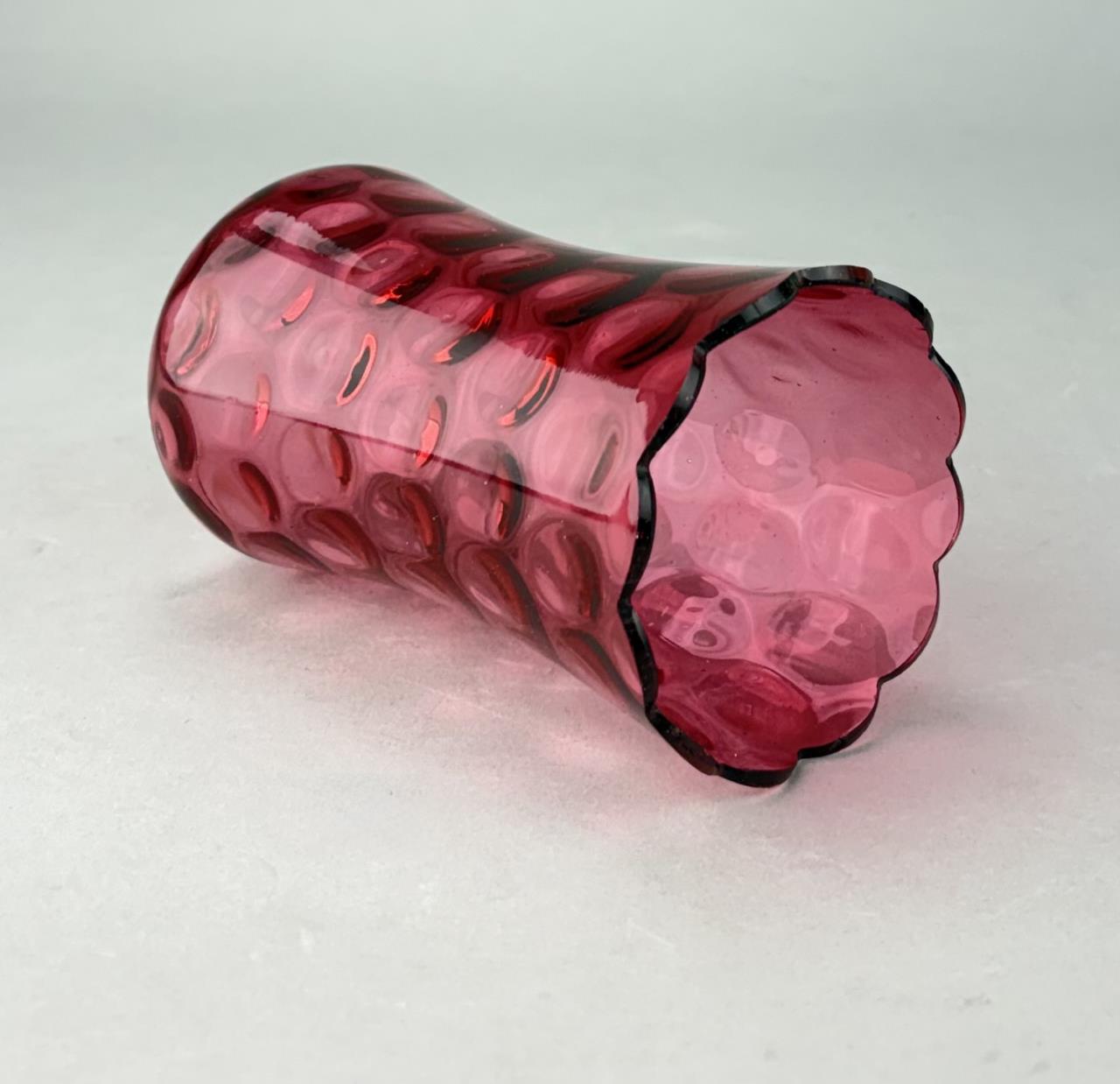 Antique cranberry or ruby thumbprint glass vase with a ruffled or scalloped rim, 6″ (H), Victorian Era